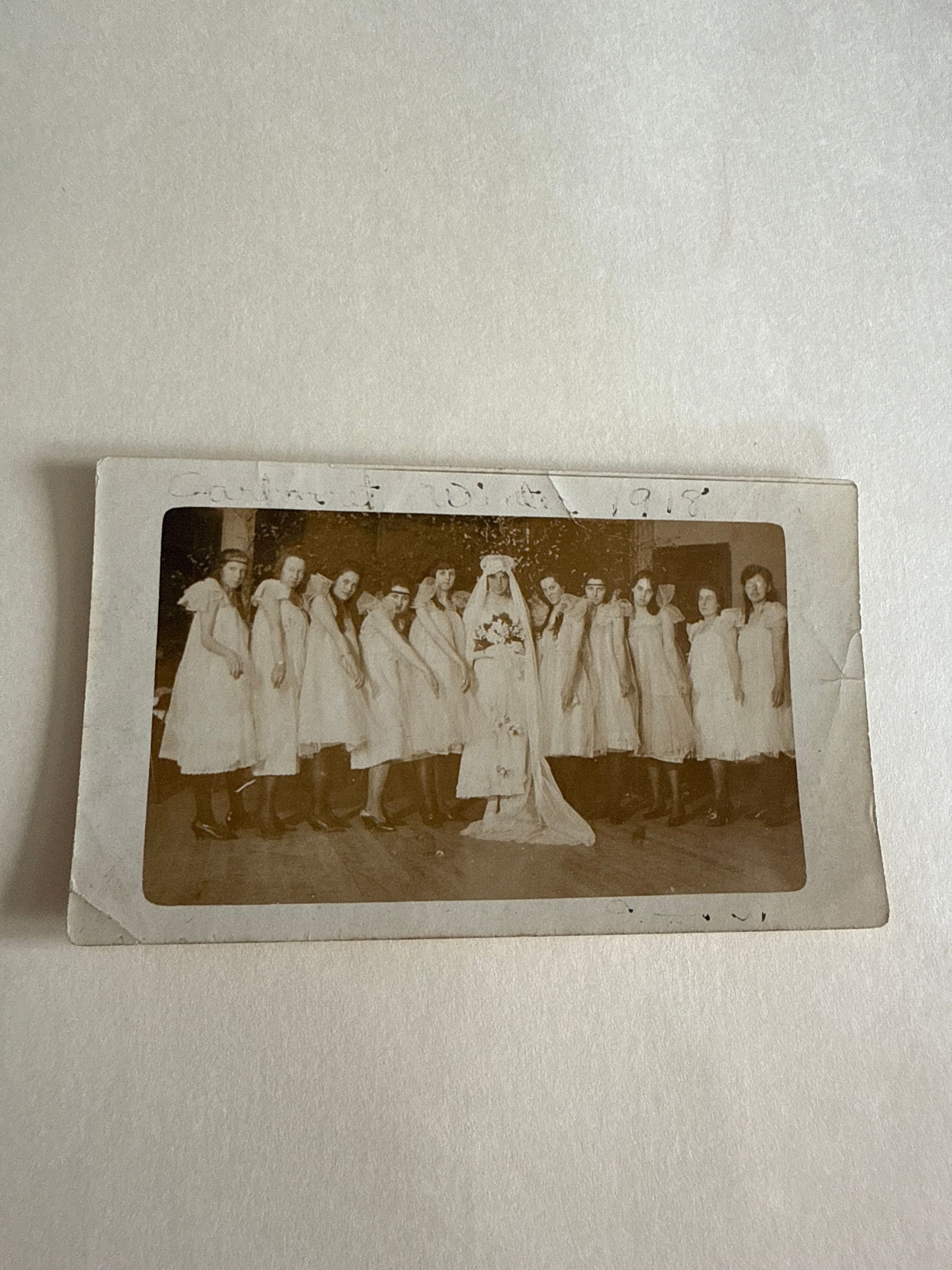Small photo, sepia, girls in costume, 1918 identified 1 of 3. Some identifications do not match other 2 photos.