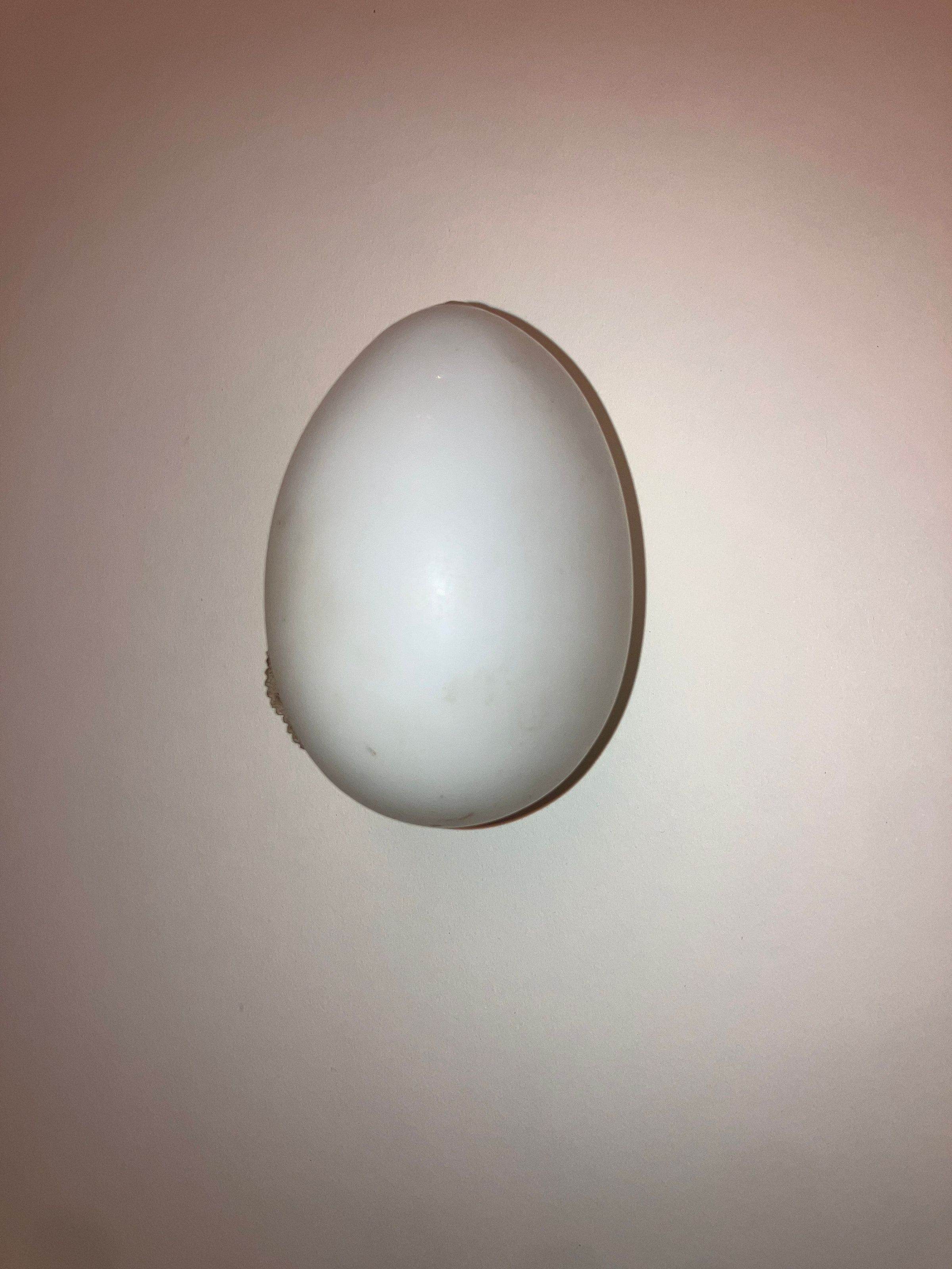 Egg-shaped piece measuring 3 inches long by 5 1/2 inches at the widest circumference. Color is white. Used in a hen's nest to encourage egg laying.