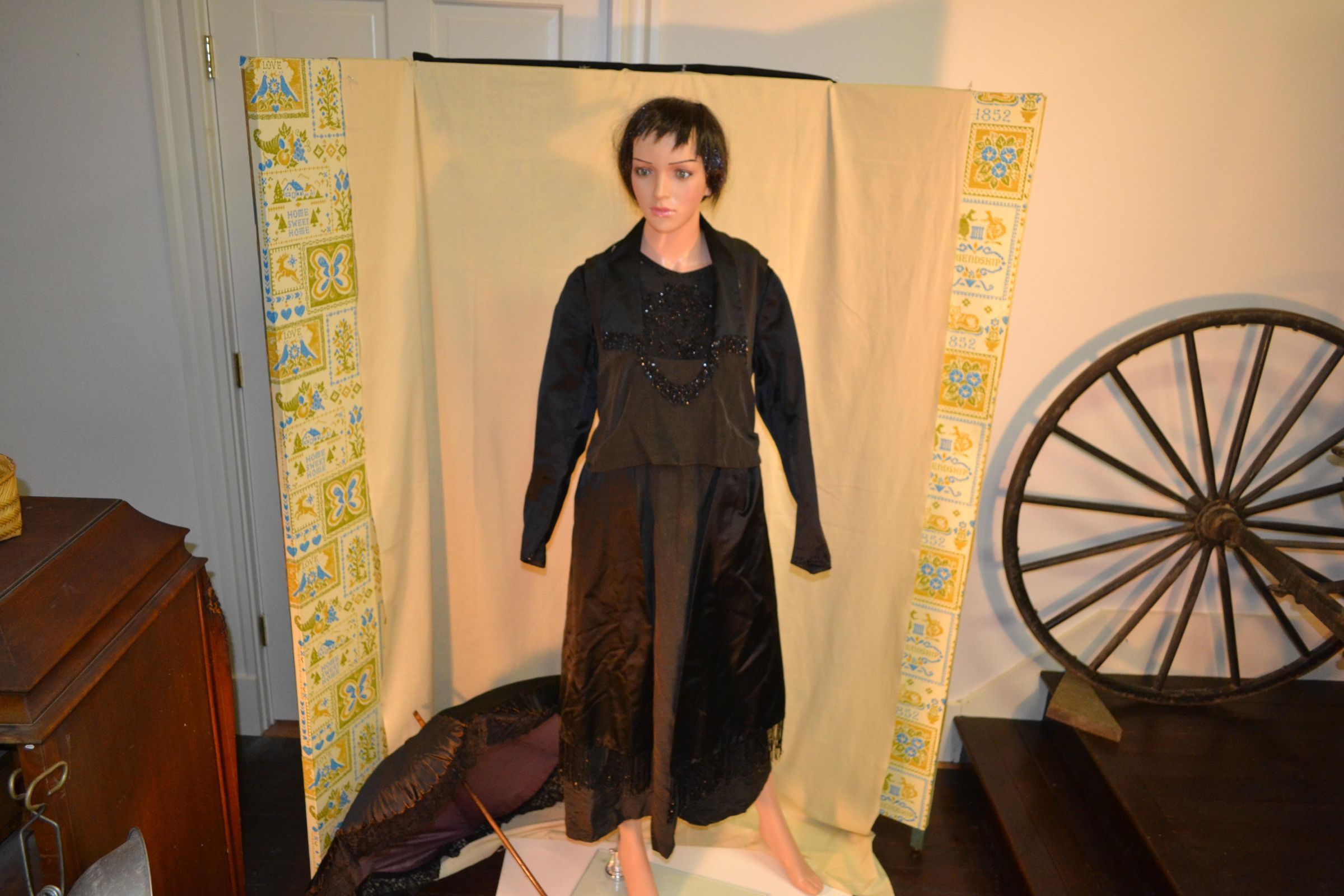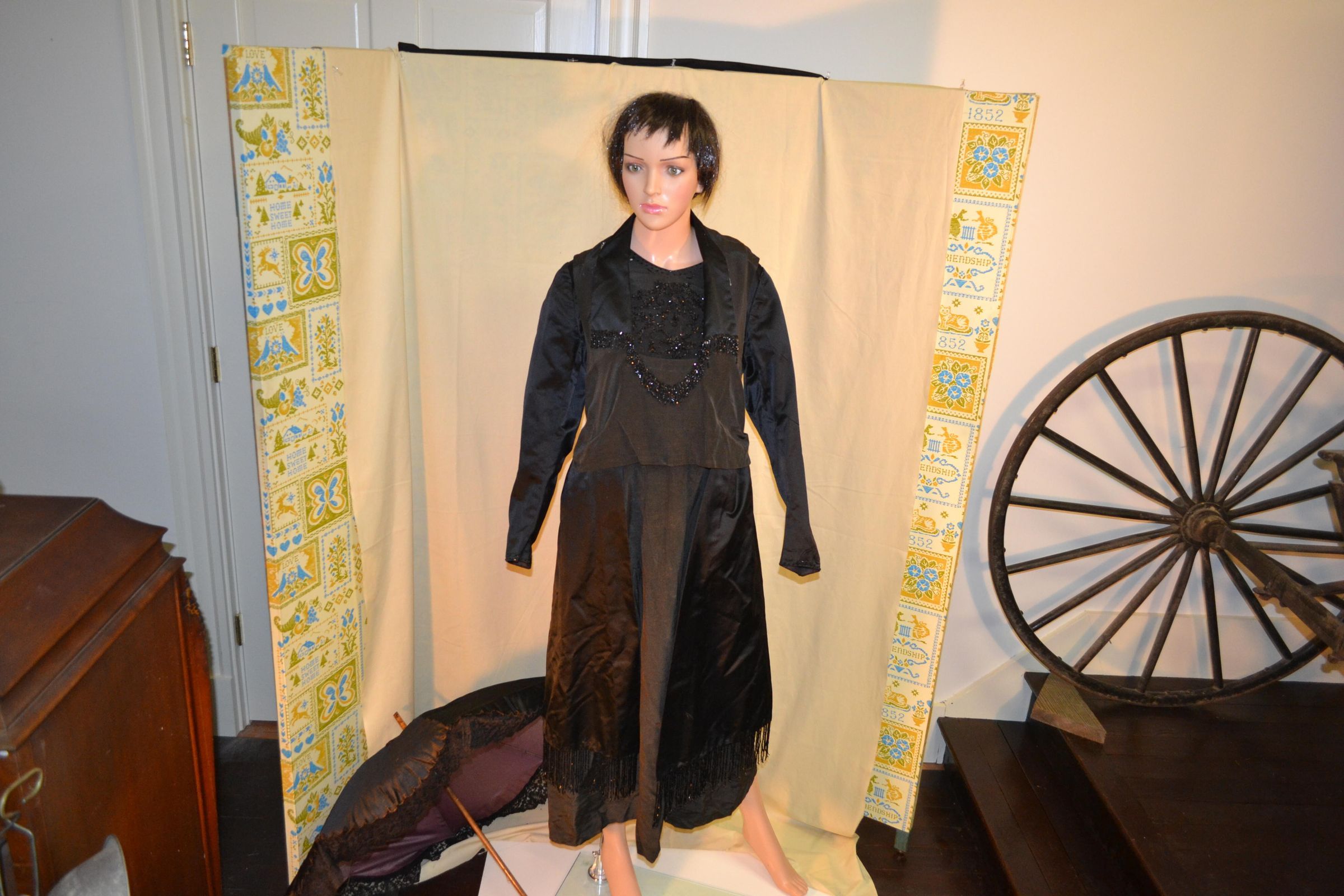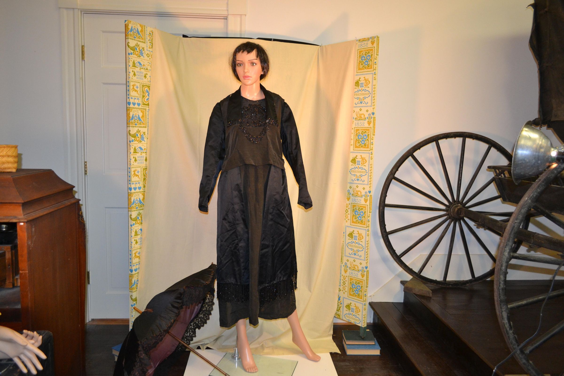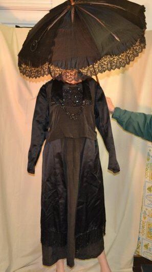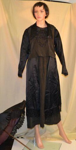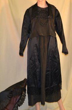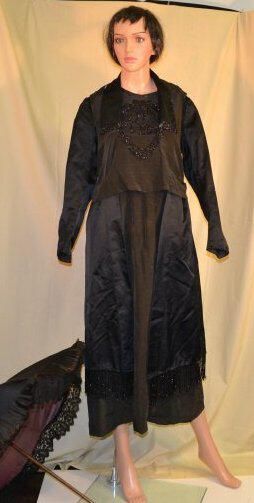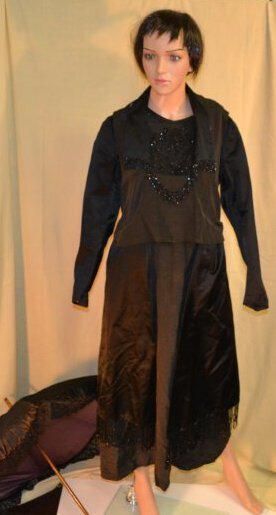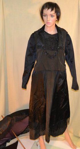 Center Front 45 1/2 inches, sleeve 23 inches. All black. Has loose over-bodice and rectangular side pieces that hang over dress. Side pieces trimmed with beaded fringe. Collar and over-bodice trimmed with beaded fringe. Under-bodice and cuffs have beads sewn on. Loose gathered belt across back. Dress closes with hooks and eyes on left shoulder, and at left waist. Collar lined with white.