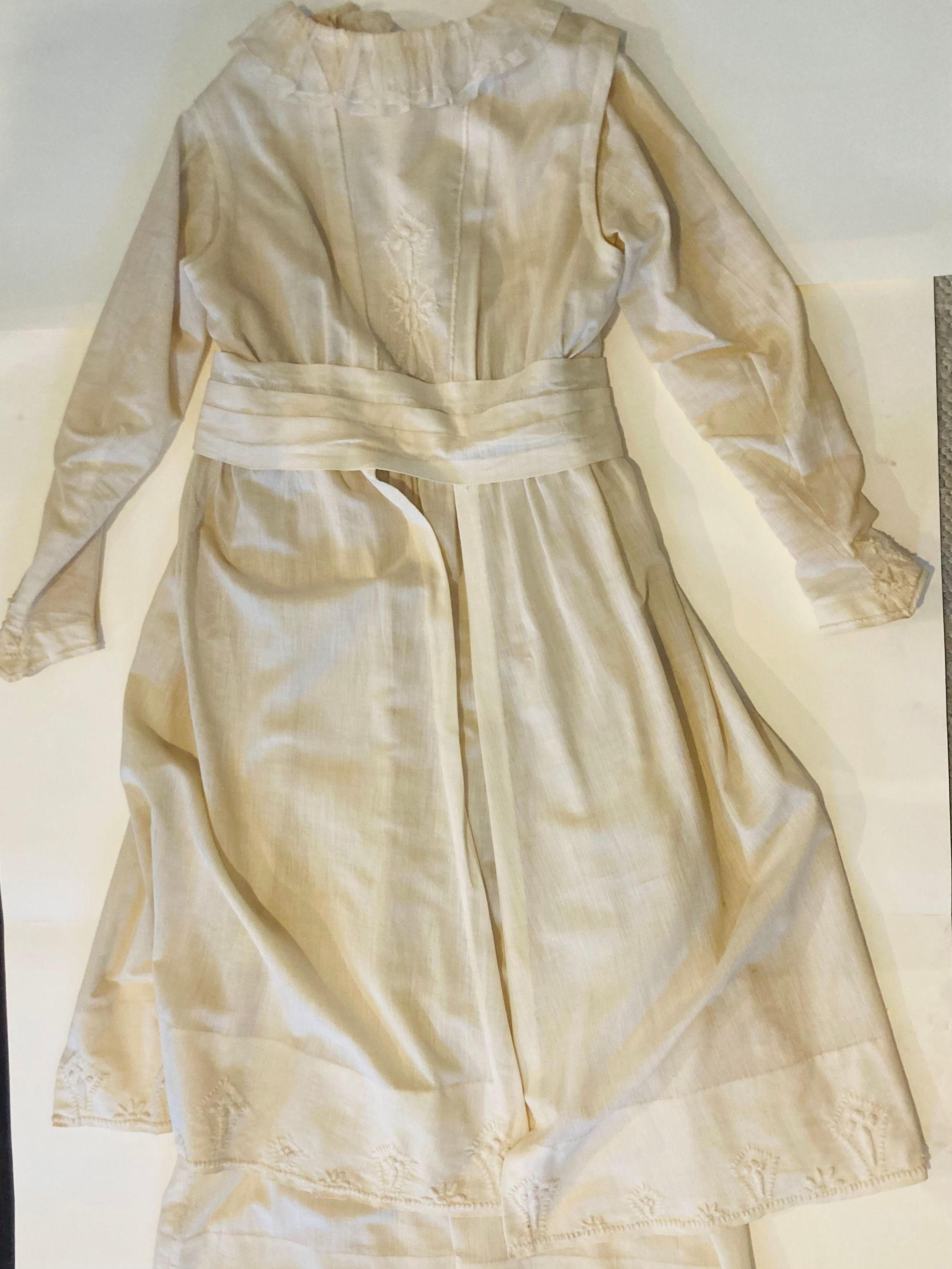 Length at center front 52 3/4 inches. Hem 311/2 inches, length of sleeve 23 1/2 inches. Cream colored dress with over-bodice and skirt attached. Bodice, overskirt hem, back and cuffs are decorated with white yarn embroidery. Has a wide belt with tucks. Closed in back with hooks and eyes. Collar has a loose ruff of lace.