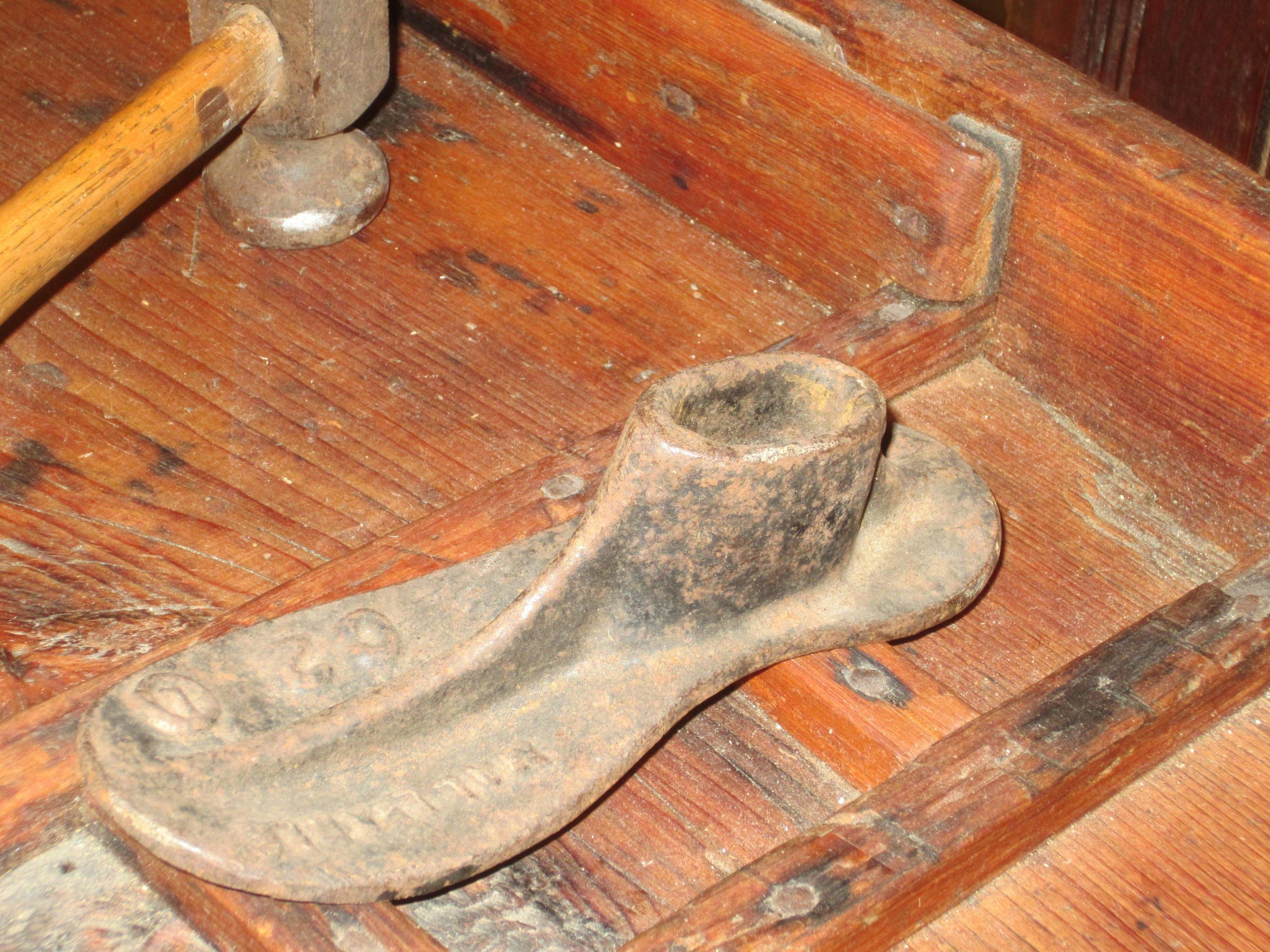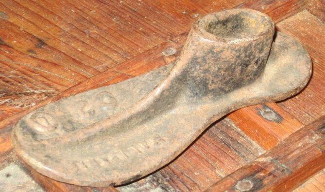 6 3/4 inches x 2 1/4 inches x 2 inches. Metal, shaped like sole (3/16 inch) thickens in arch area and forms a hollow area that fits over shoe last stand. Painted black.