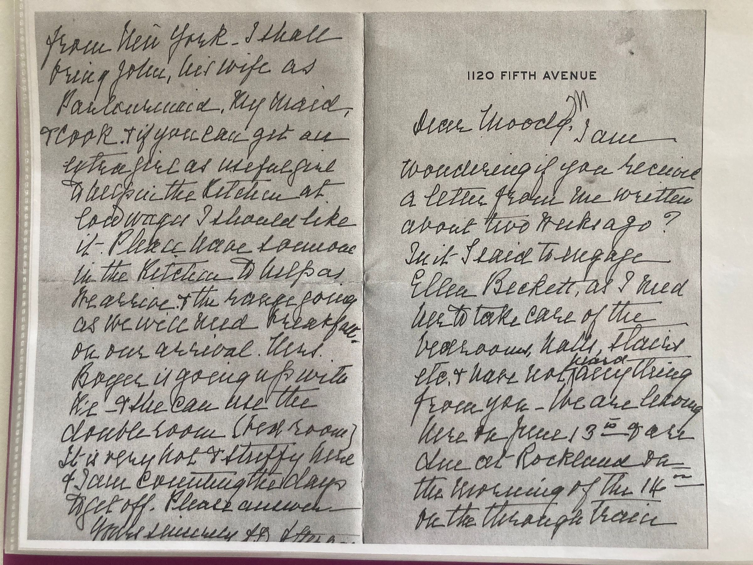 Purple binder of Atterbury-Moody letters, 1938-1939, original letters, copies, and transcripts. Correspondence about the Dark Harbor house, arrival dates, buying supplies, hiring help, sending checks.