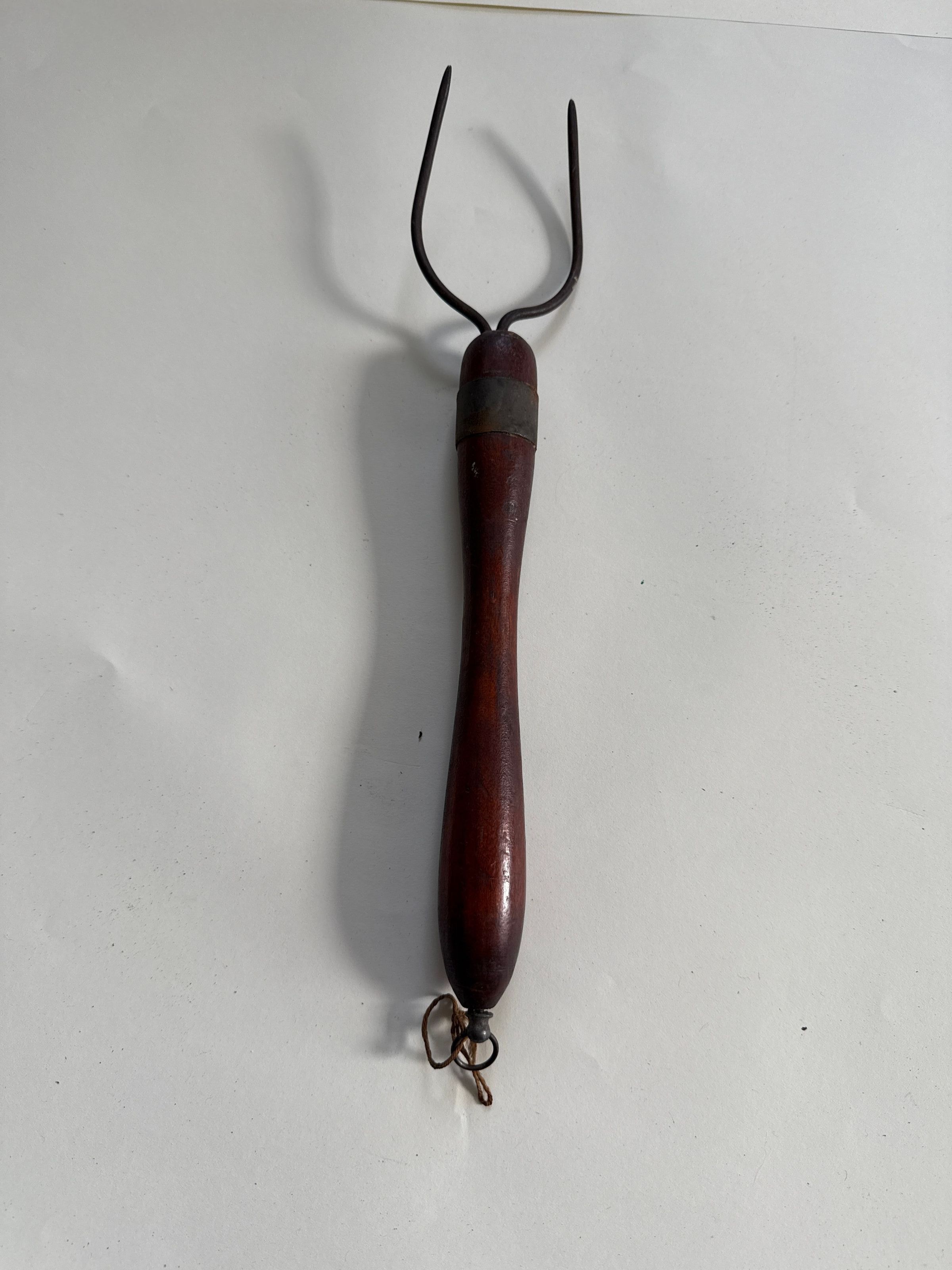 Two--tined fork, tines spread widely. Wooden reddish handle with metal band near top. Metal hook at end of handle for hanging. 14 1/4 inches x 2 3/4 inches (width of fork) x 1 1/4 inches (diameter of handle)