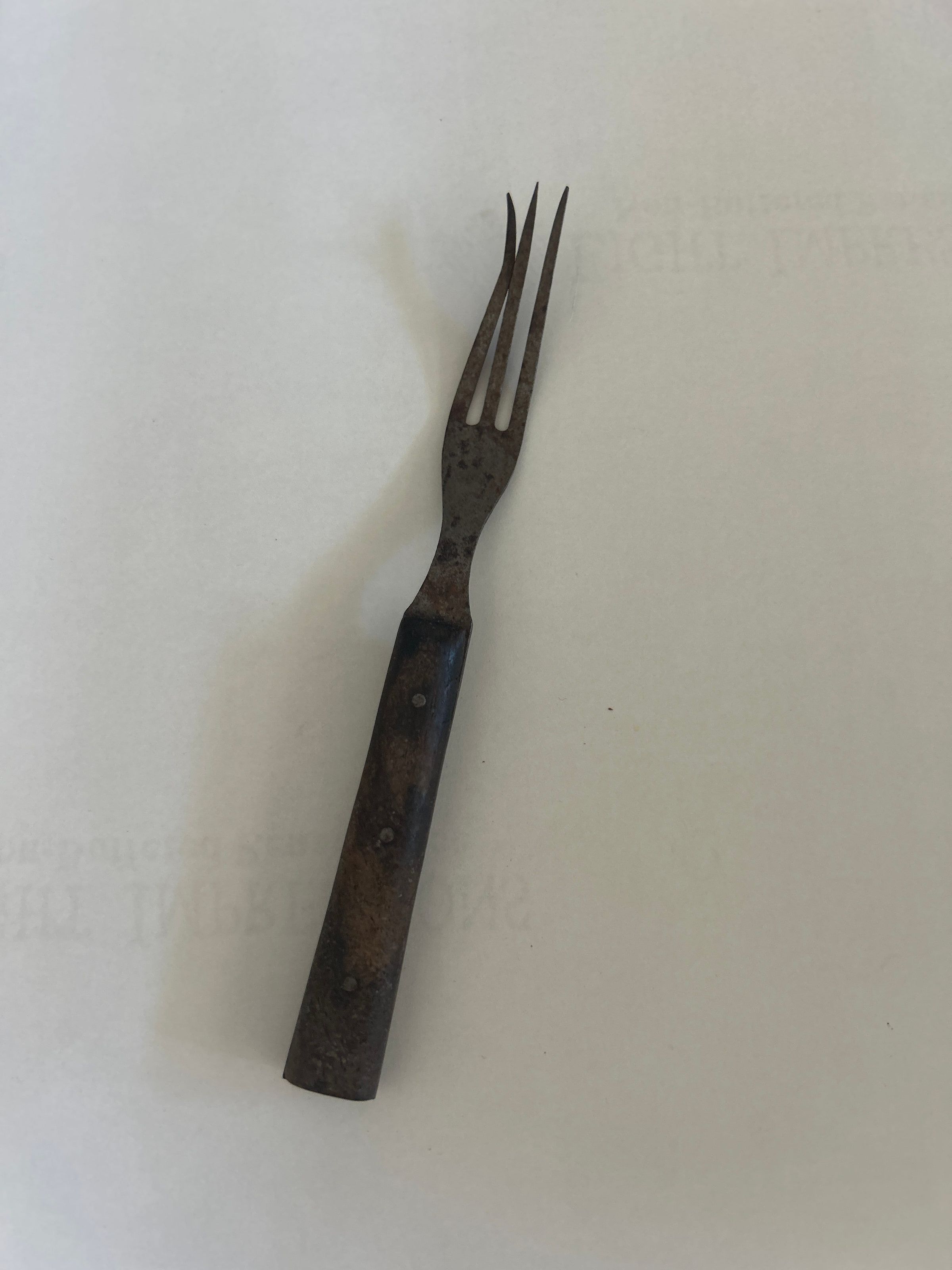 7 inches x 5/8 inch x 1/2 inch. Fork has 3 tines. One outside tine is bent. Handle is painted black. Paint is worn. Handle is secured with three small rivets.