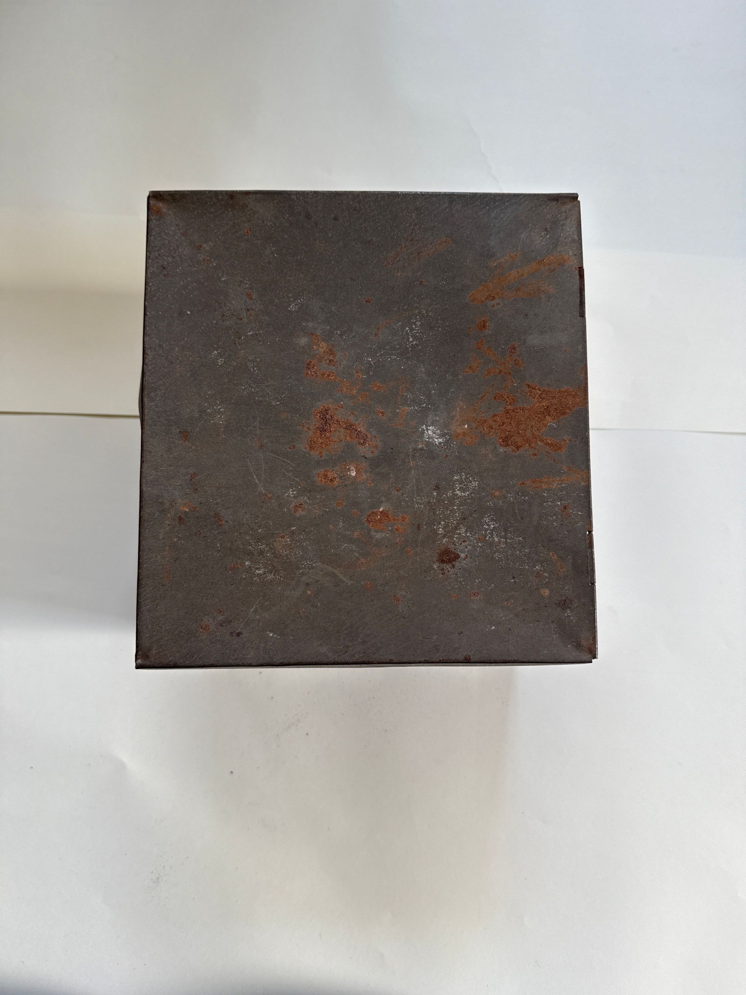 8 1/4 inches x 9 inches x 6 7/8 inches. Squarish metal box with hinged lid.