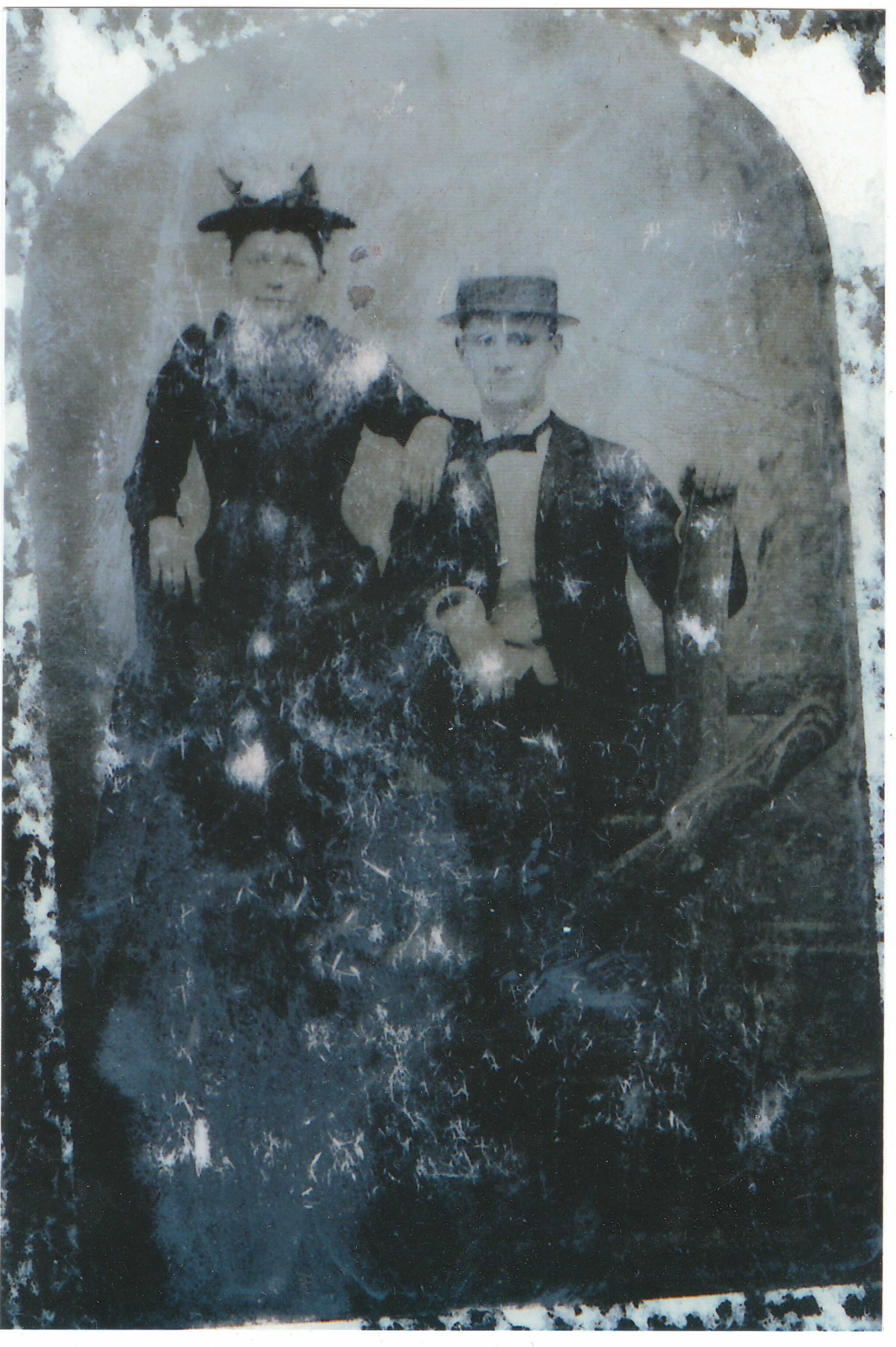 Excellent photo of damaged old image. Herbert Leon Coombs, seated, and his bride? Elizabeth Gowdy standing beside him, 1892.