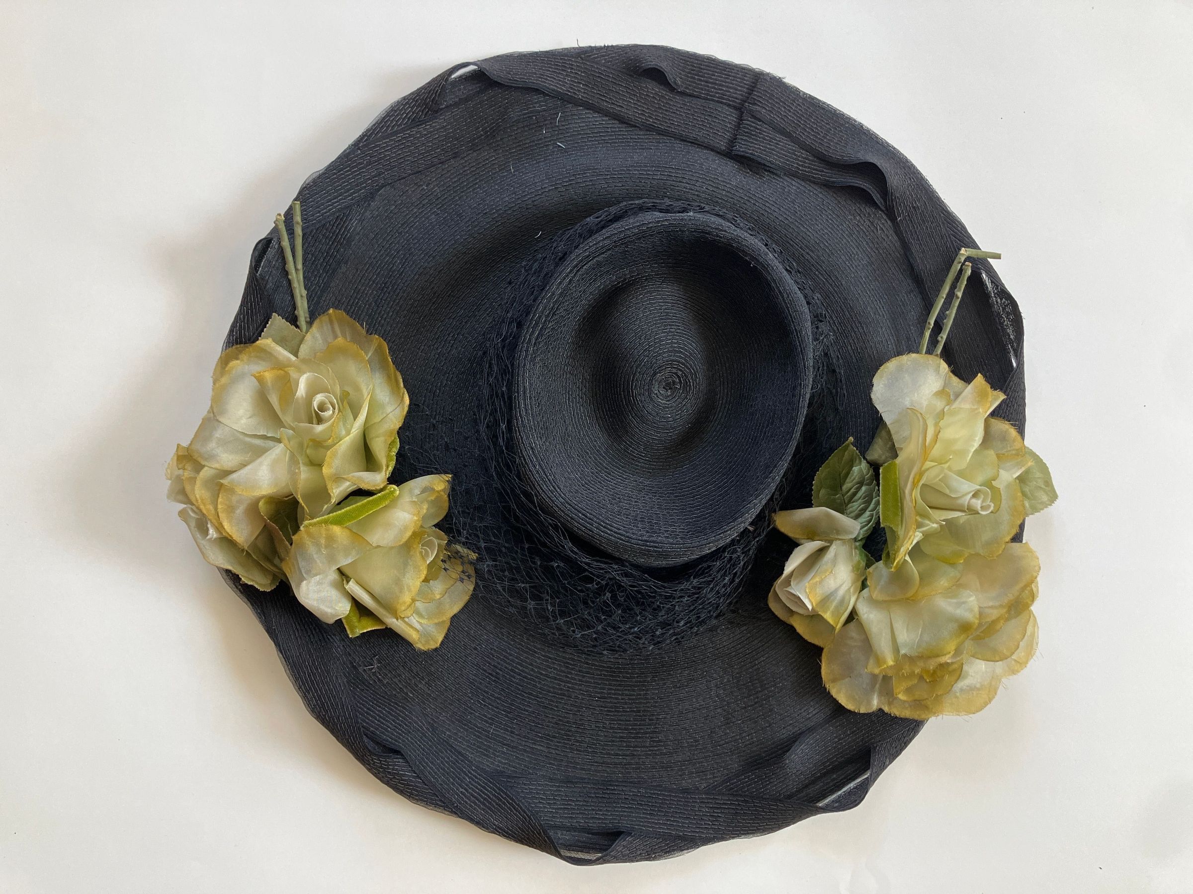 Black, broad-brimmed hat. Crown is surrounded by black lacy net material. Has two bunches of large rose-like flowers with leaves. Has thin string of elastic attached to inner brim.