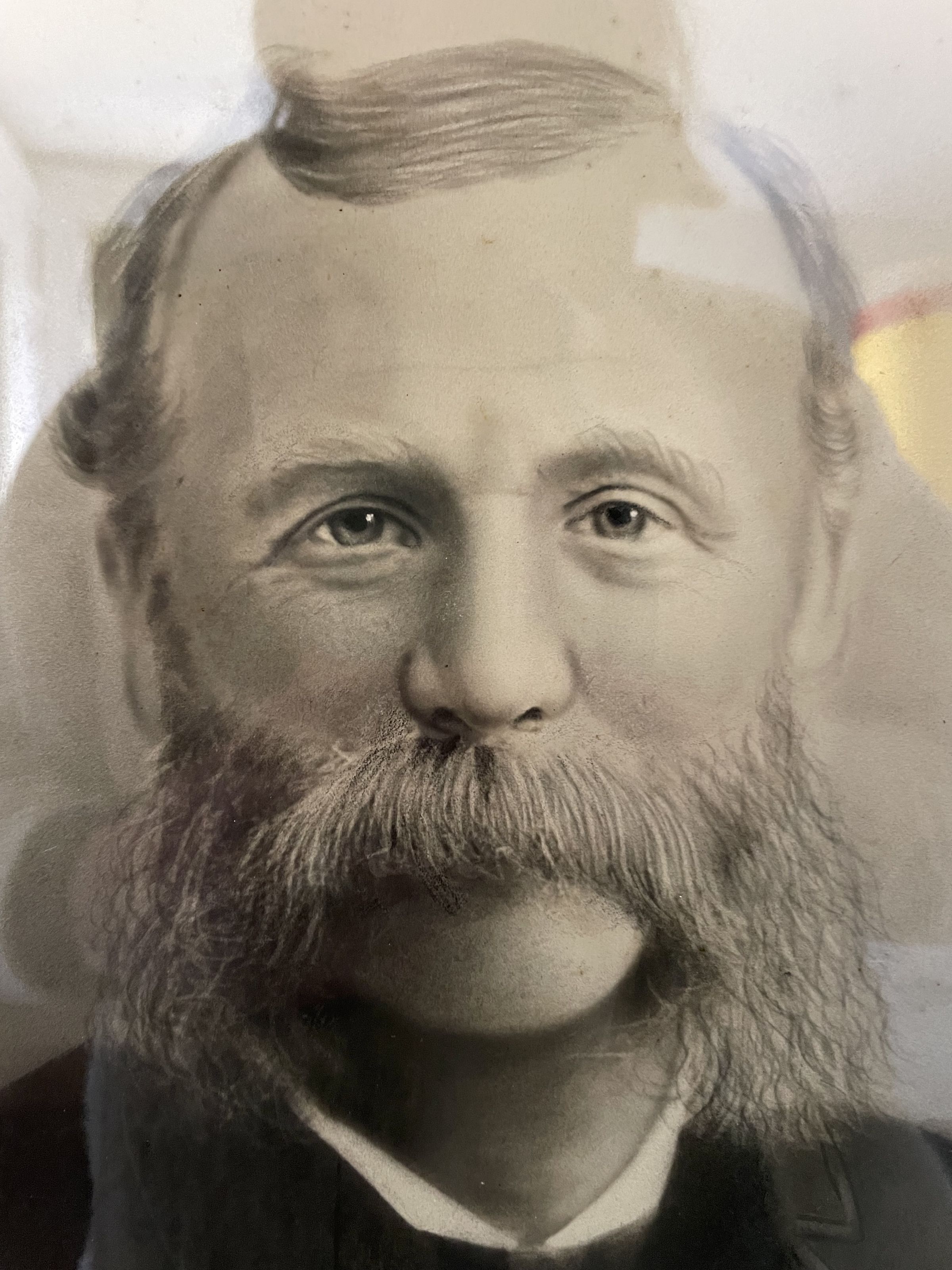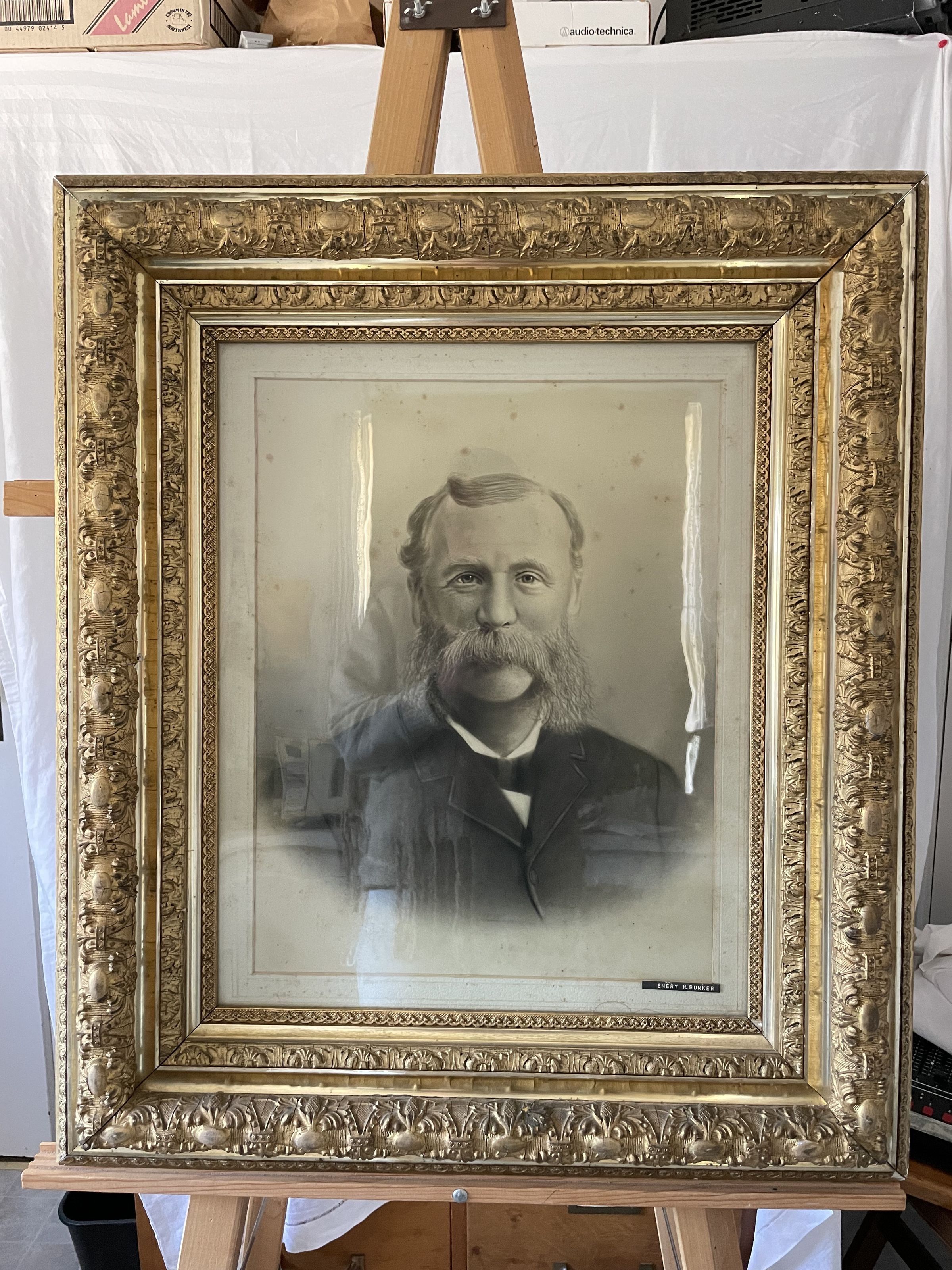 Black and white photograph of a man, identified as Emery N. Bunker. The portrait is taken from the chest up and has a white to grey vignette. The man has a large mustache, sideburns, and neat gelled hair. In the bottom right corner, is a label reading "Emery N. Bunker"