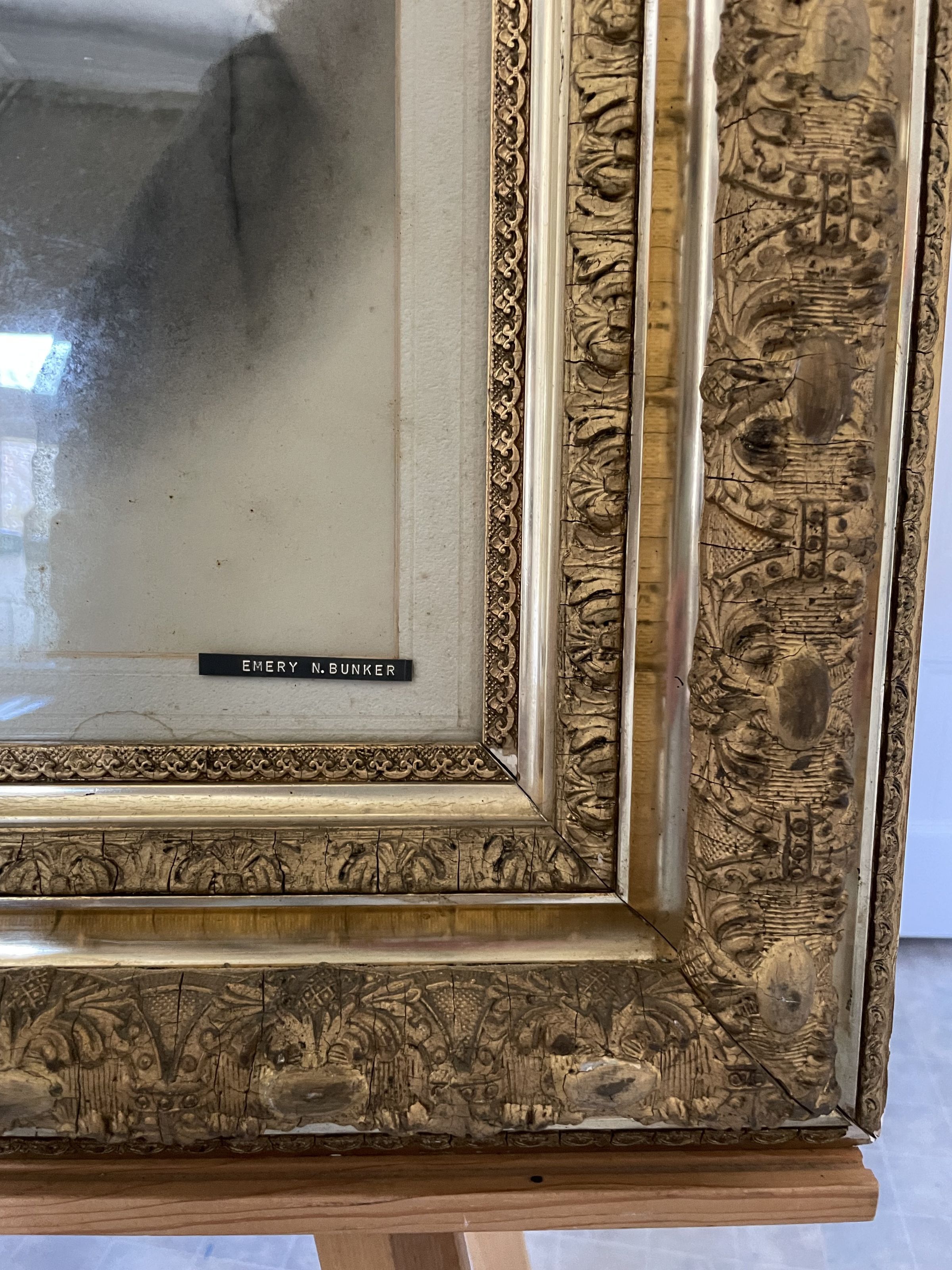The image is framed in a wooden frame painted gold. The frame has multiple tiers of carvings.