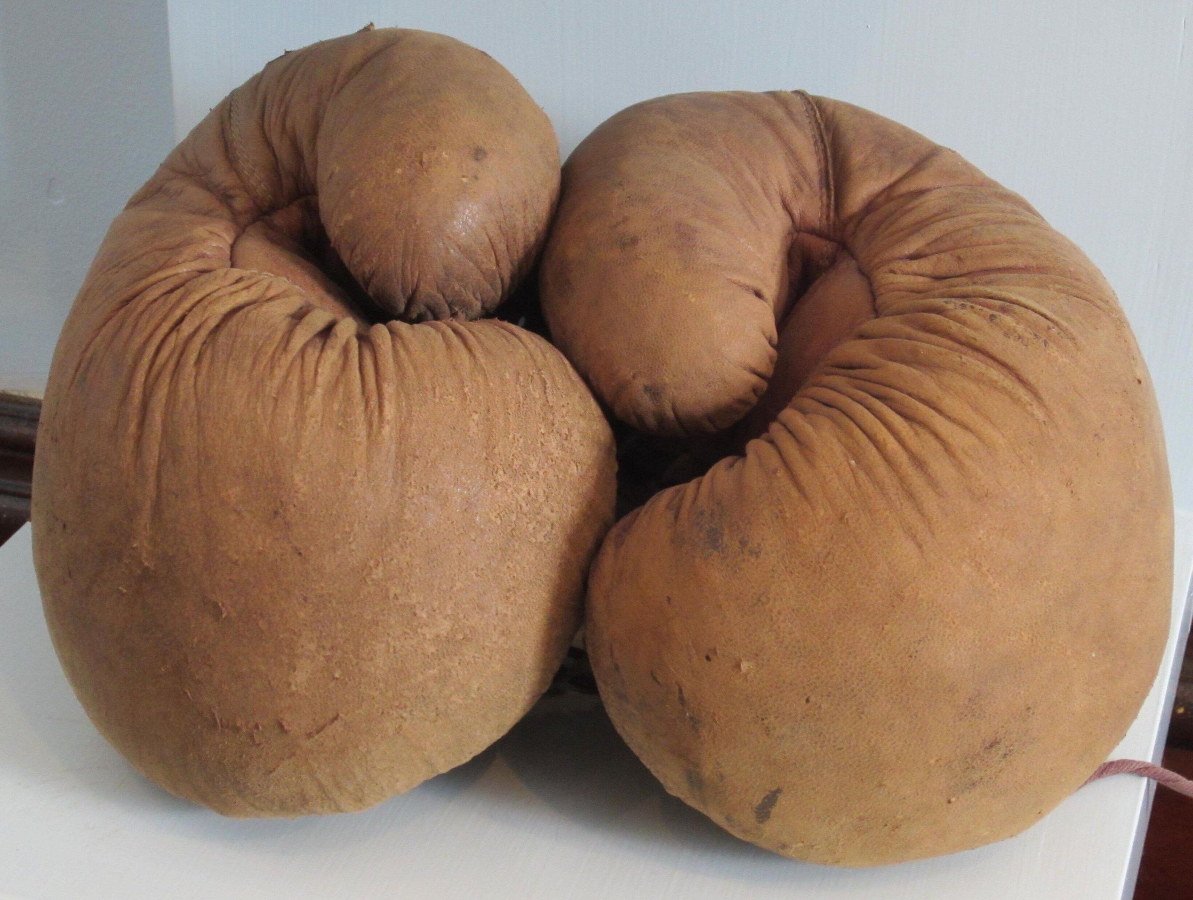 Pair of boxing gloves. Each boxing glove has irregular shape 9 inches x 7 inches. Brown leather lined with white fabric. Has six holes on each side. One laced with twine and one with brown tape..