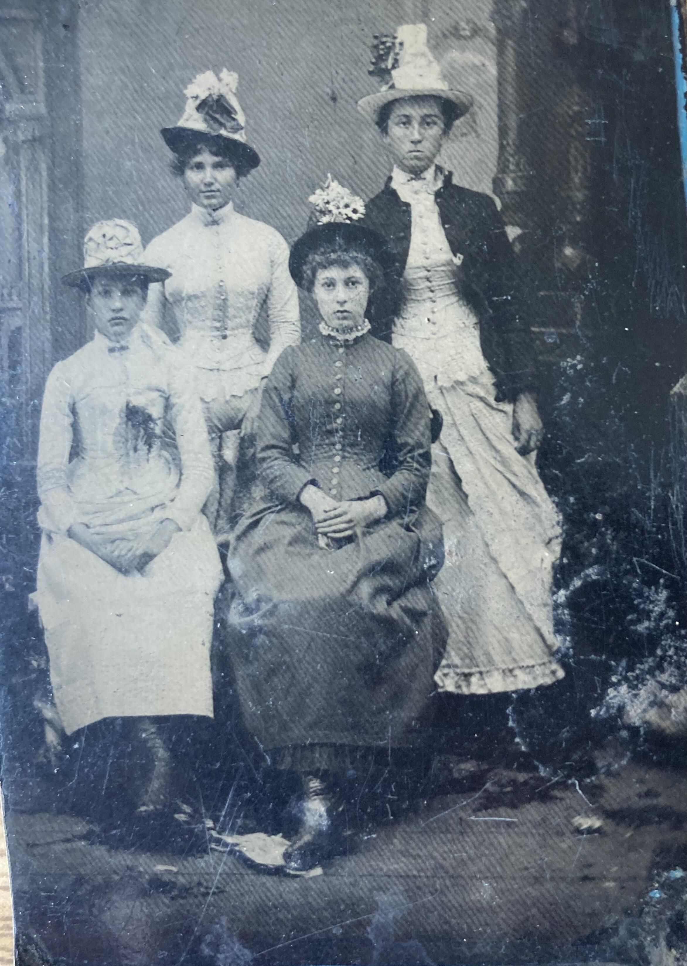 Five small tintype portraits. (1) a group of four women in fashionable hats; (2) a young man in white shirt, tie dark jacket and light-colored trousers, hair carefully combed; (3) a young man in a dark suit, image slightly damaged; (4) a young boy, carefully dressed in dark clothing, formally posed; (5) a small boy, still in short trousers, identified by the name "Justin," image slightly damaged.