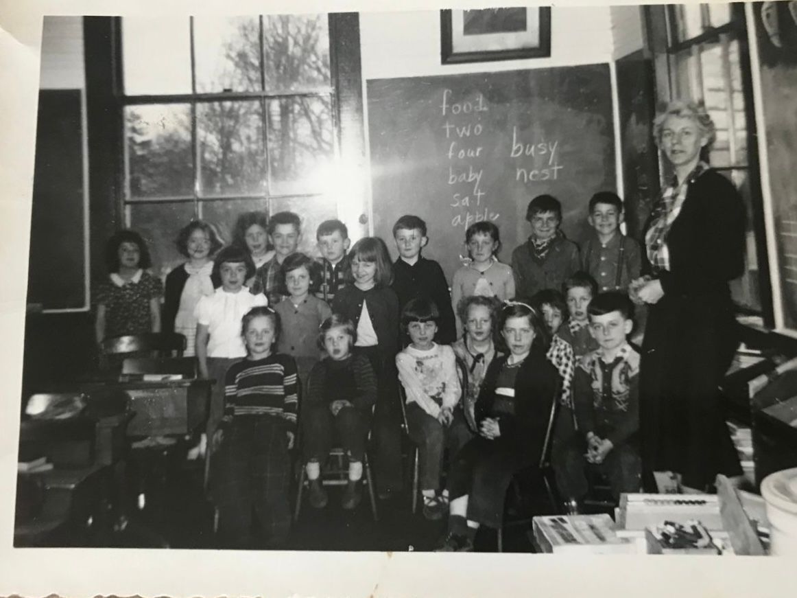 Teacher Dot Pendleton, with her students for 1953-54. Front row, L to R: Dawn Grinnell, Andrea Pendleton, Susan Durkee, Nancy York, Karen Coombs, Everard Dodge, Mike MCorison, Albert Rolerson Sec. Row: Sharon Leach, Wendy Hamilton or Sharon Wood, Linda Grindle Third Row: ?, Suzy Gray, Rocky Coombs, Stanley Pendleton, Roger Pendleton, Carolyn Leach Durkee, Gilbert Leach, Darrell Rolerson.