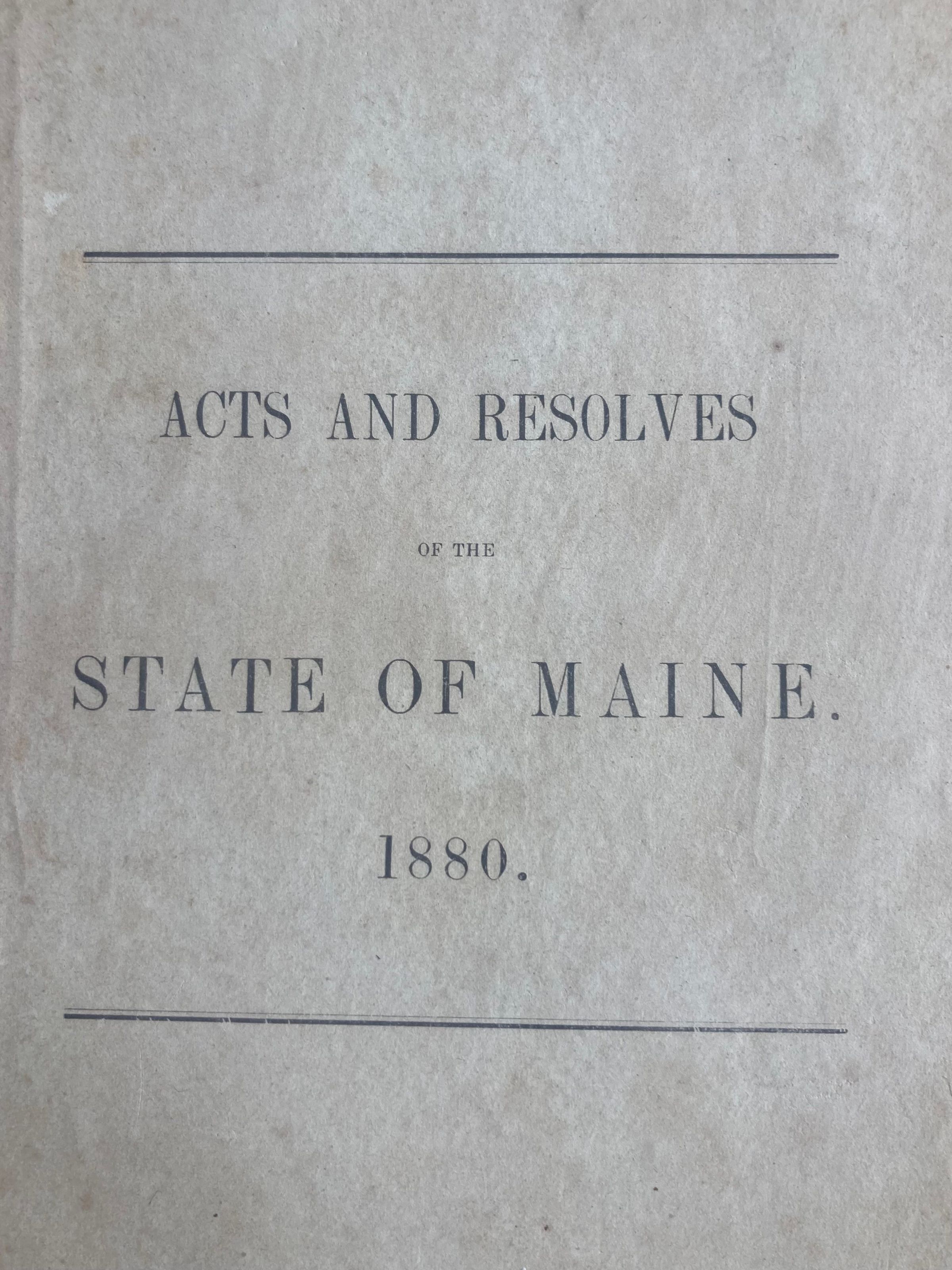 Acts and Resolves of the State of Maine, 1880. Cover inscription: C. W. Sherman, Waldo 1881.