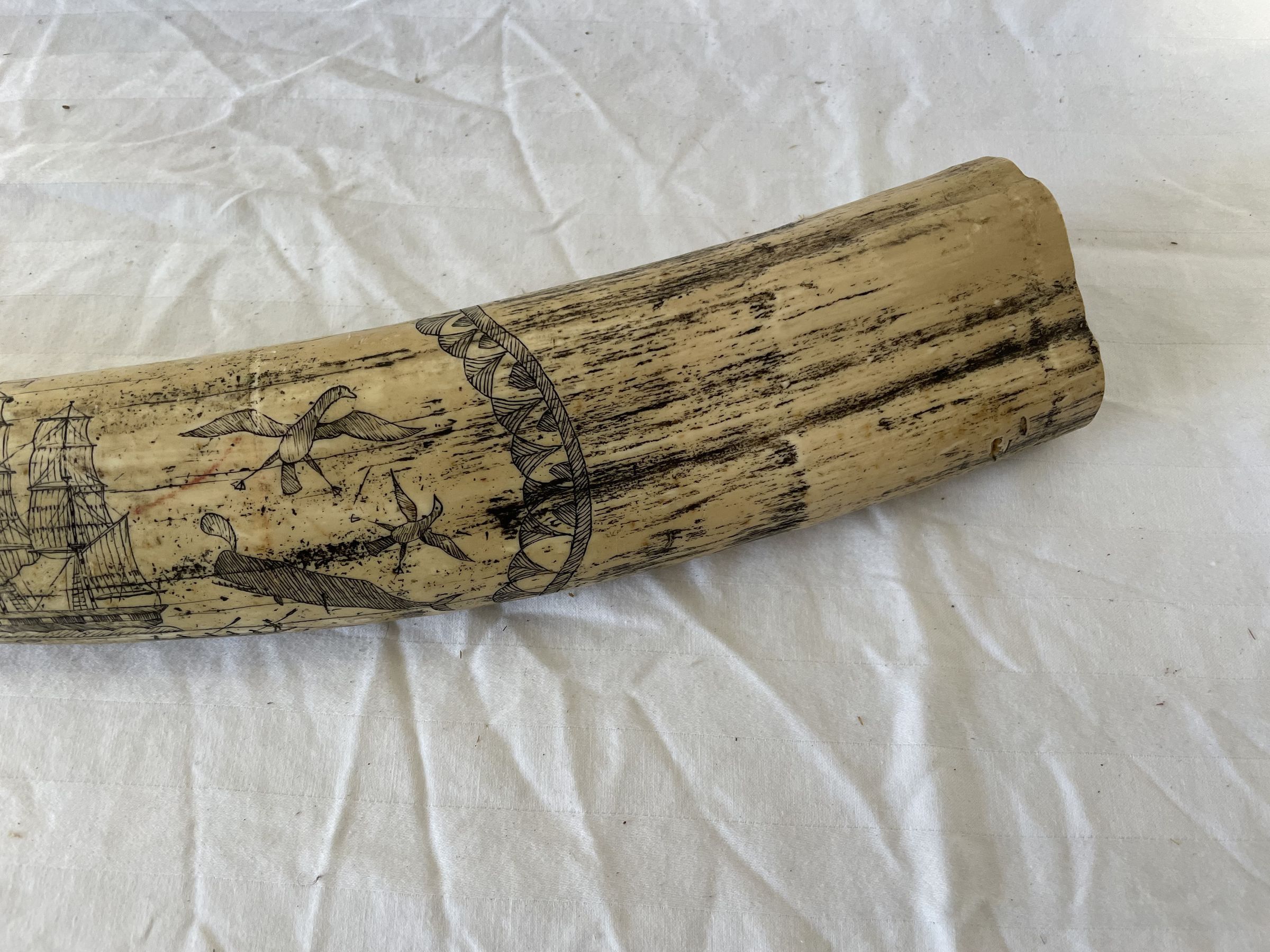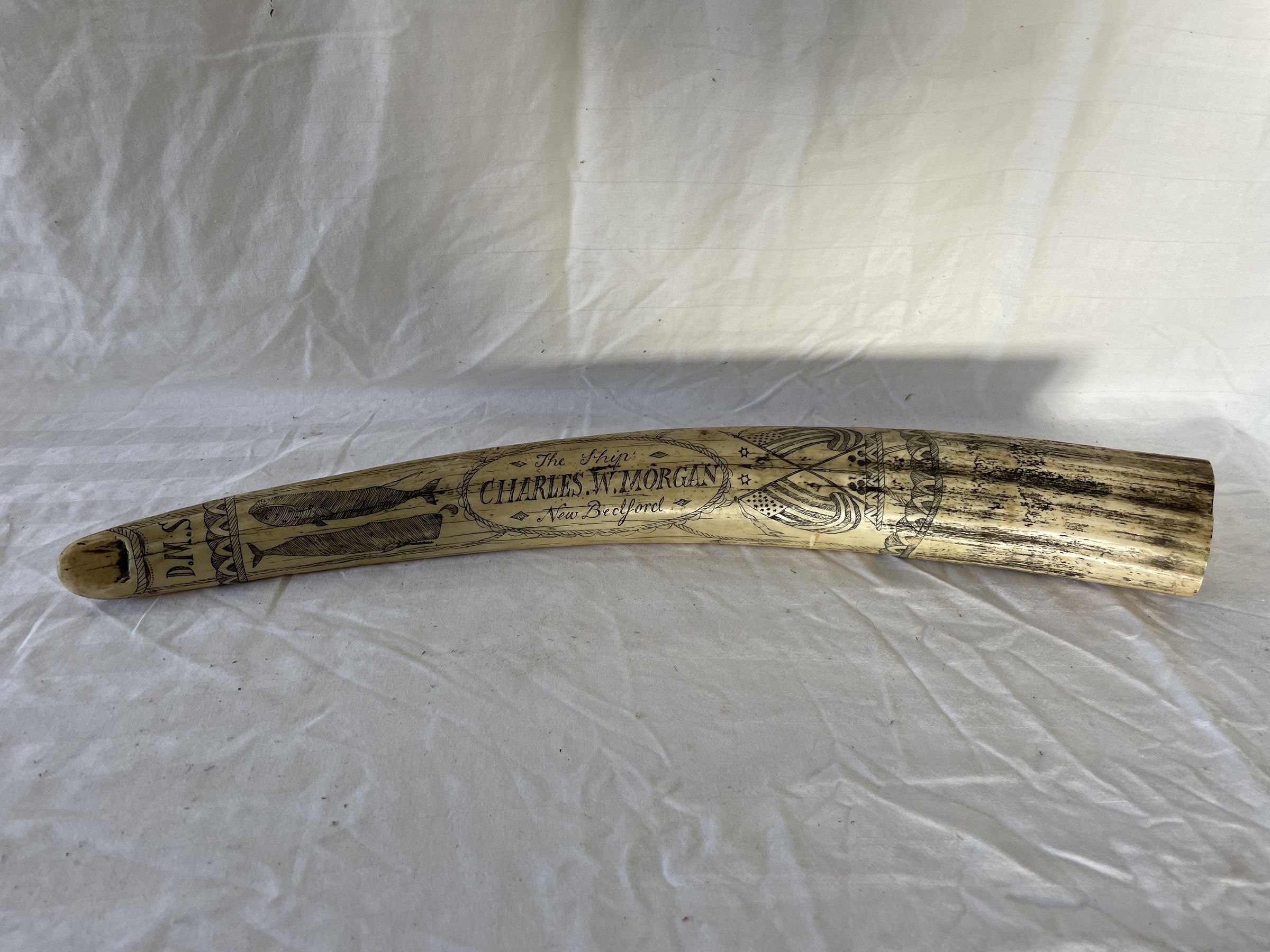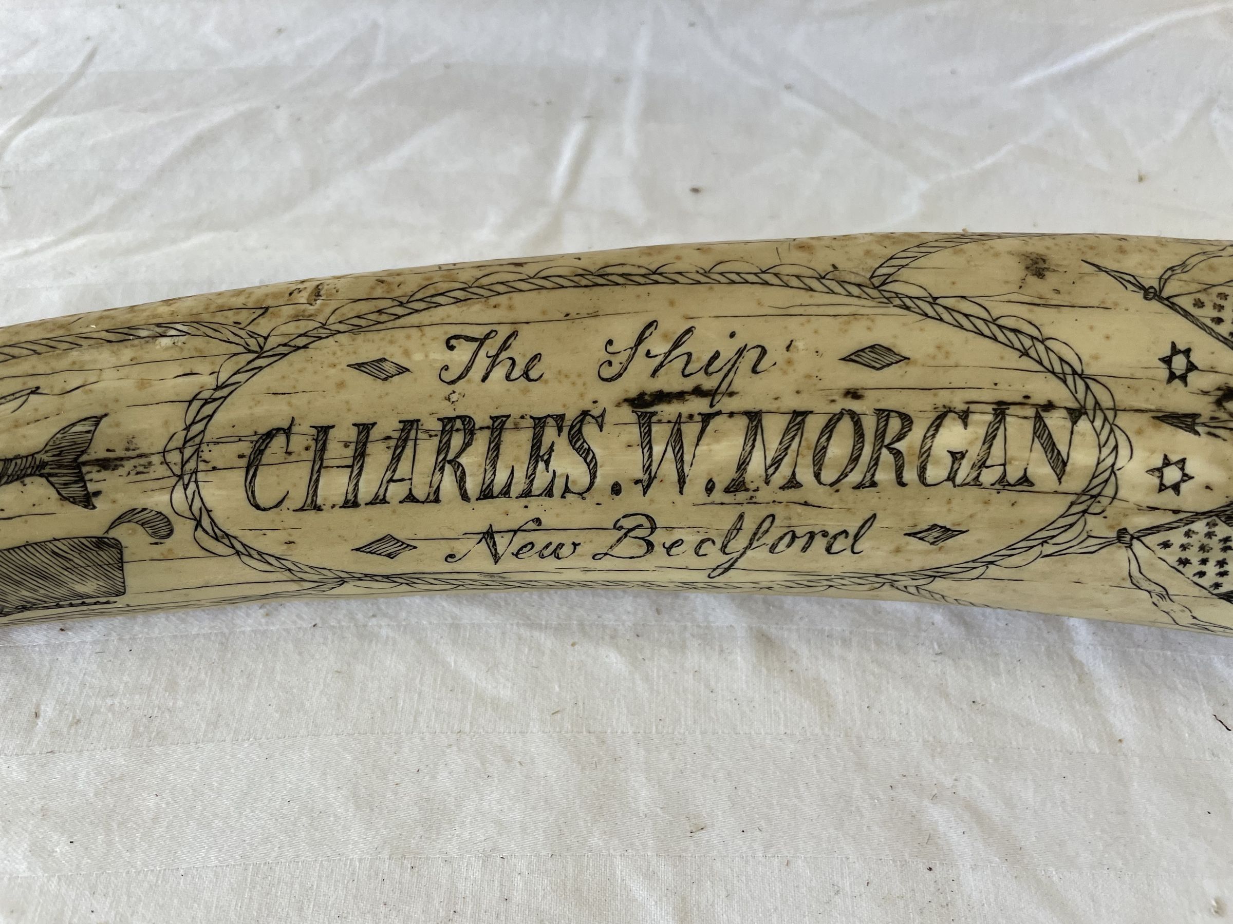 Intricate Scrimshaw carved into some sort of bone. Carving includes 2 sperm whales at the tip of the horn, and script that reads: "D.M.S". The middle of the bone reads: "The ship Charles. W. Morgan New Bedford." At the base of the bone is two american flags crossing. The back has carvings of a large three mast schooner and seagulls, whales, fishing dorys, and is inscribed with "1842" at the tip.