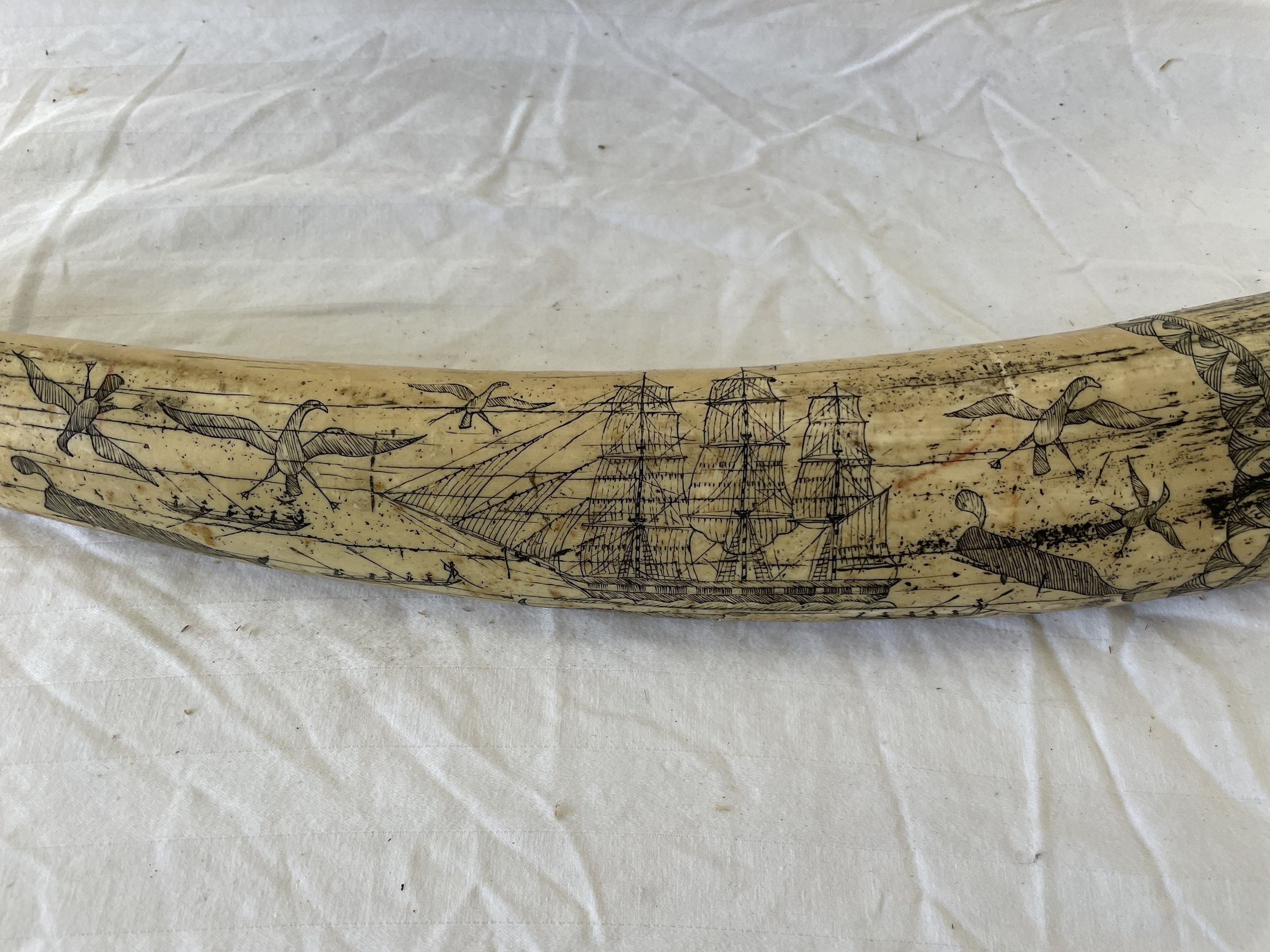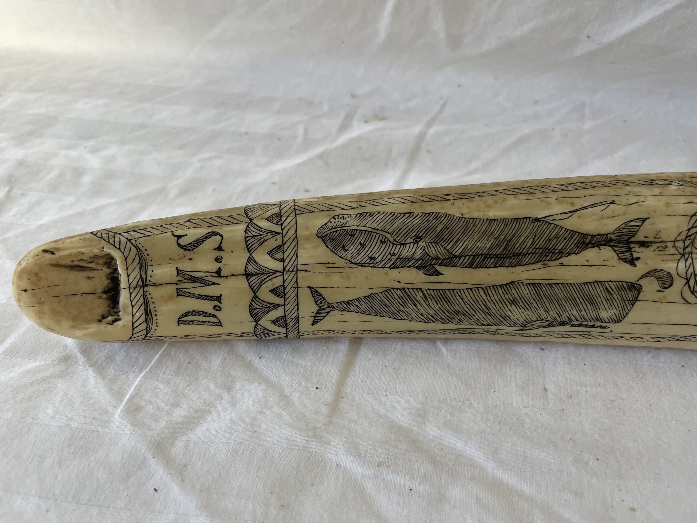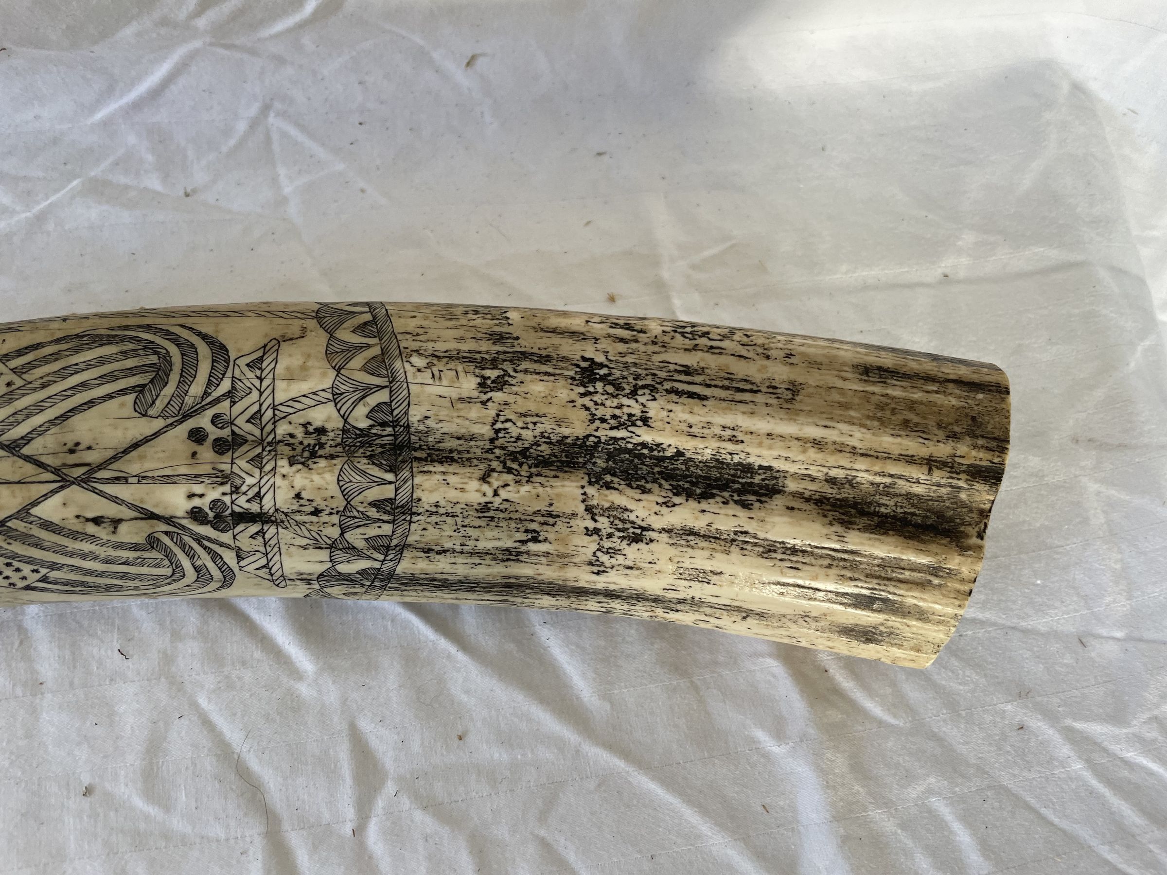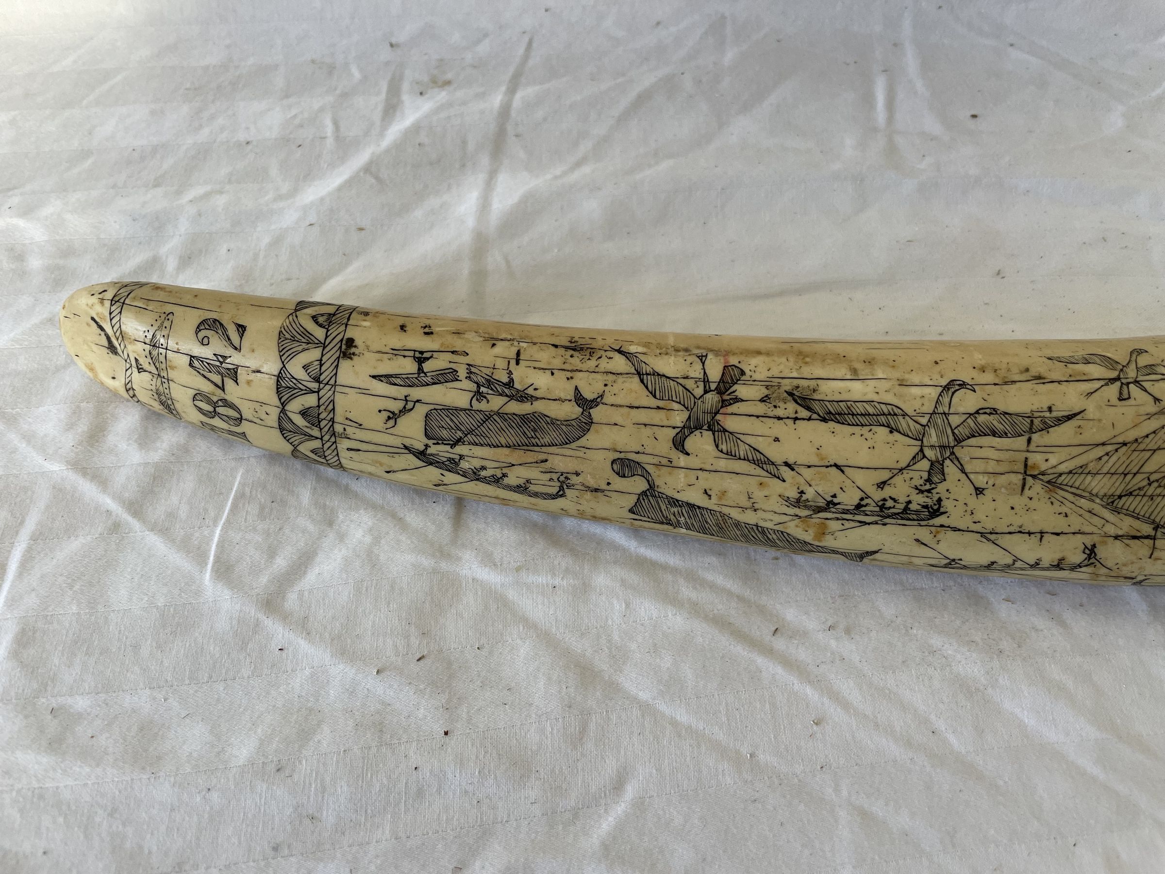 Intricate Scrimshaw carved into some sort of bone. Carving includes 2 sperm whales at the tip of the horn, and script that reads: "D.M.S". The middle of the bone reads: "The ship Charles. W. Morgan New Bedford." At the base of the bone is two american flags crossing. The back has carvings of a large three mast schooner and seagulls, whales, fishing dorys, and is inscribed with "1842" at the tip.