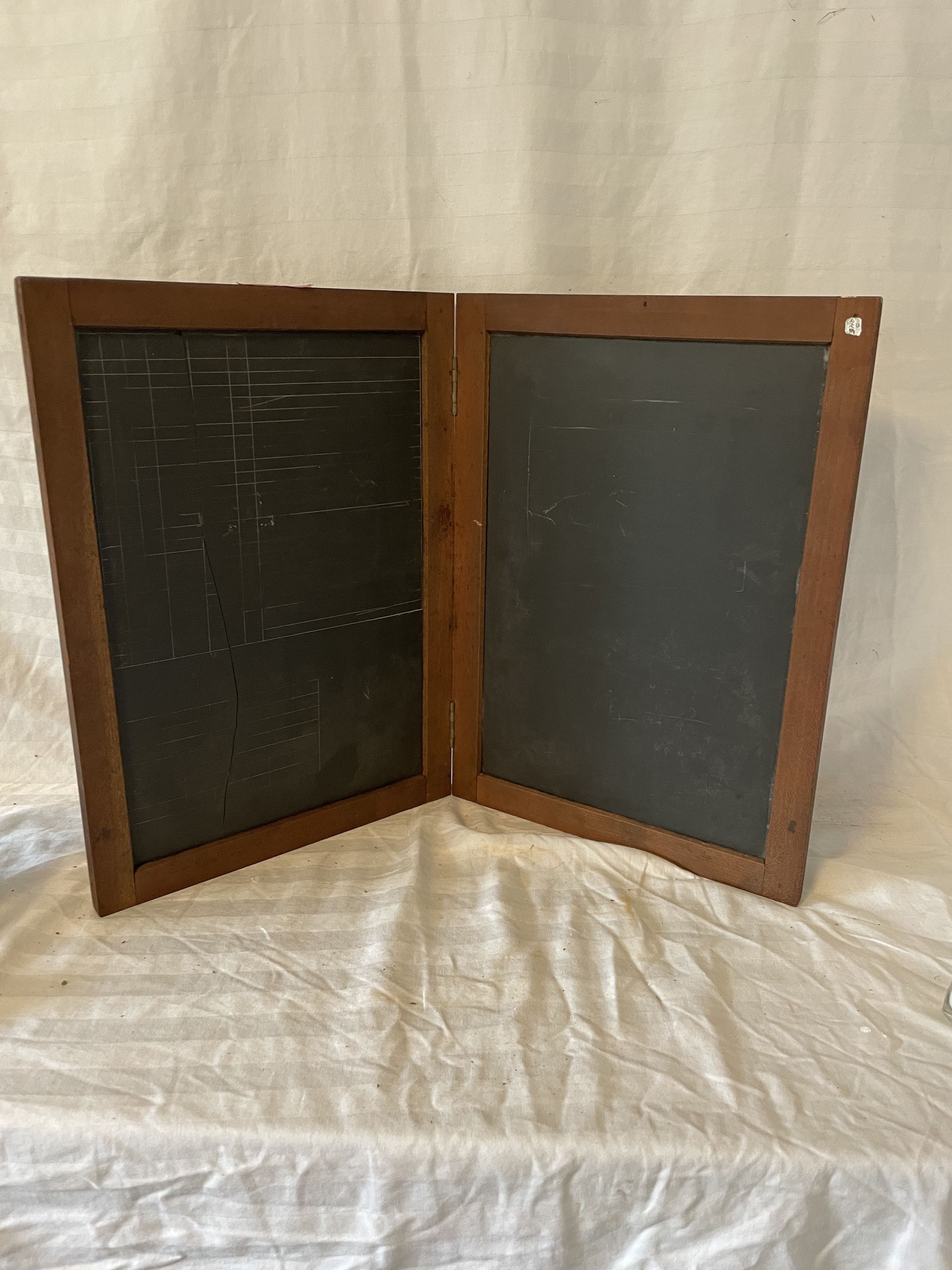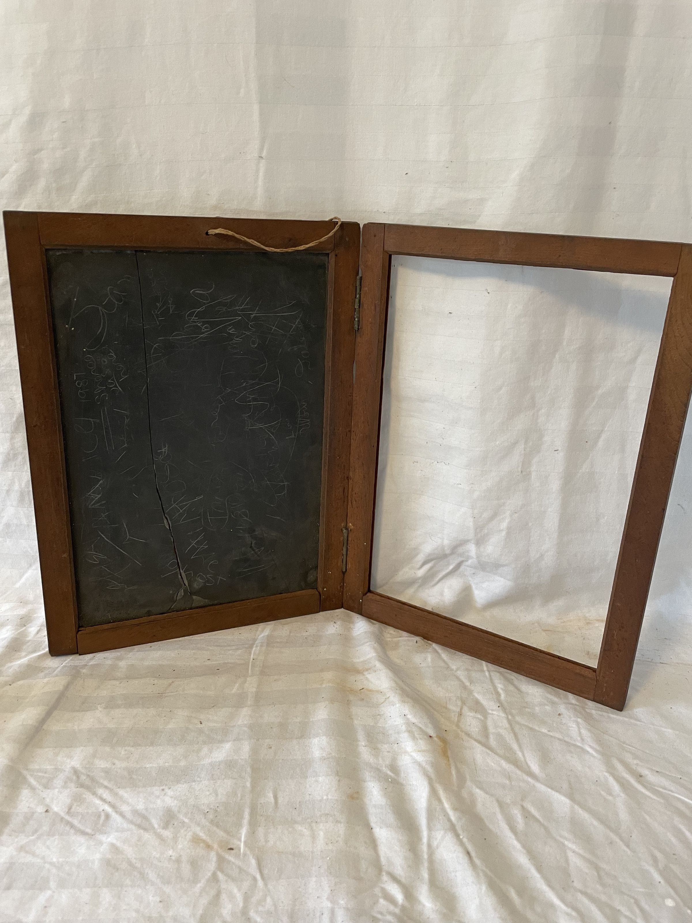 A pair of log slates, framed in wood each with unique etchings on a chalk board slate. Maybe used in the school or as a log for weather and wind in the lighthouse.