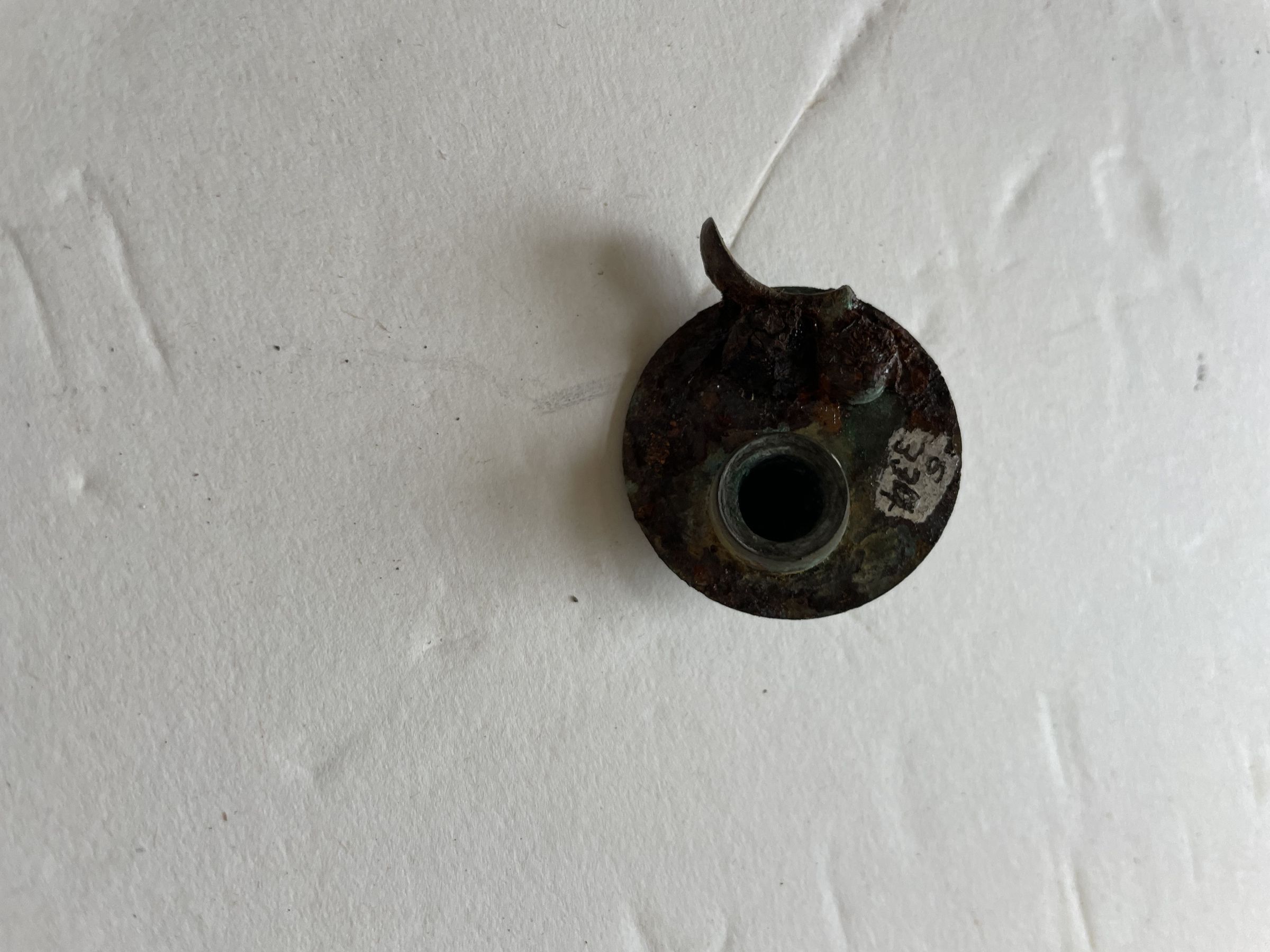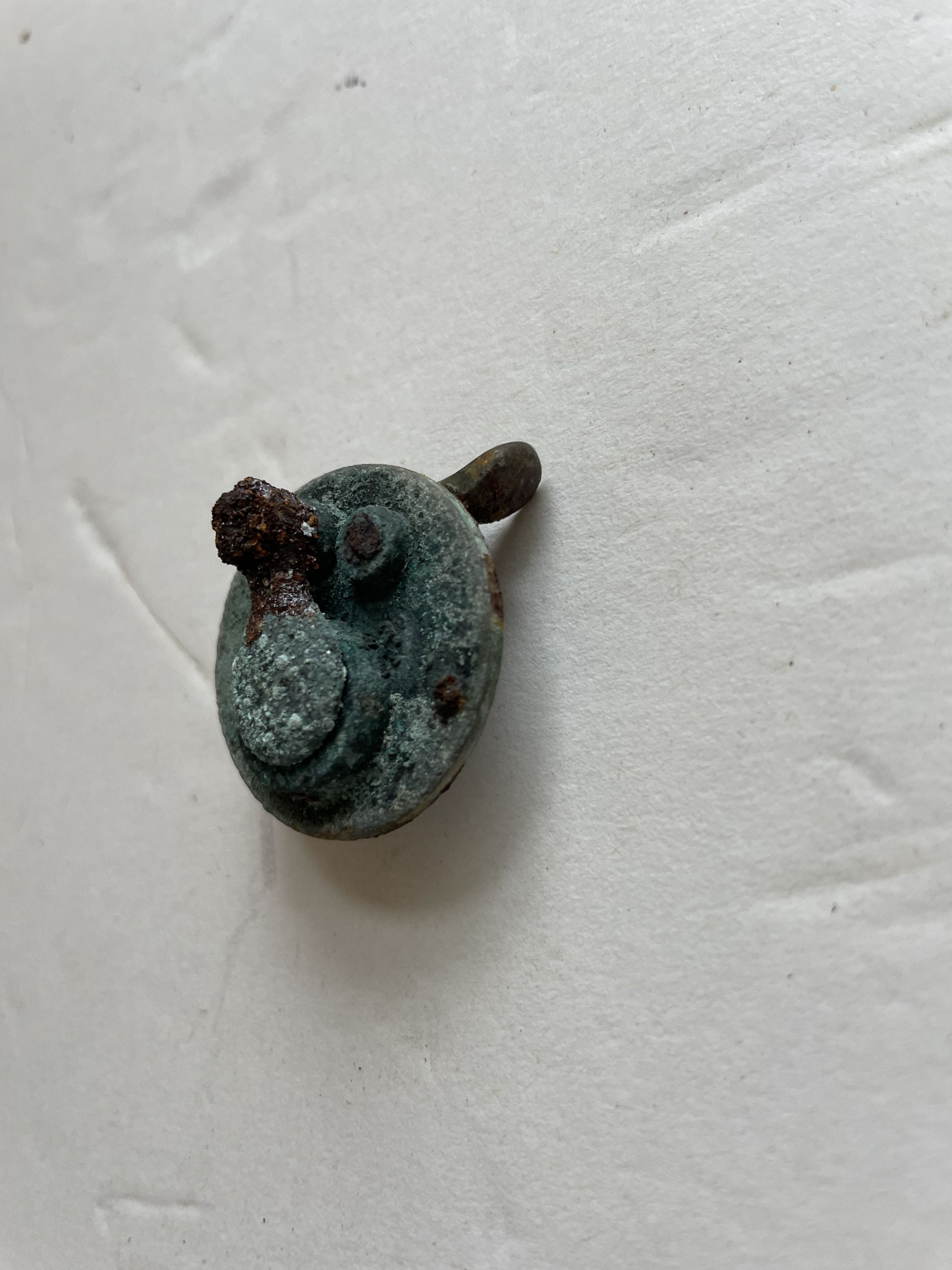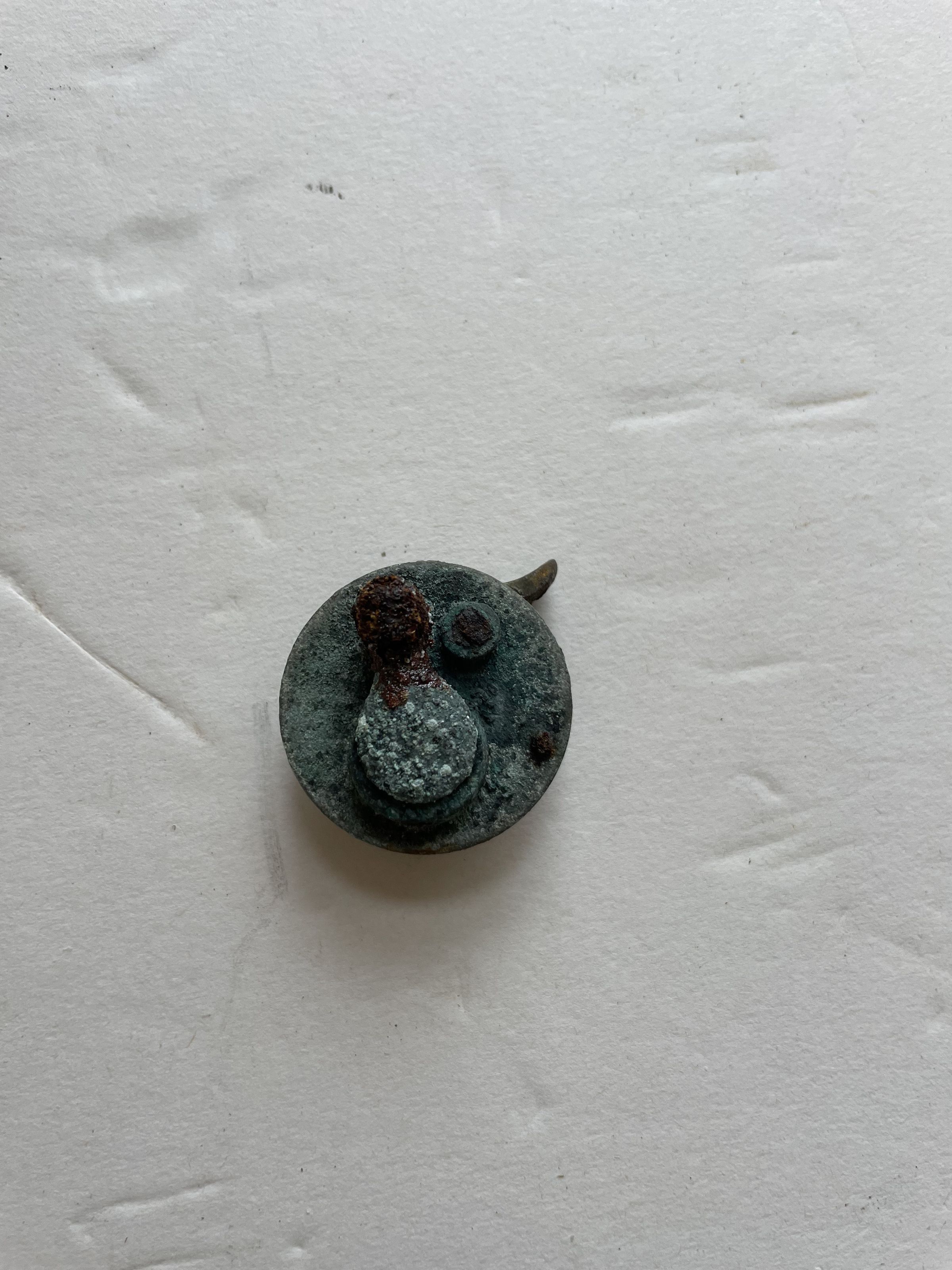 Unidentified brass mechanism. It looks like a kind of gauge or key hole of some kind. The object is rusting a lot.