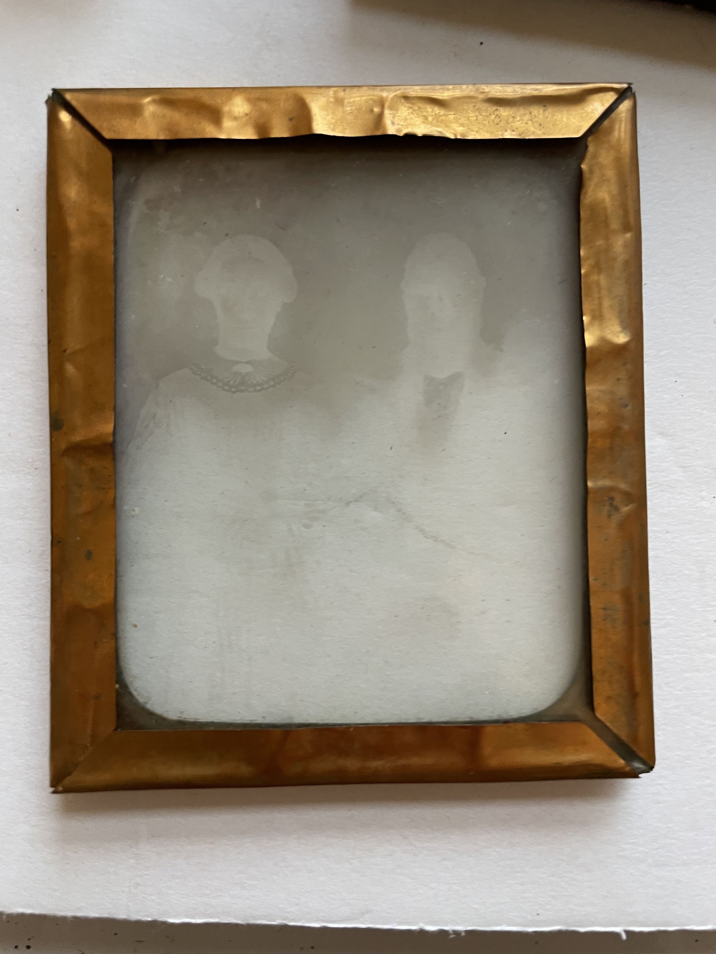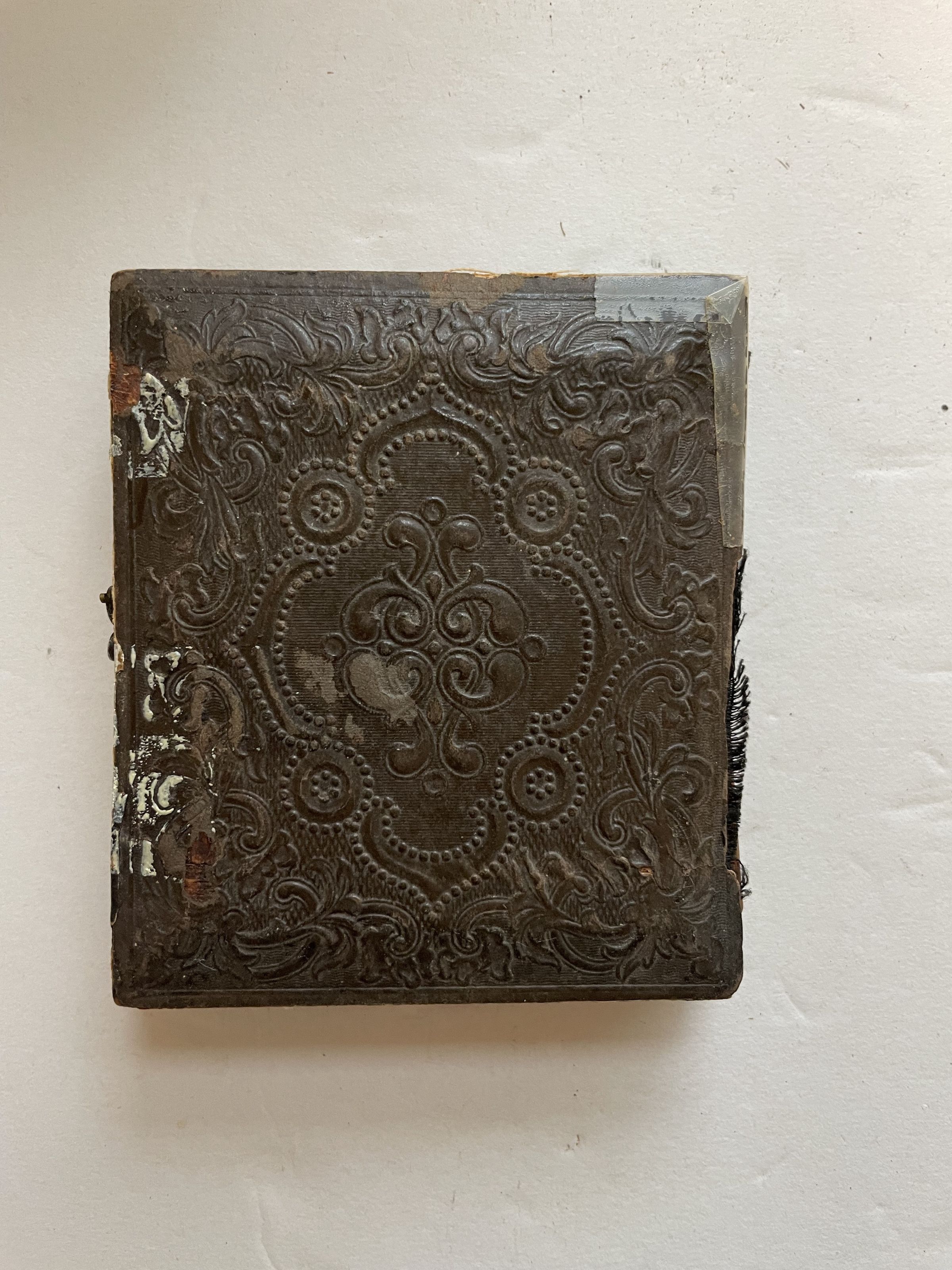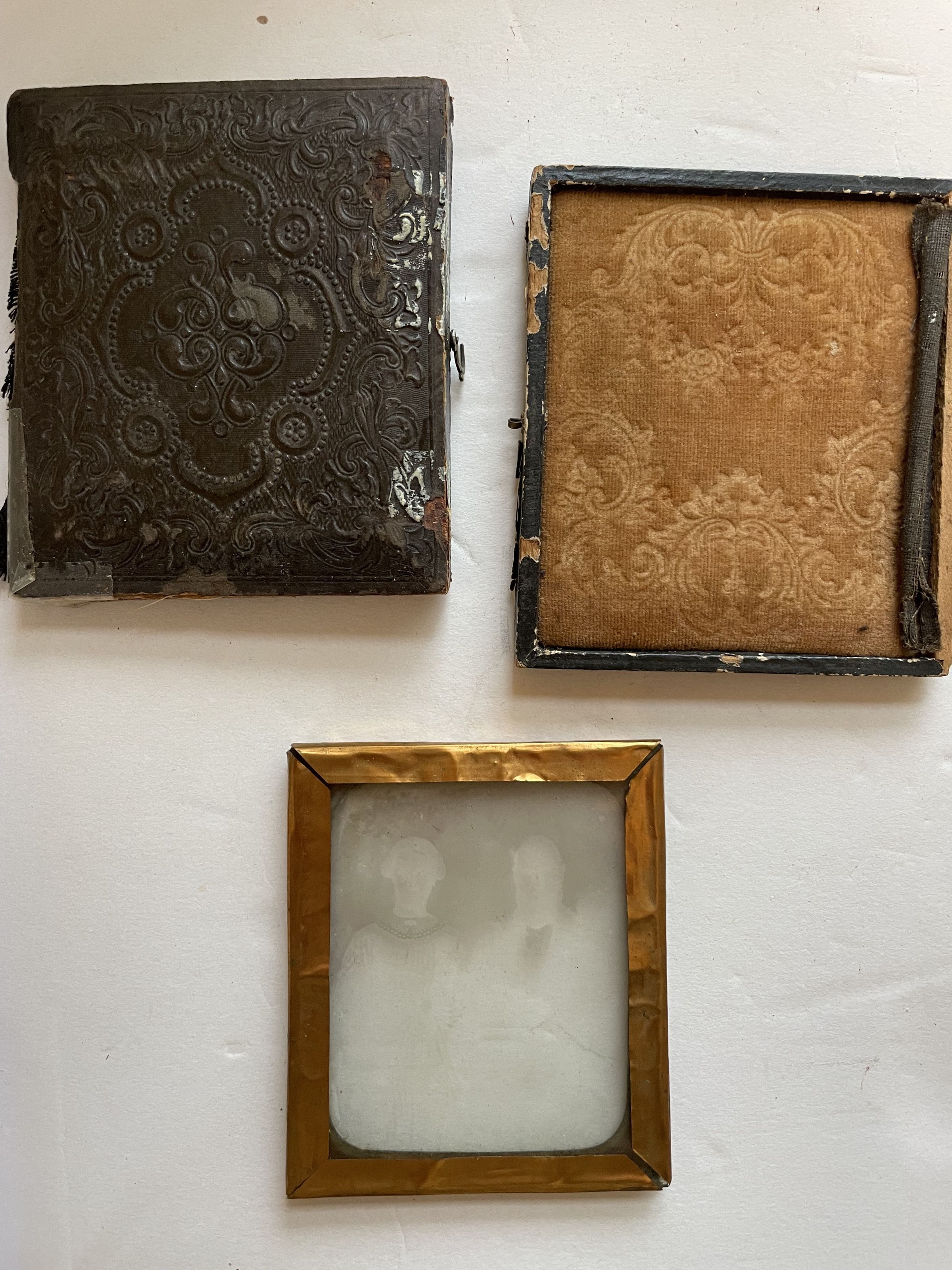 A leather case engraved with designs holding an extremely faded photograph image on glass. The image shows just a man and a woman, but only their faces and heads are visible.