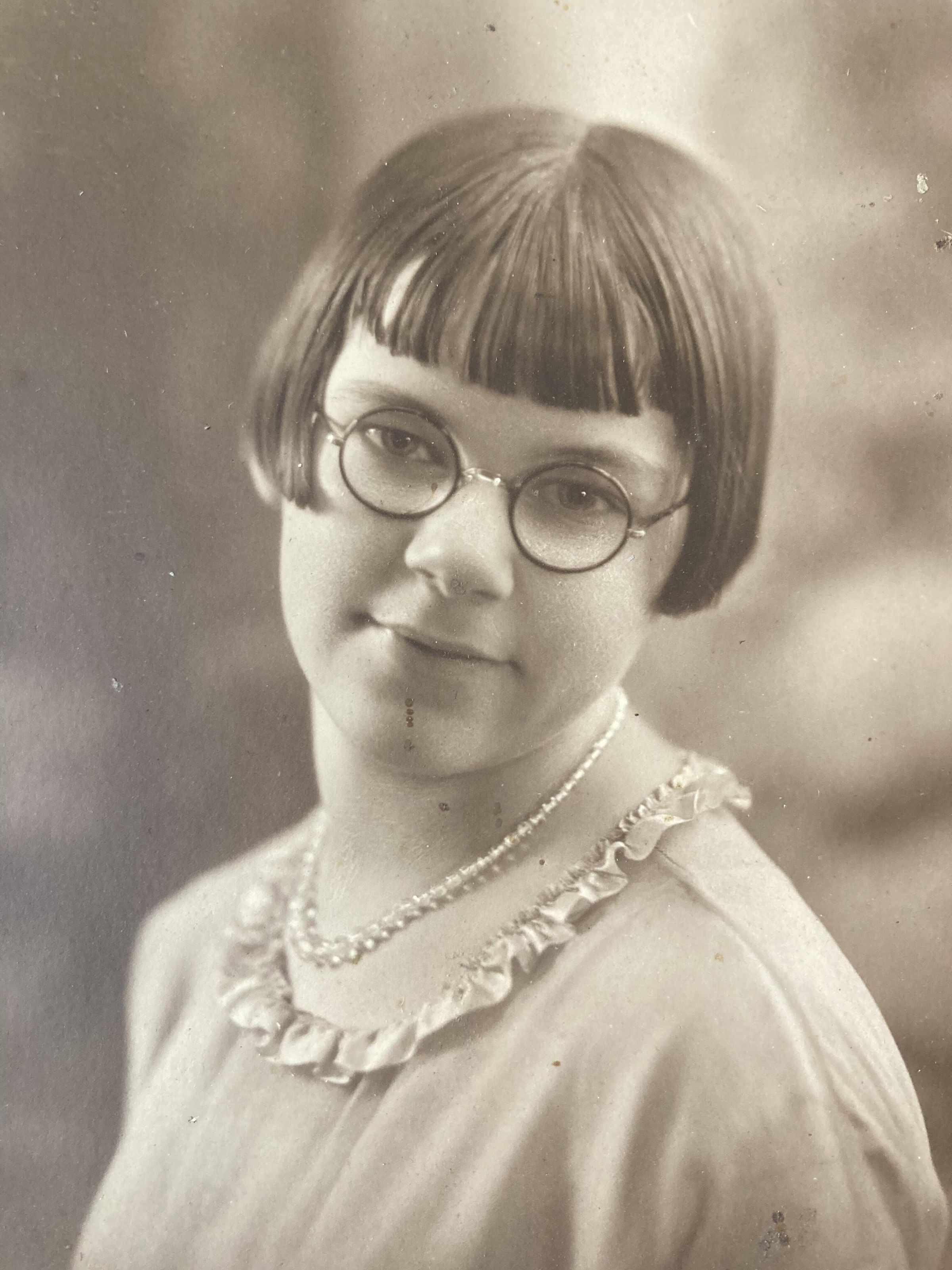 3. Studio portrait: Young woman with dark bobbed hair and round glasses, wearing a beaded necklace and ruffled collar. Signed, "Love Helen"