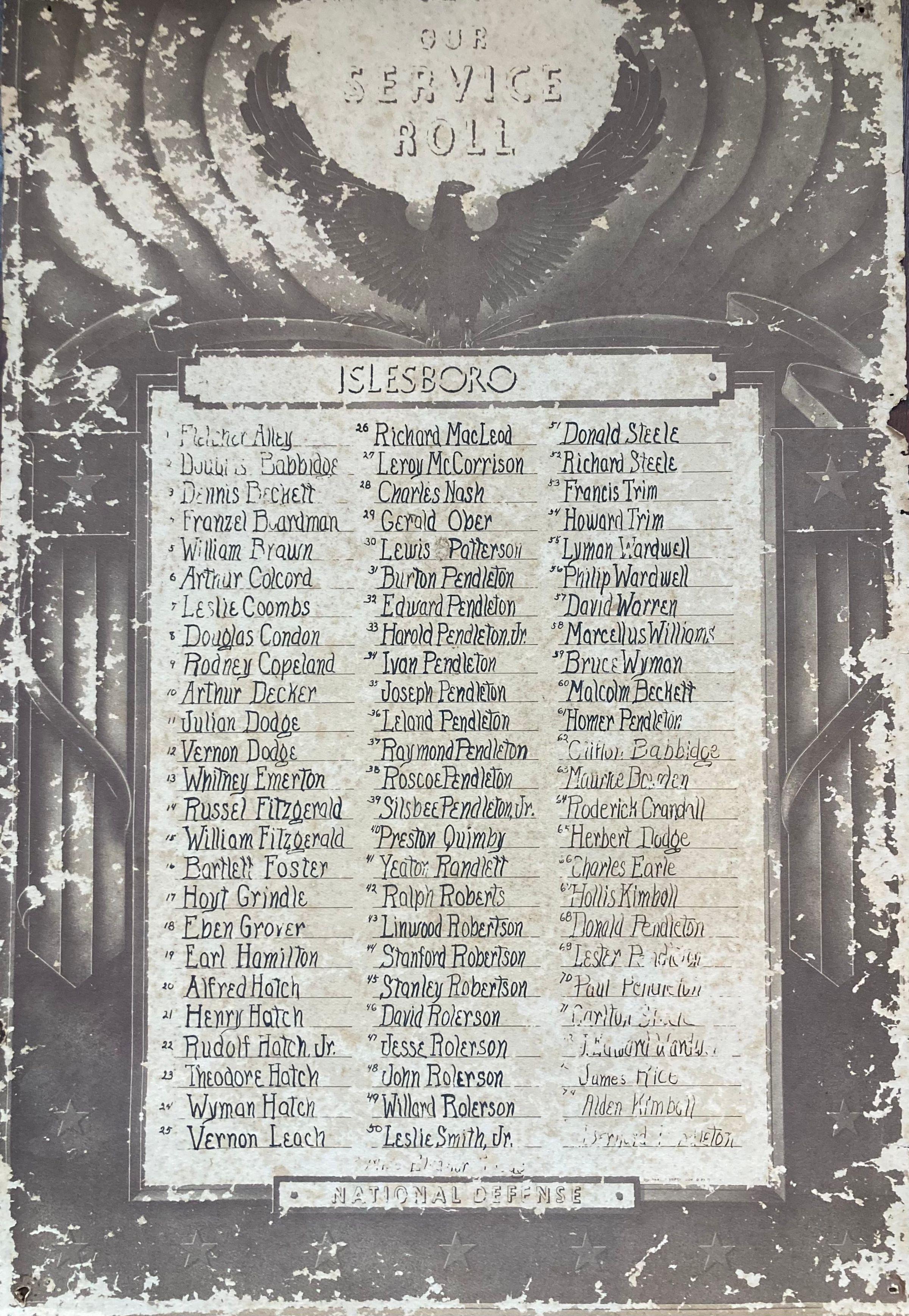 "Our Service Roll: Islesboro National Defense." Poster listing Islesboro's servicemen, World War II vintage, 15" x 22", much worn.