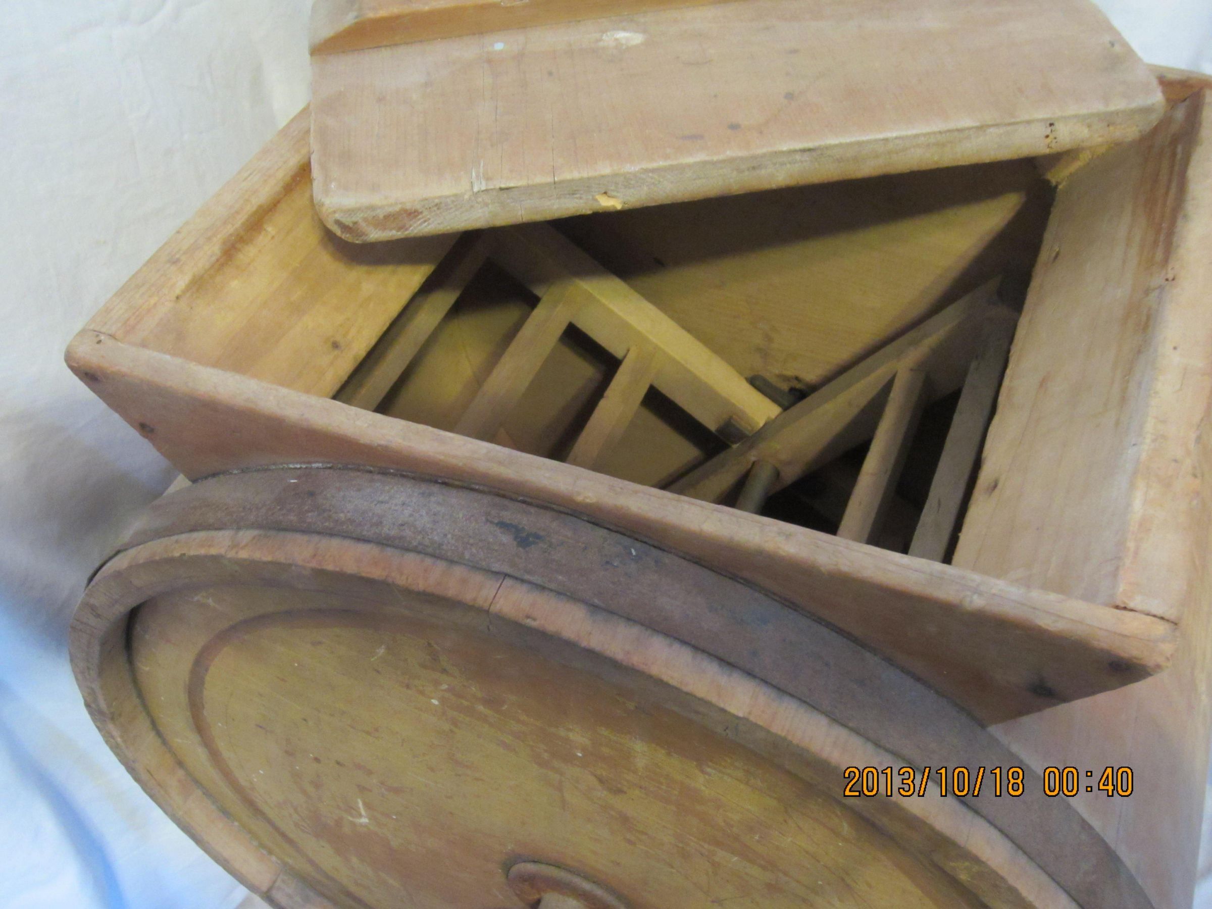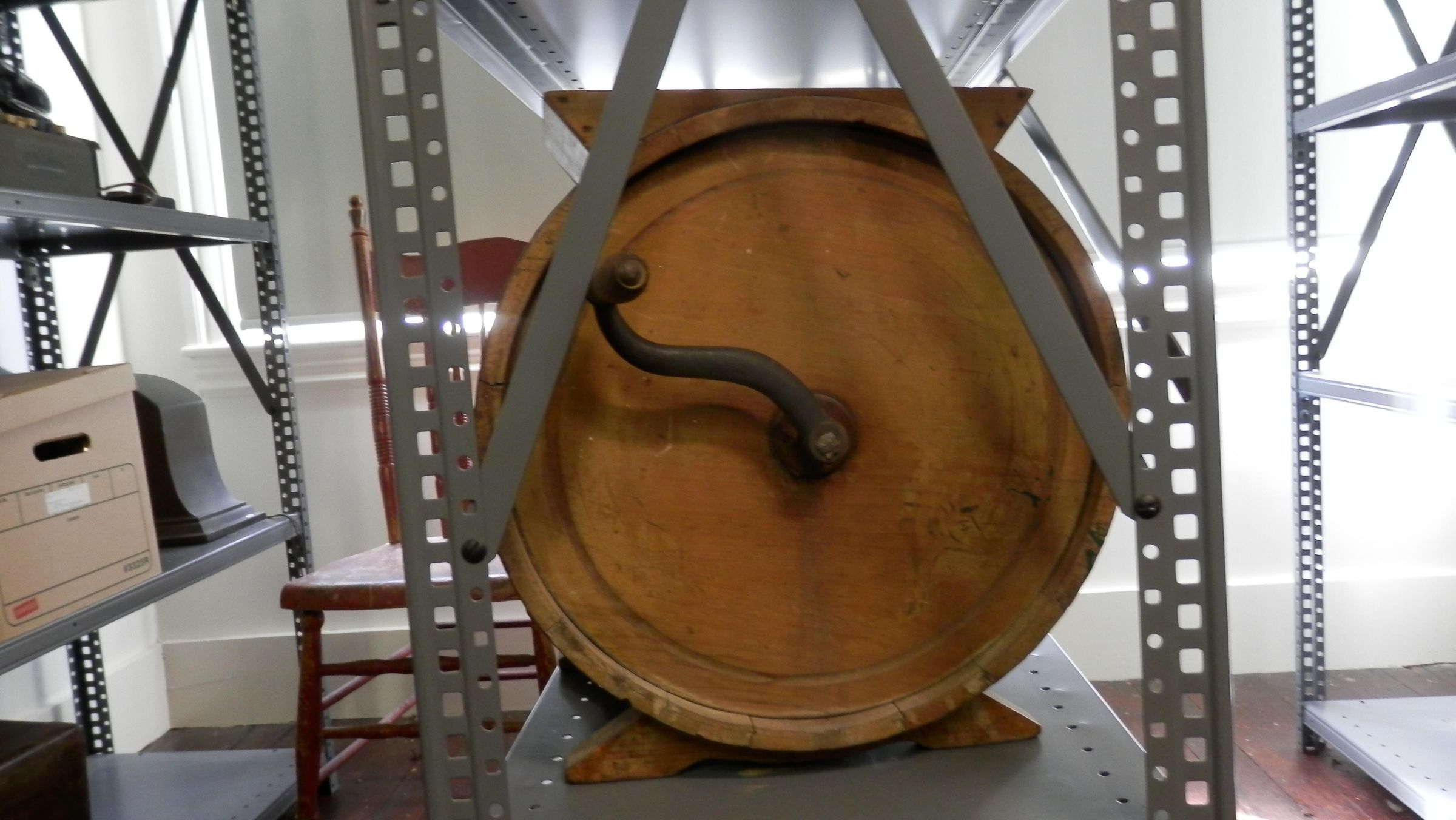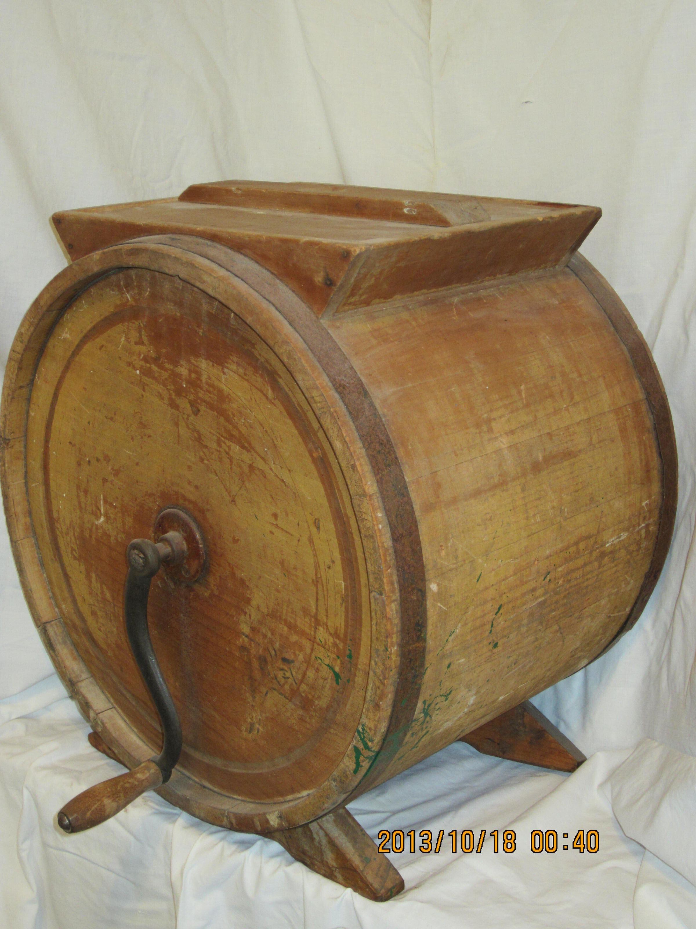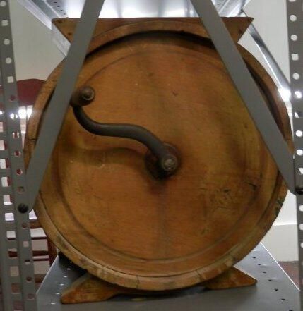 18 1/2 inches x 17 inches x 17 1/4 inches. Wooden crank churn. Has wooden lid that lifts off. Churn is round, has 2 metal bands (rusty) holding tongue and groove construction together. Churn rests on bracket type feet. Has metal crank with wooden handle on same side as a partial cow stencil. Has green paint splashed on it. Two paddles fit together at right angles, thread onto turning rod, removable for cleaning.
