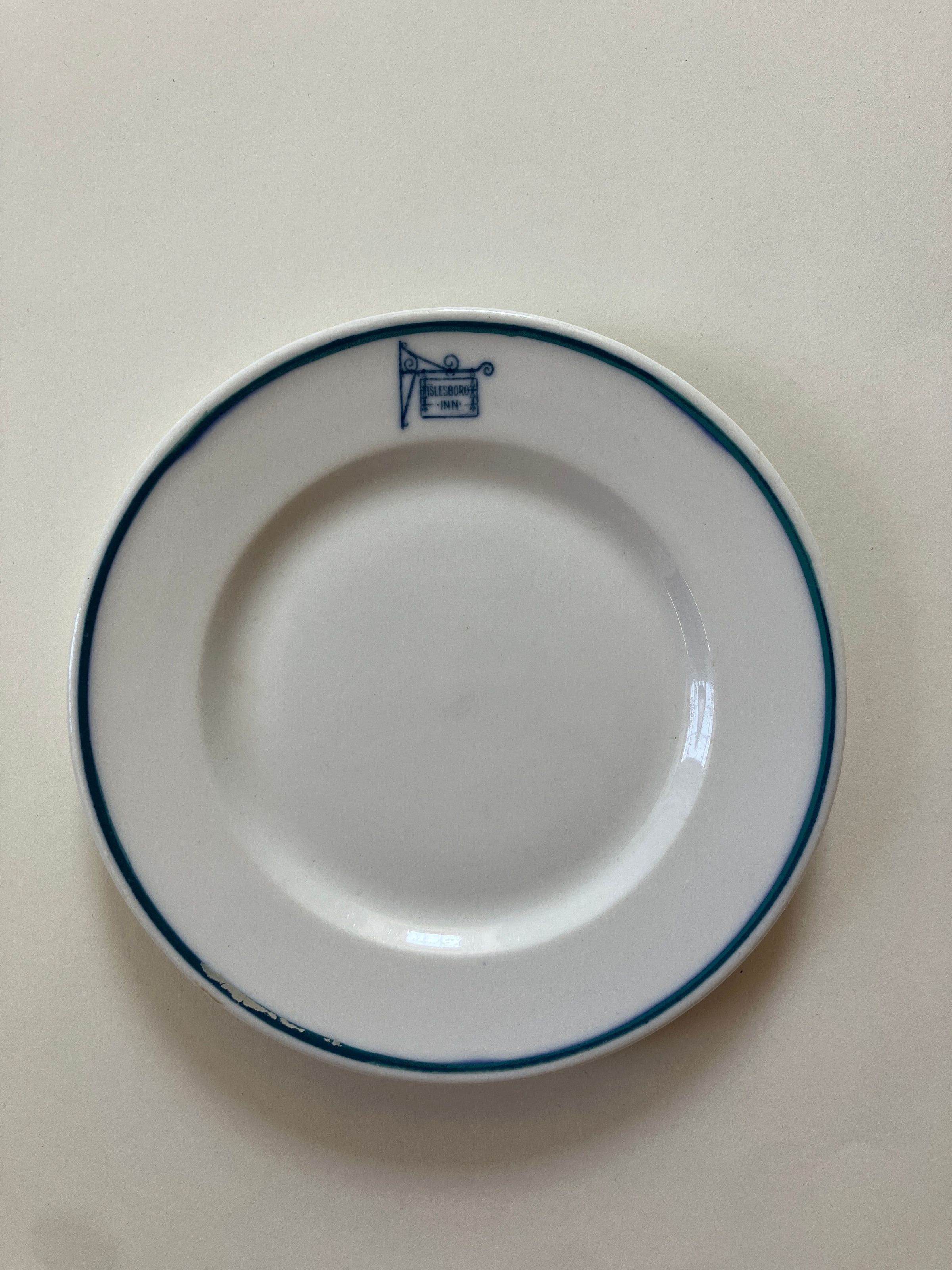 6 inches x 5/8 inch. White ceramic plate with blue border and Islesboro Inn insignia Original Inscription: on front, in border: Islesboro Inn. On back: Lamberton Scammell China