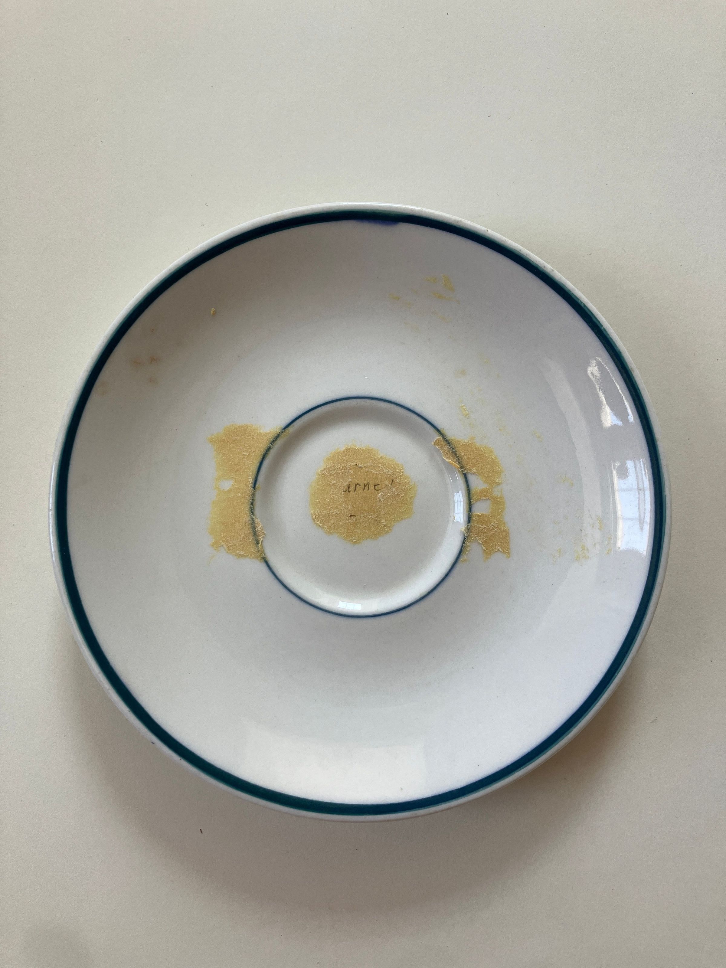 61/4 inches x 7/8 inch. White ceramic saucer with blue border and Isklesboro Inn insignia Original Inscription: on front, in border: Islesboro Inn. On back: Lamberton Scammell China