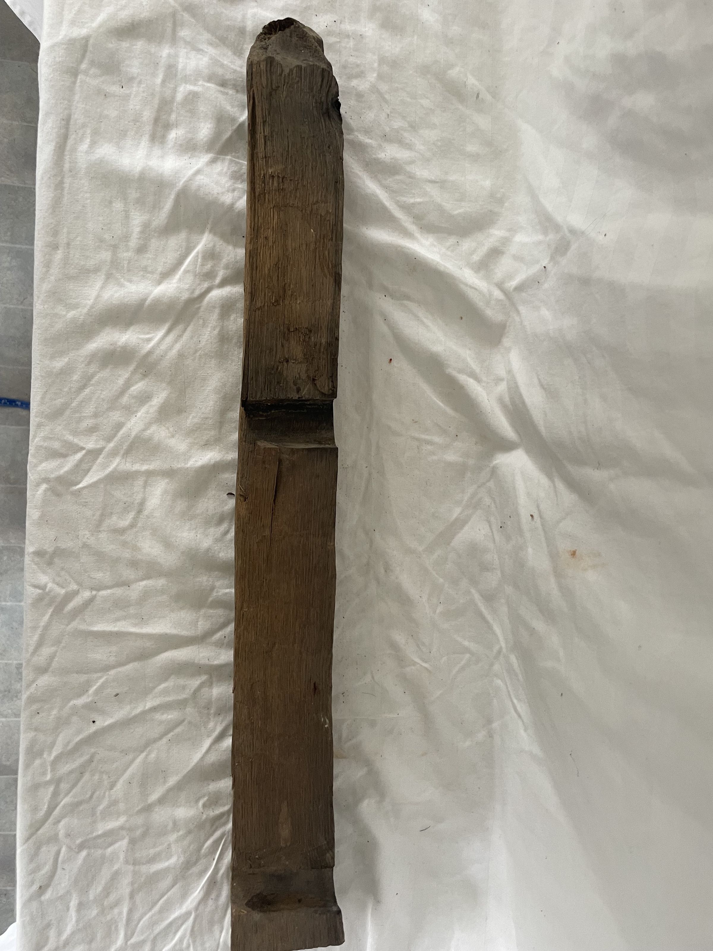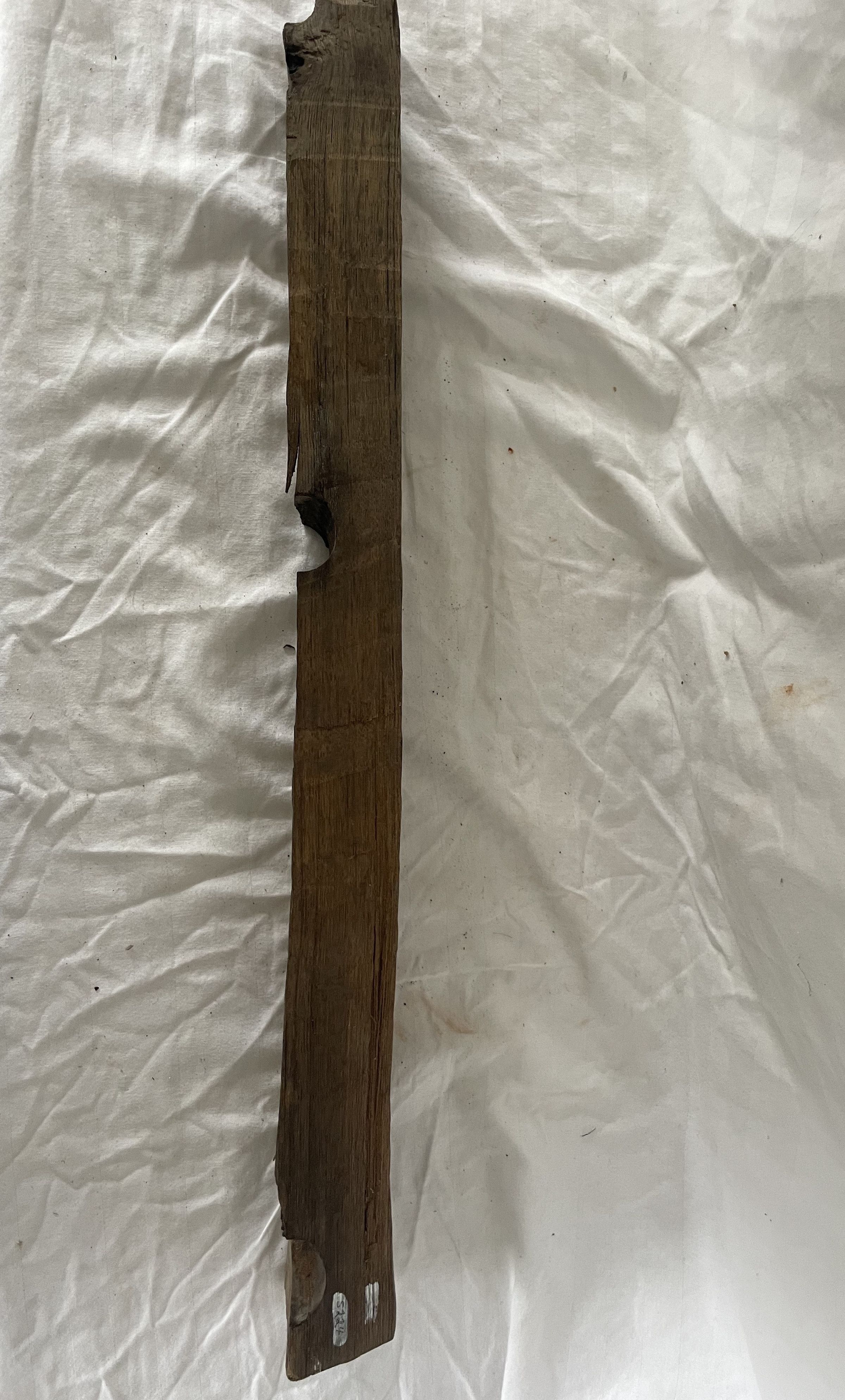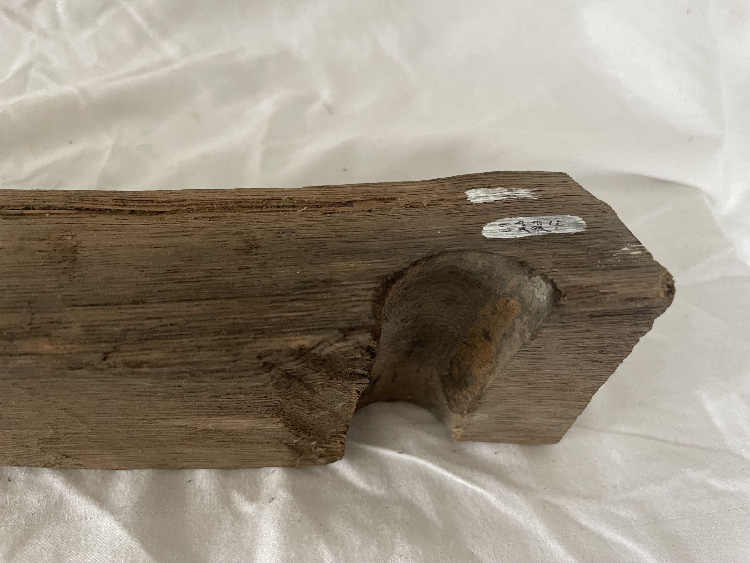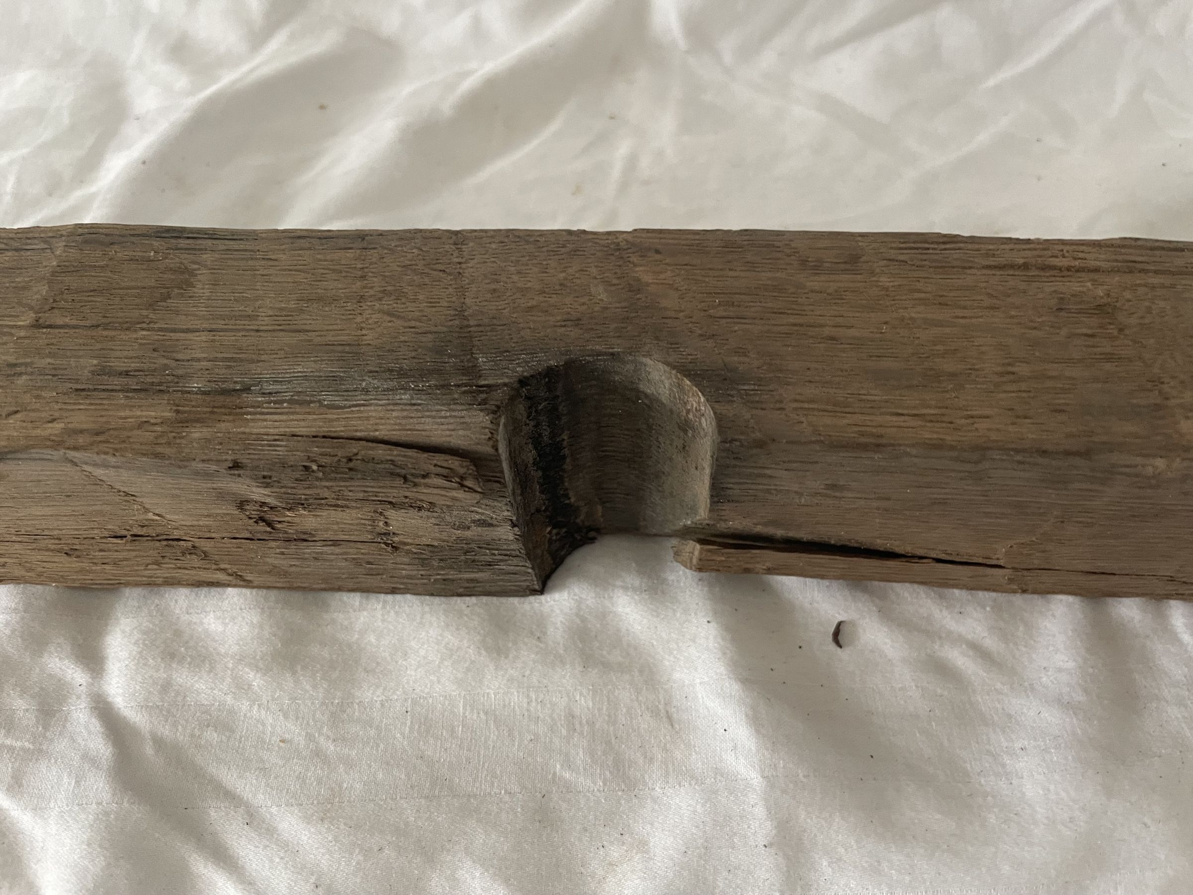 A large piece of wood with semi- circle holes cut into it at three spaces on a flattened edge. Most likely from a frame of some sorts.
