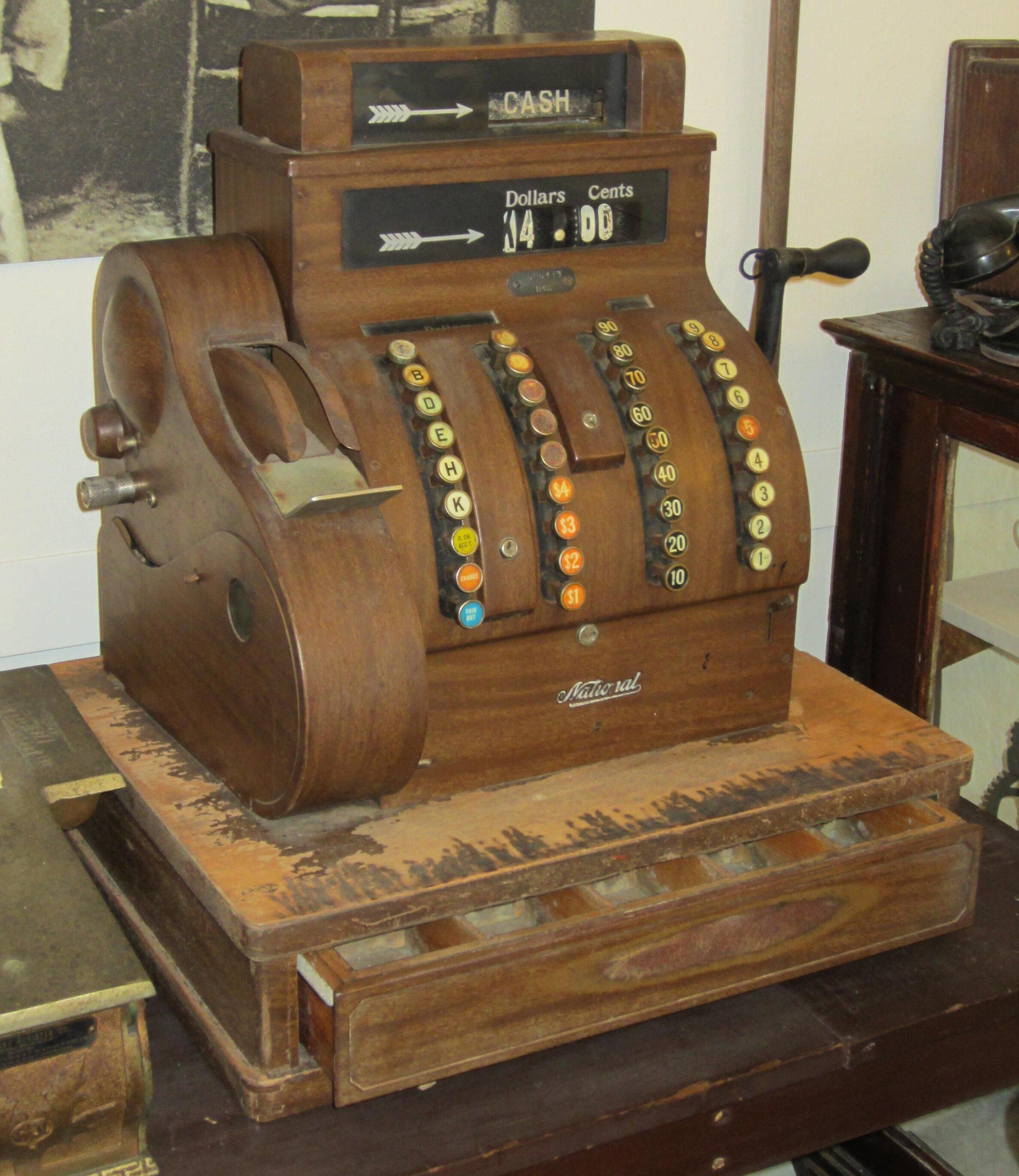 22 3/4 inches x 20 3/4 inches x 16 inches. Simulated wood, metal register is on wooden base. Metal panel opens on one side to replace receipt paper, on other side is a crank. On front of machine are four rows of buttons that can be pushed in. First row has letters and phrases; second, red buttons going from $1 to $9; third, black buttons from 10 to 90; the fourth, white buttons, except for red 5, going from 1 to 9.
