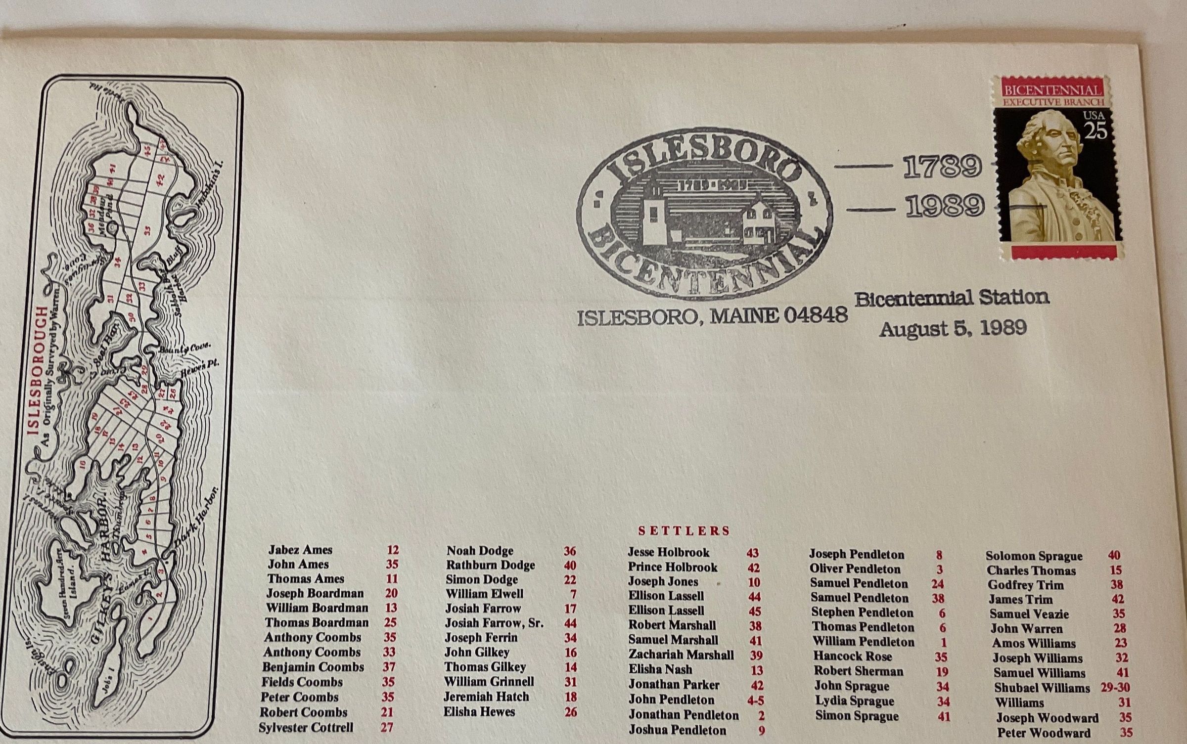Islesboro Bicentennial envelope showing map of "Islesborough" with original owners identified by lot number.