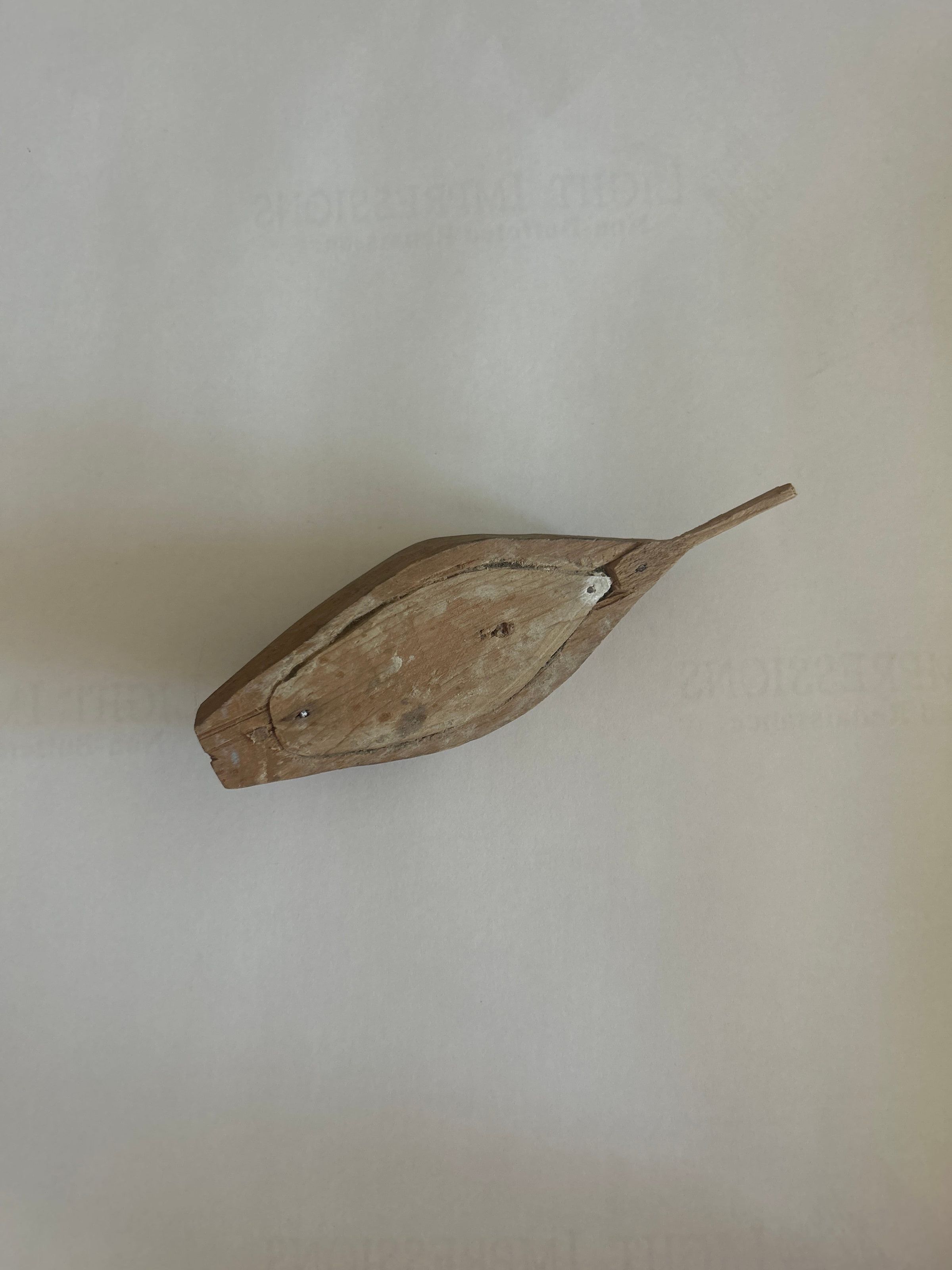 5 7/8 inches x 1 3/4 inches x 1 1/2 inches. Carved sailboat with lead on keel and long thin prow. No sails.