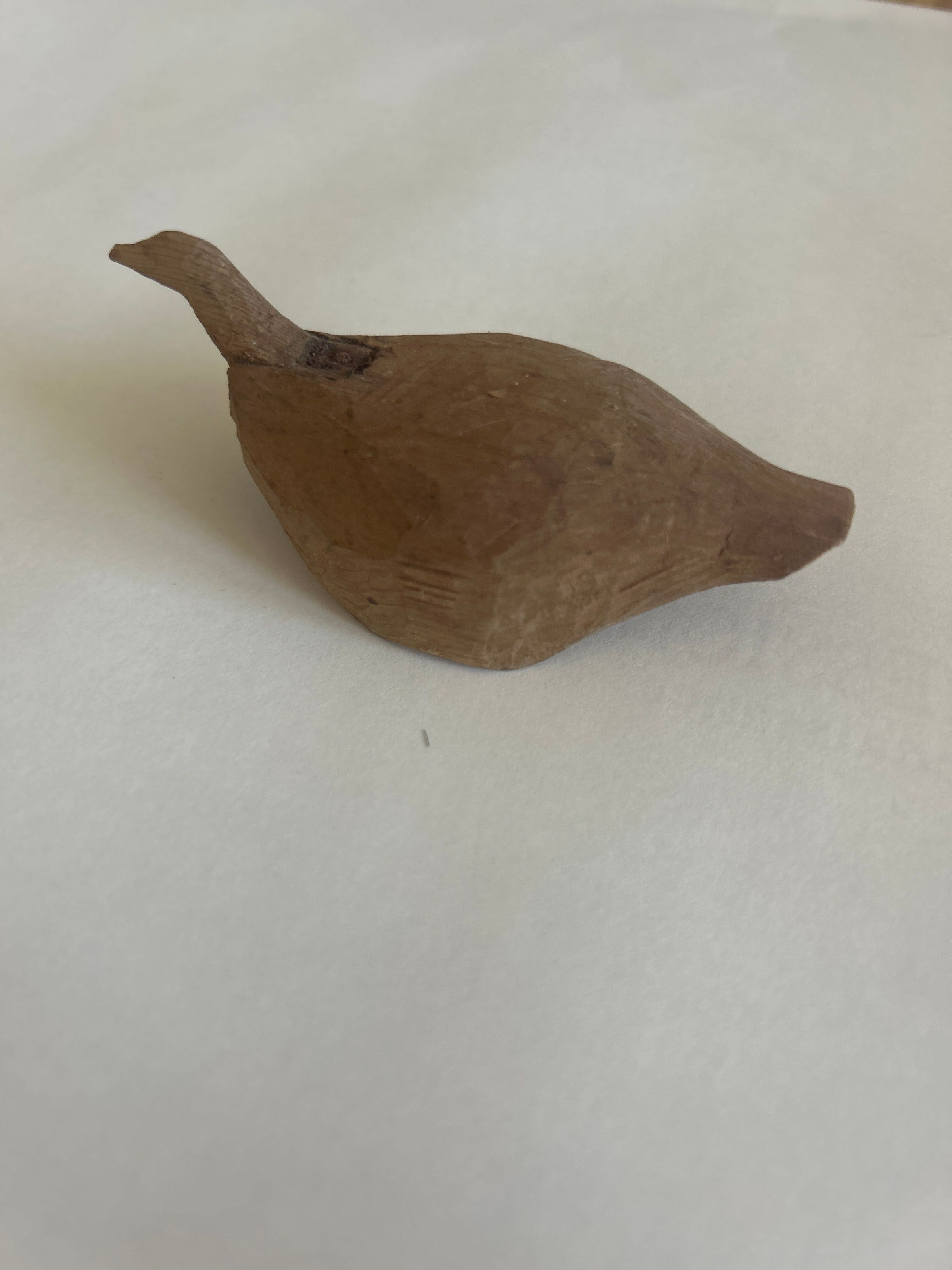 3 7/8 inches x 1 7/8 inches x 1 5/8 inches. Carved duck. Head and neck secured with nail. Personal Associations: Probably carved by Kasper Murphy