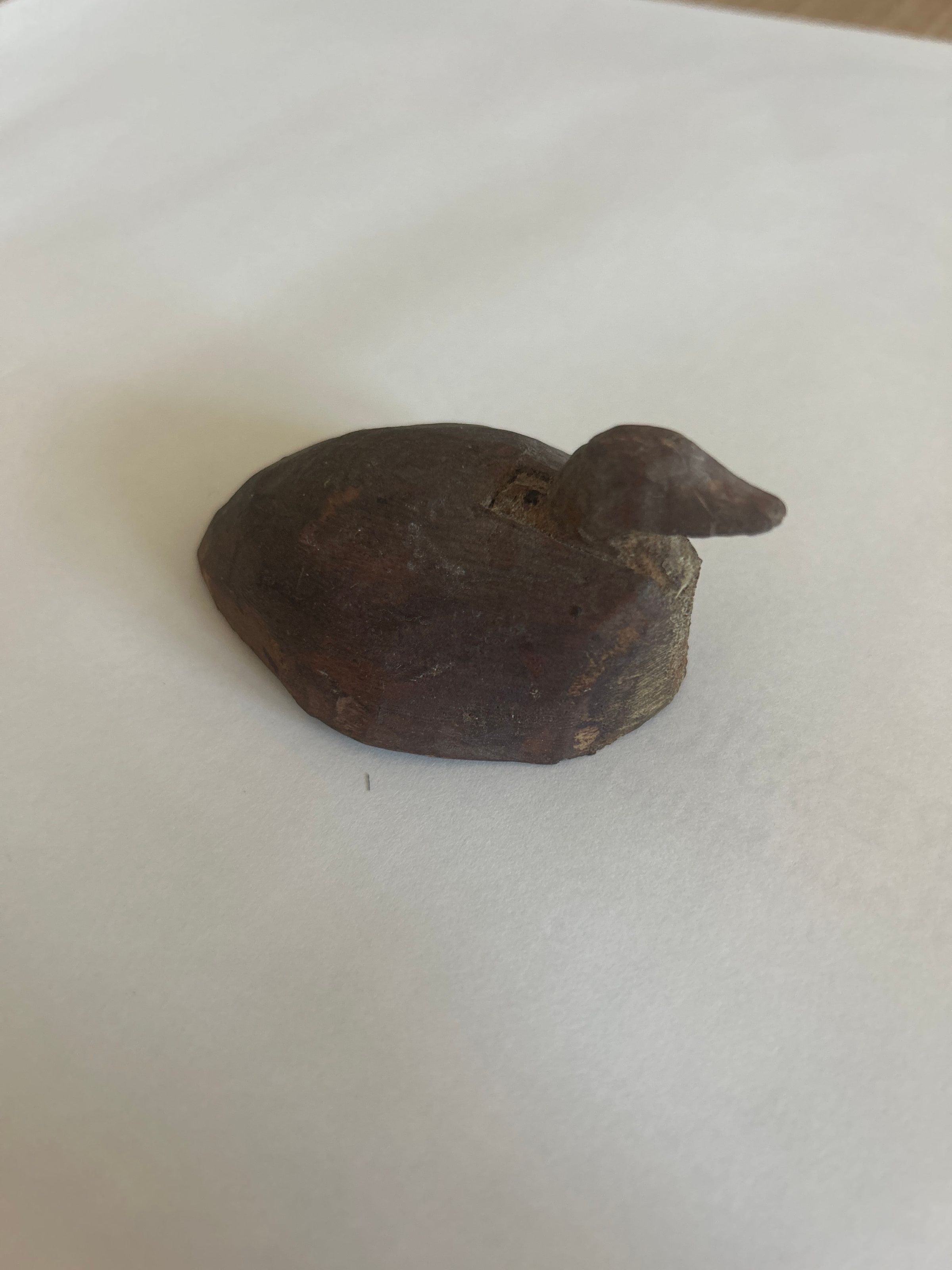 3 1/4 inches x 2 inches x 1 3/4 inches. Carved duck. Head and neck secured with nail. Personal Associations: Probably carved by Kasper Murphy.