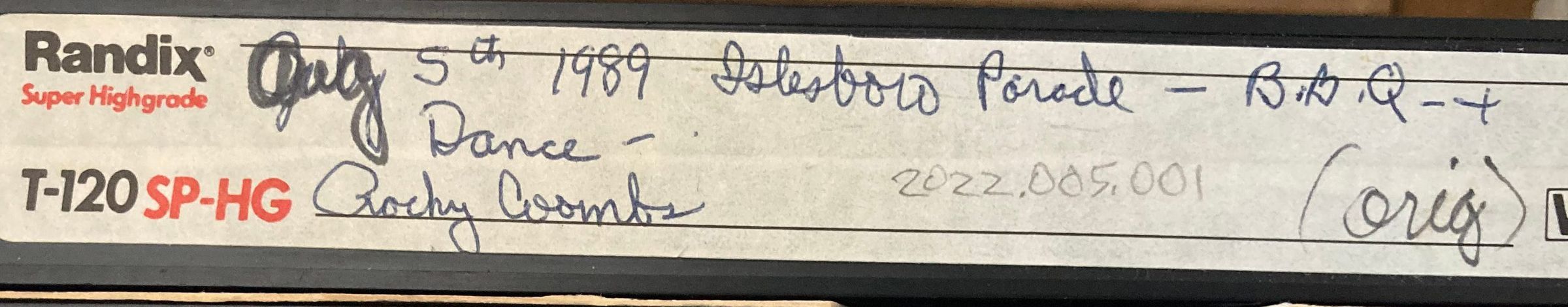 Video recording dated August 5, 1989. Label lists the Islesboro Parade, barbecue, and dance. Original recording by Rocky Coombs.