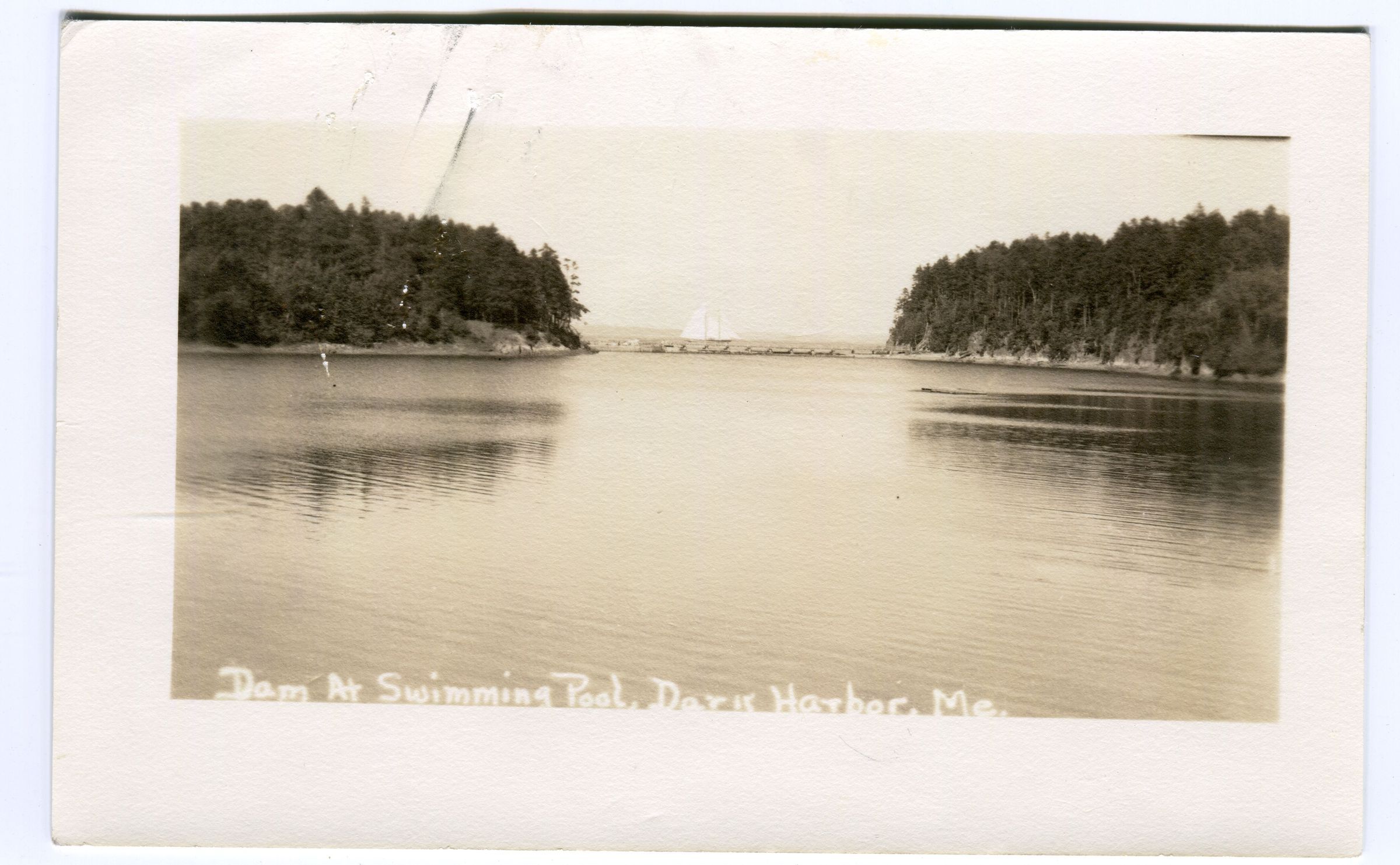 Postcard showing Dark Harbor Pool. Written on front is "Dam At Swimming Pool, Dark Harbor, Me."