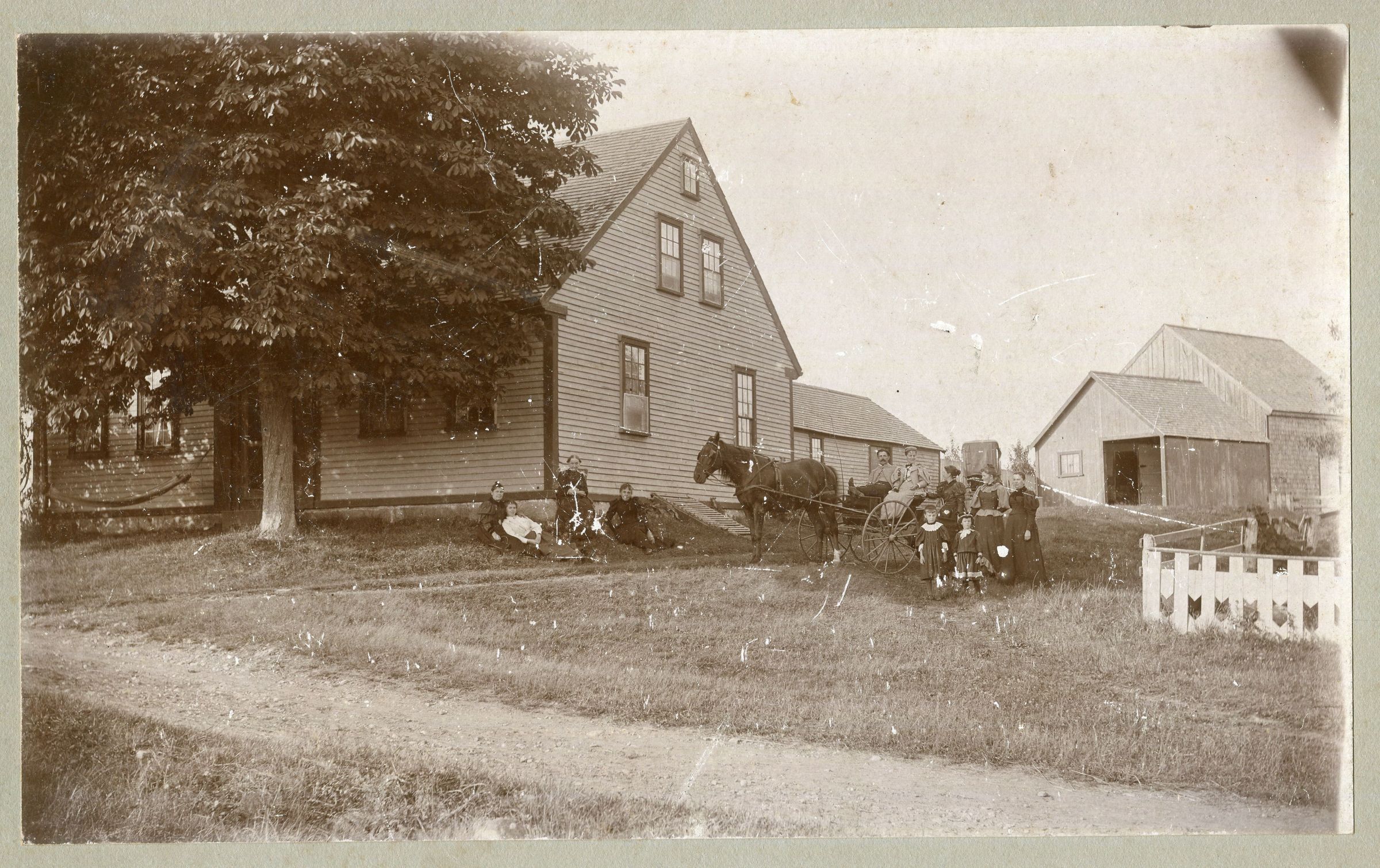 5x8 photo, mounted, showing a two story cape style house with an ell and detached barns. Probably late 1900's. A group of people (12) and horse and carriage are outside the house. On back is written "Lincoln Gilkey house"