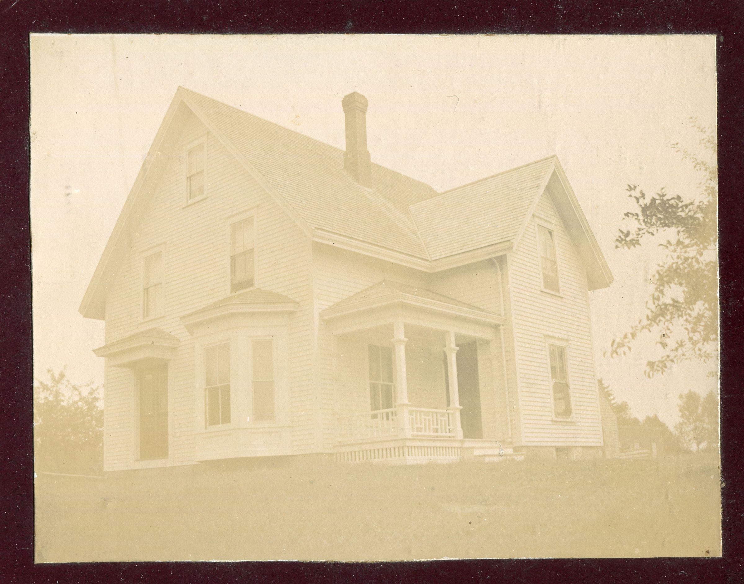 3.5"x4.5" photo of 2-storey house, farmhouse style, with porch in the ell, and a bay window. On back is writtern "Loranus and Nora Pendleton House. It may have been built by Joseph K. Pendleton, Loranus' father."
