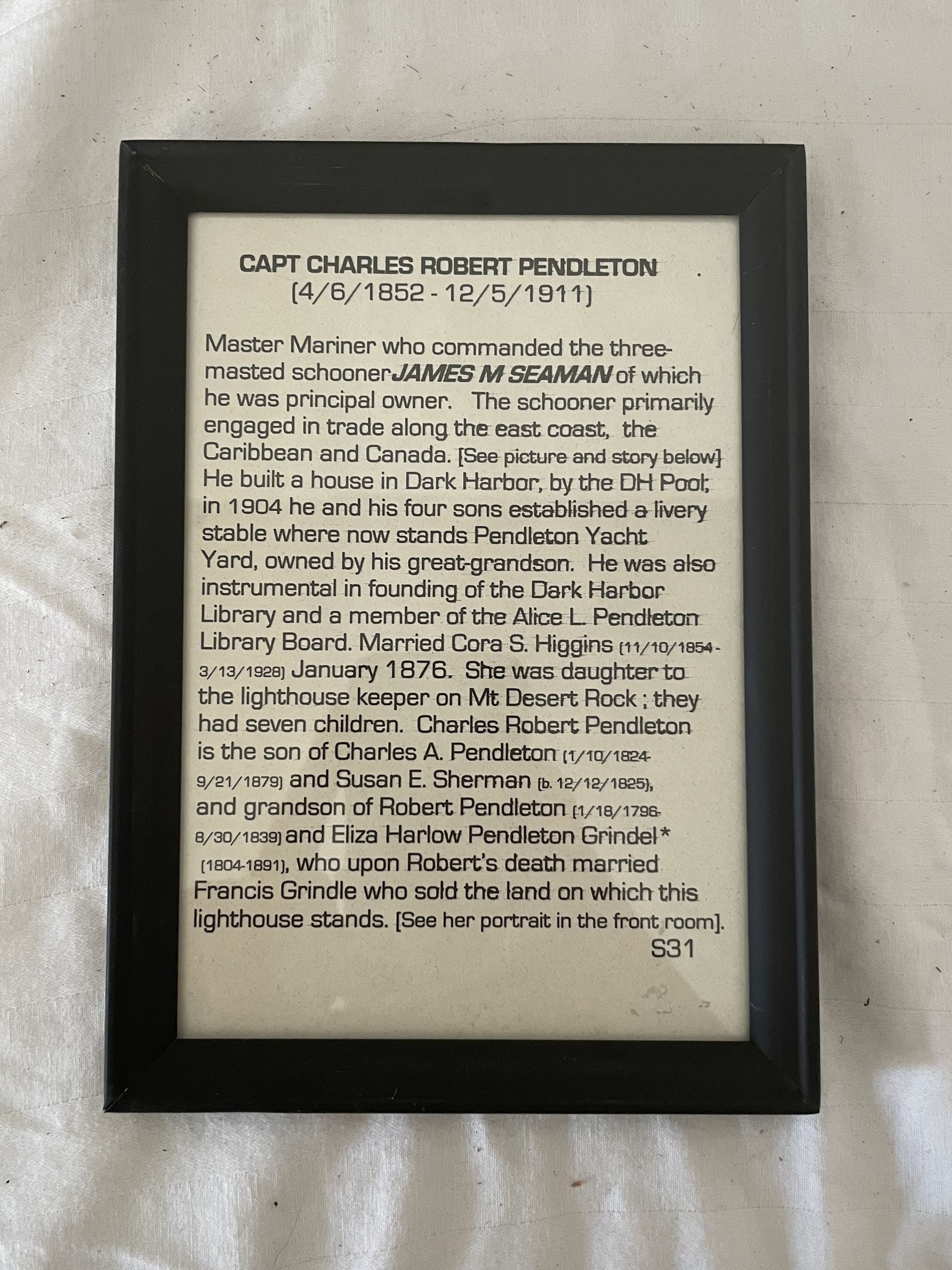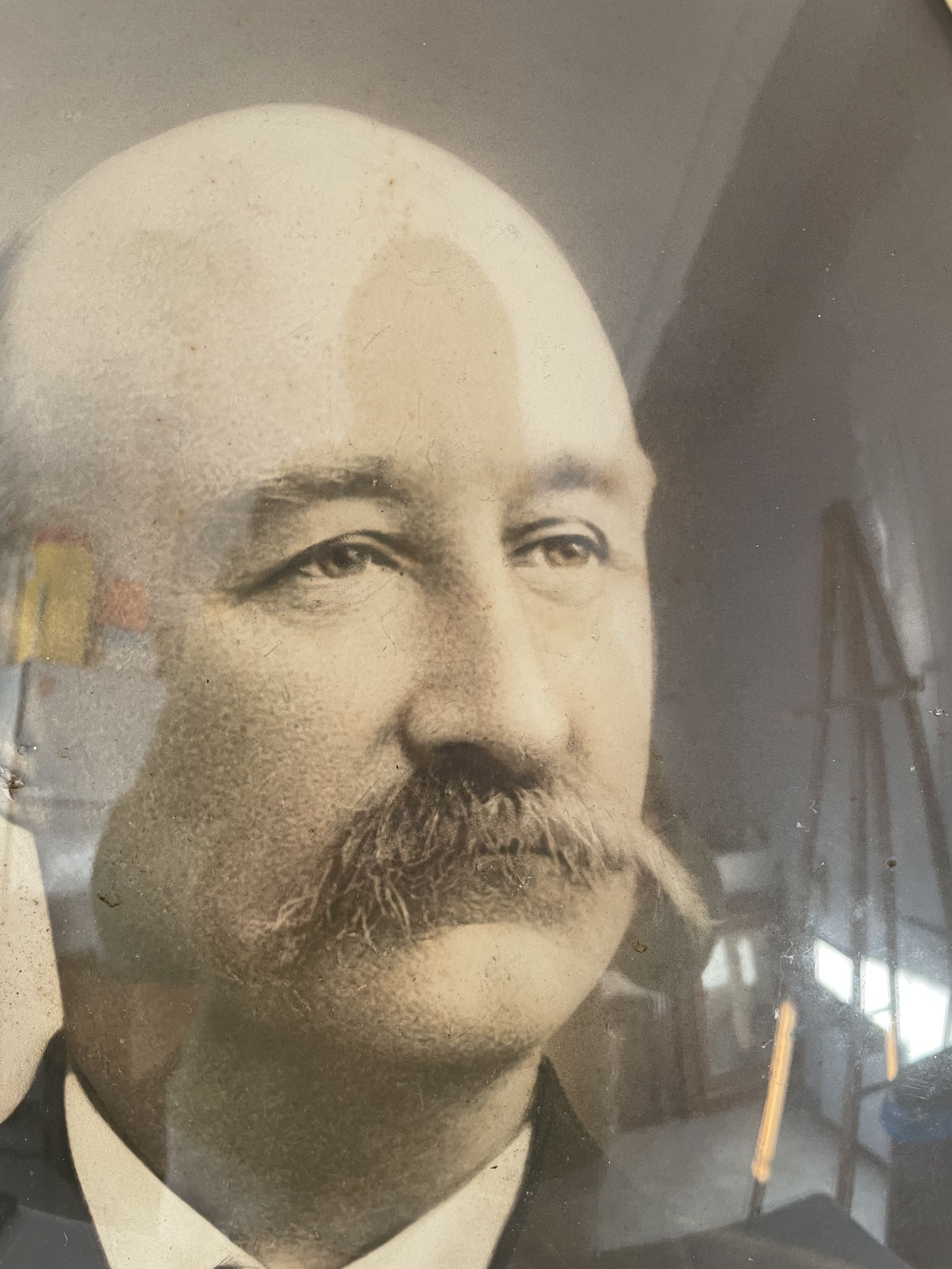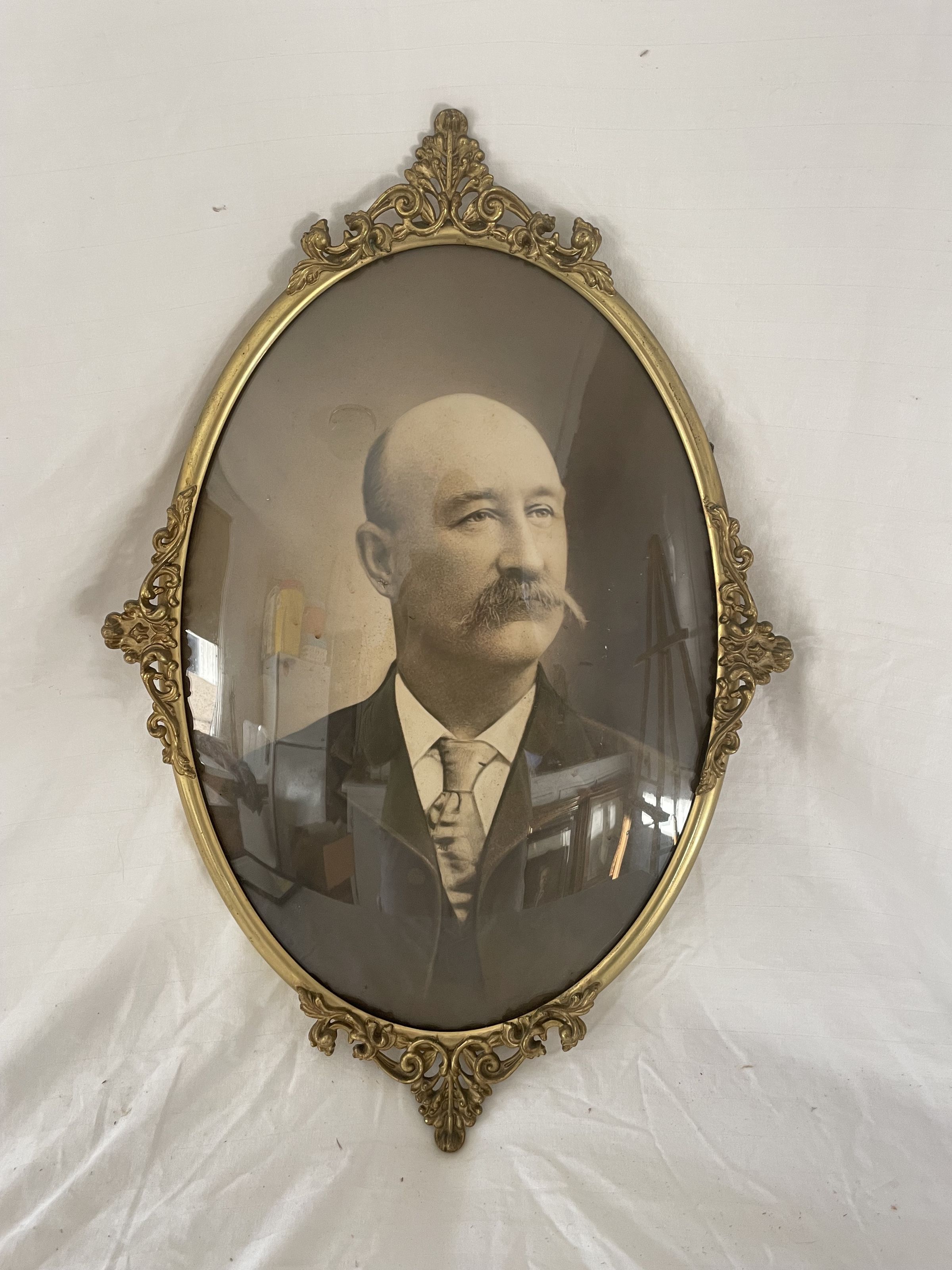 The an oval shaped photograph of a man, identified as captain Charles Robert Pendleton. The image features a man from the chest up wearing a suit, white collared shirt, and tie. He has a large mustache and is looking over his left shoulder, gazing past the photograph. The frame is gold and oval shaped, with four decorative molds at the top, bottom, and both sides of the frame.