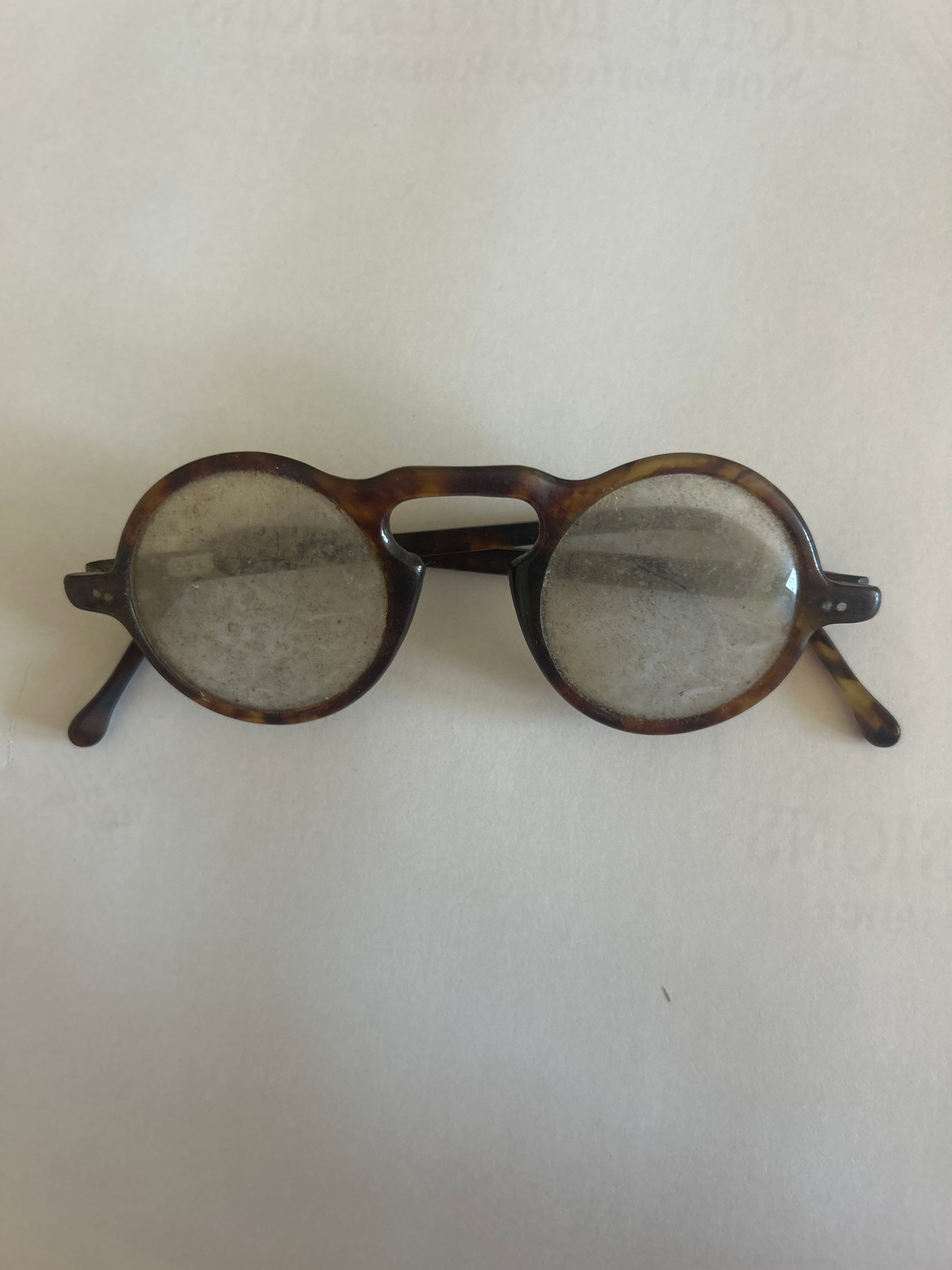 5 inches x 1 3/4 inches Frame 5 inches Stem Round glass lens with brown plastic frames