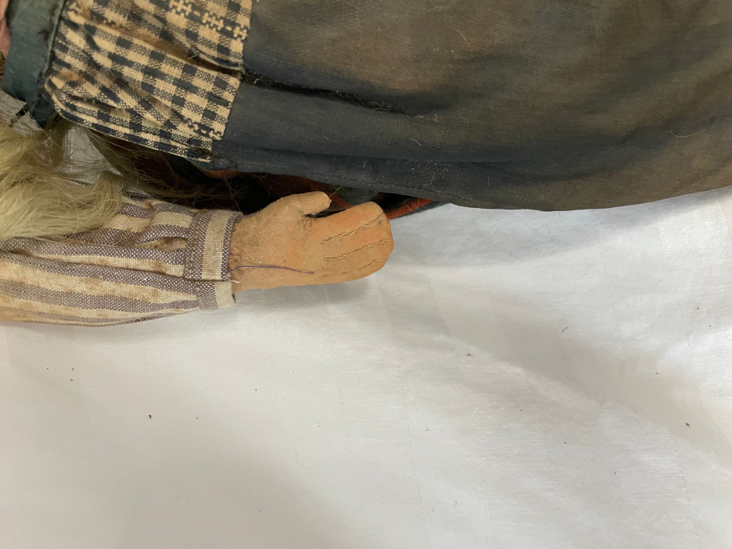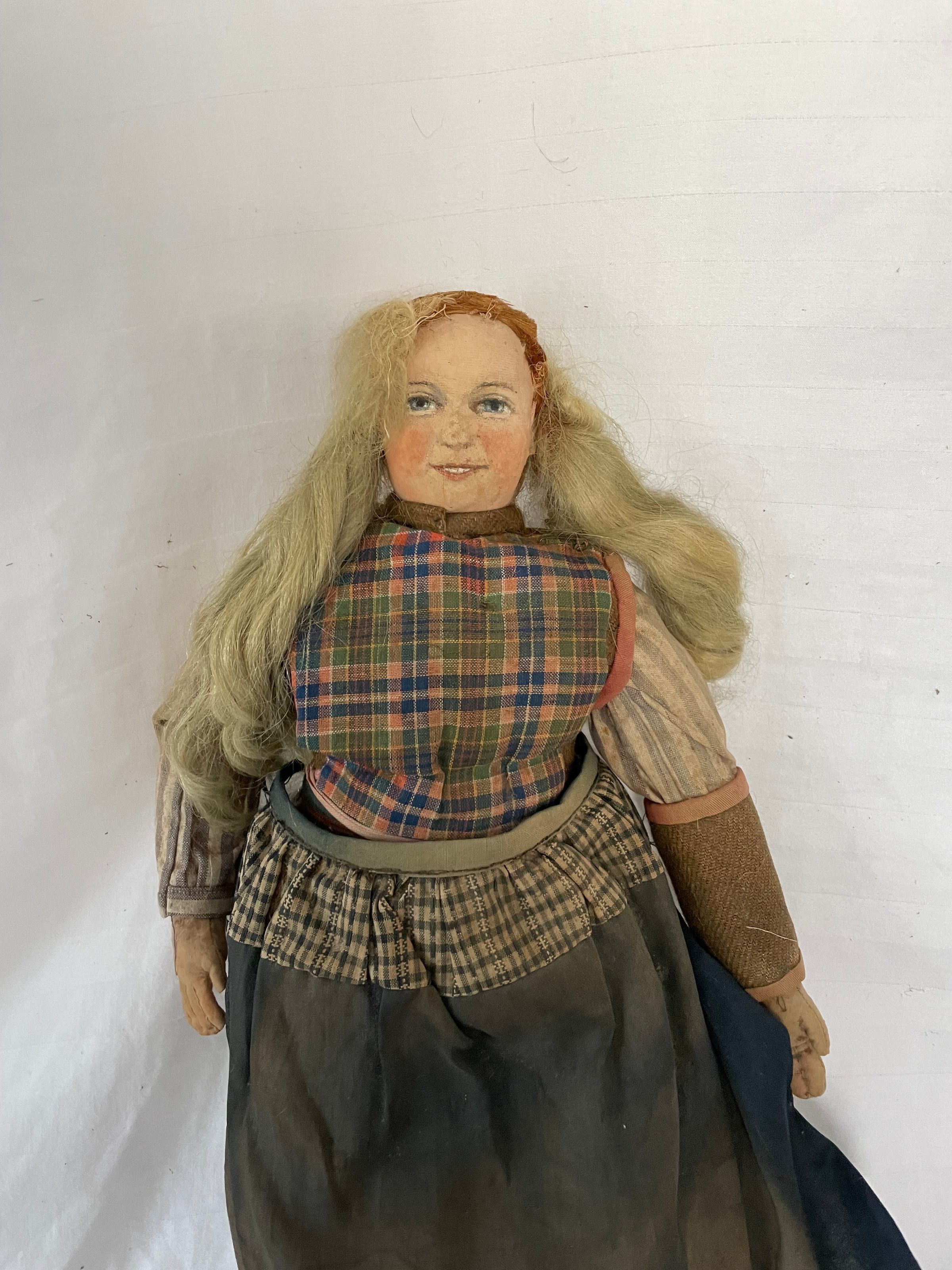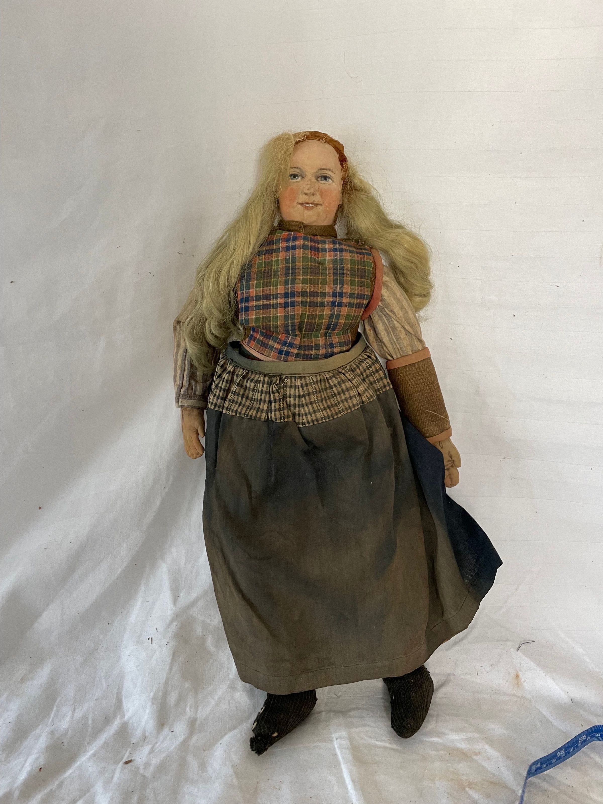 A doll with blonde hair and made of mostly cloth. Labeled doll from Holland, donated by Alice L. Pendleton. She has a nice face.