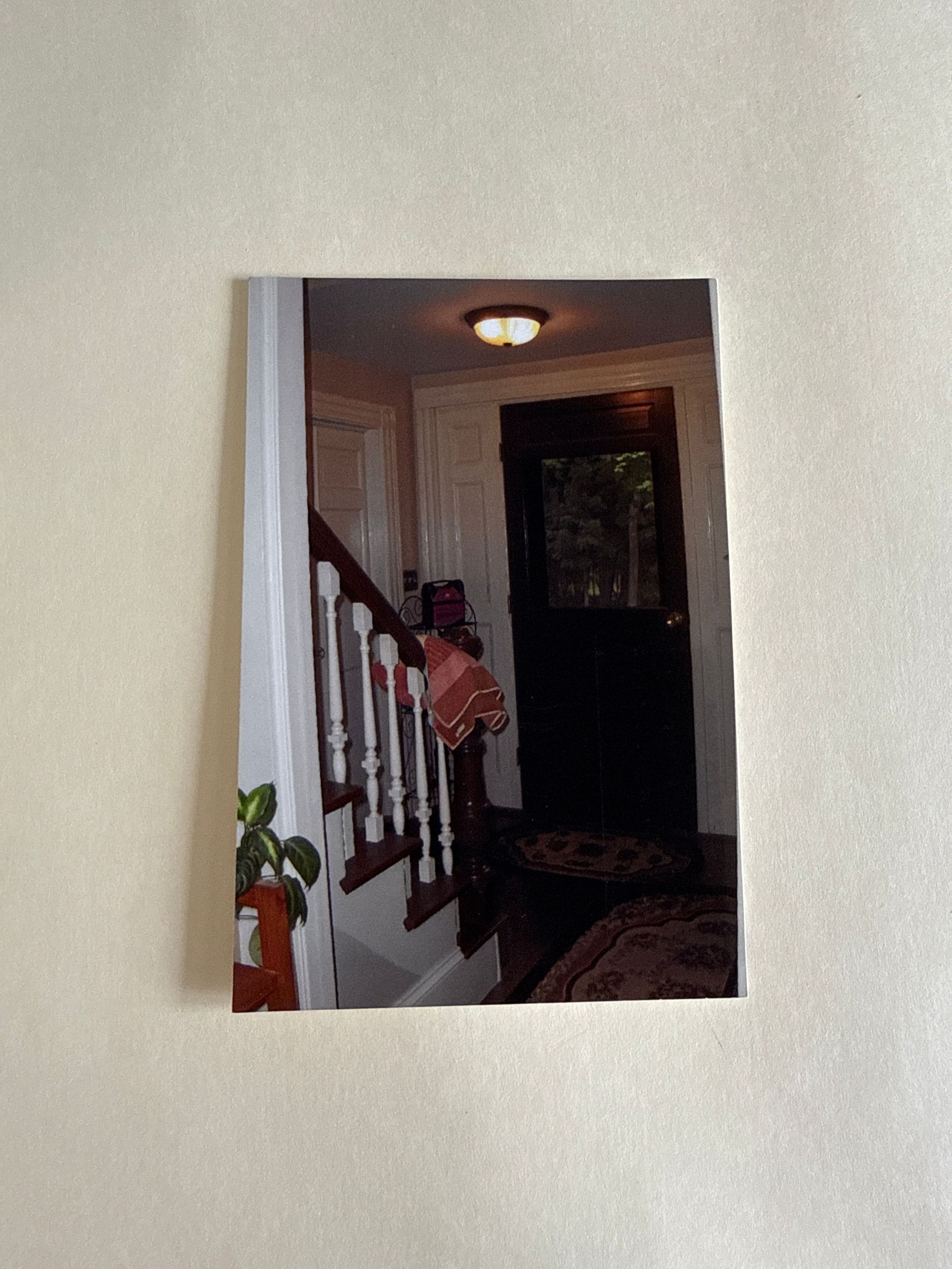 colored photo, 4"h x 6"w, of 972 Main Road, former home of Henry Marion Coombs, currently lowned by Craig Leach (July, 2012). Inside of rount door, with staircase to second story.