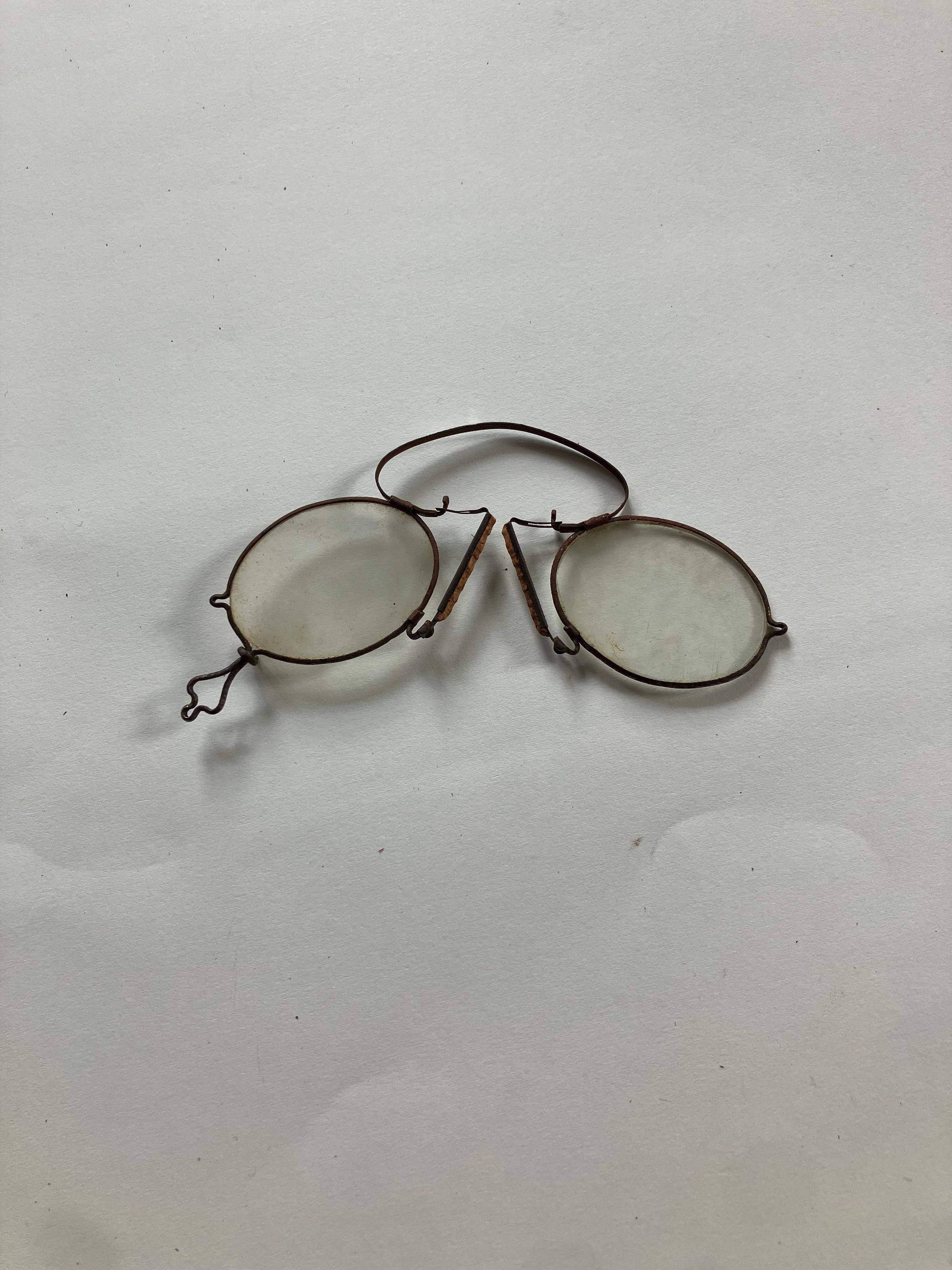 Pince-nez, 4 inches x 2 1/4 inches. Oval glass lenses in wire frame with a loop on the frame for a ribbon, some material possibly rubber, on nose pieces