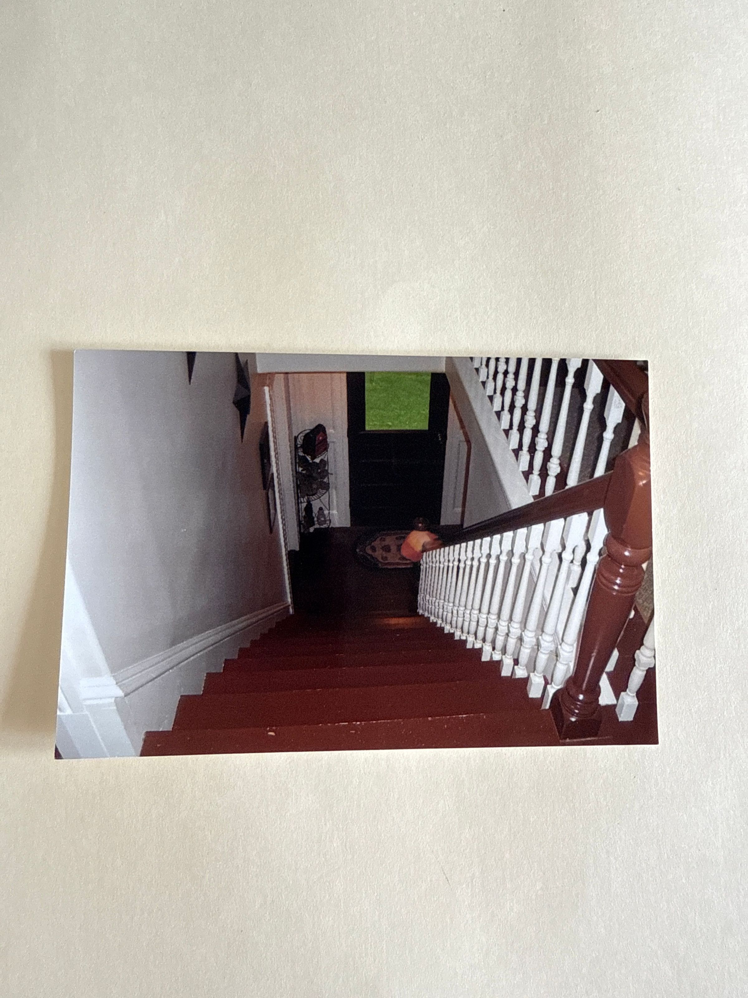 colored photo 4"h x 6"w of 972 Main Road, former home of Henry marion Coombs, currently owned by Craig Leach (July, 2012). View down staircase to front door and along upper hallway.