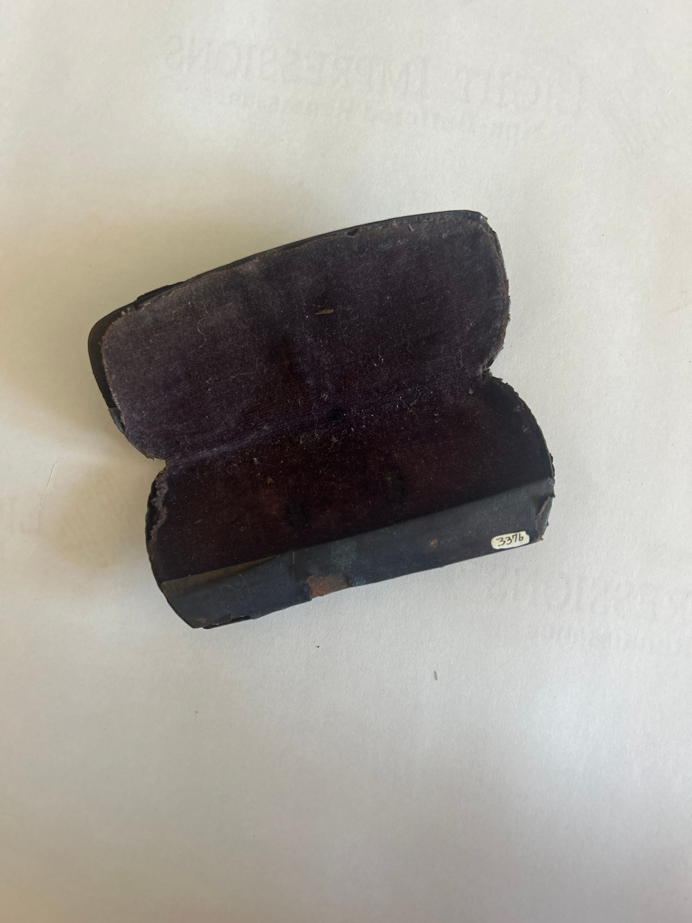 4 3/8 inches x 1 7/8 inches x 3/4 inch. Brown leather covers metal case. Opens at hinged long end. Lined with purple velvet. Original Inscription: L.K. Austin M.D. Waterville ME