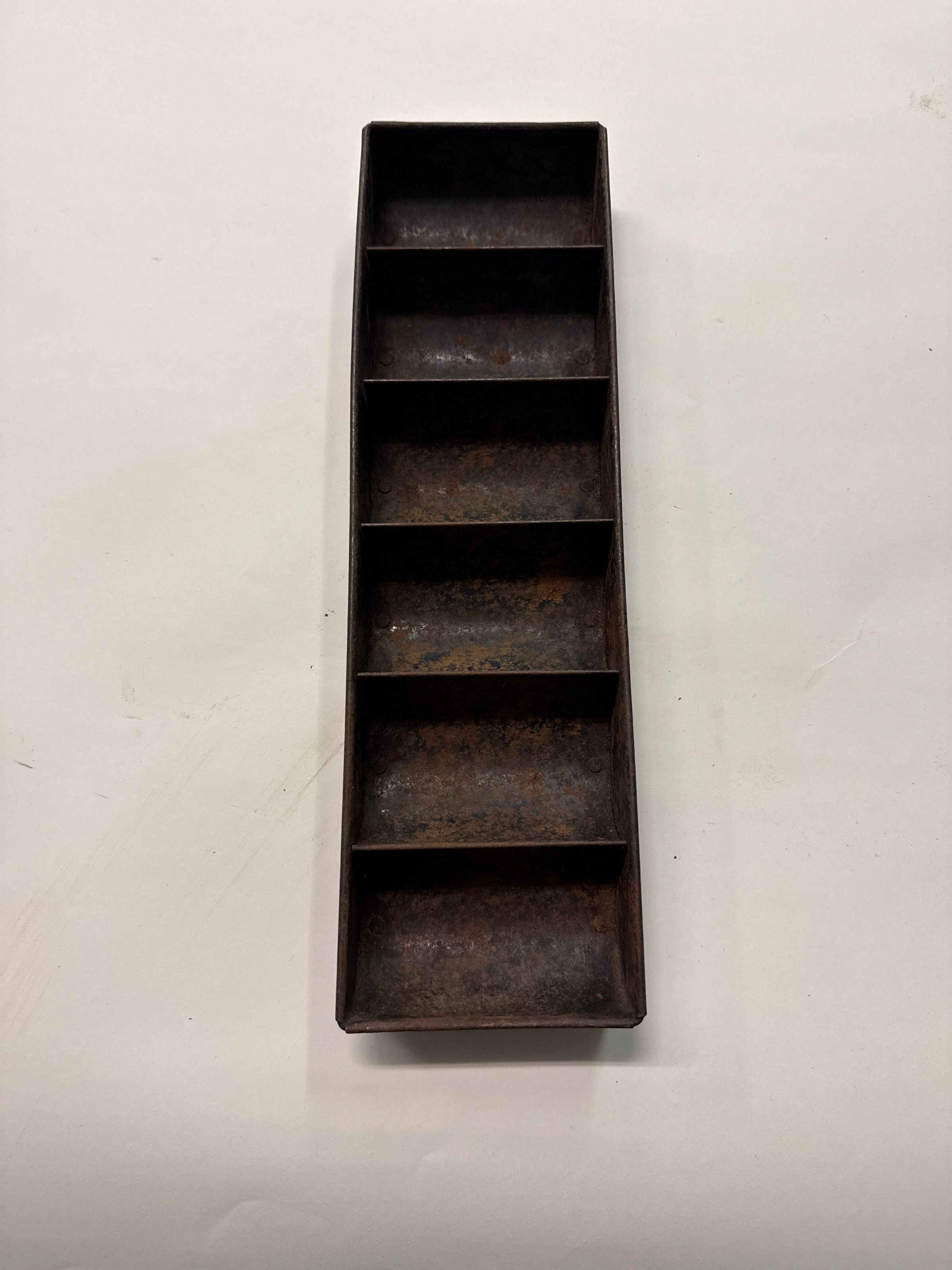 13 inches x 3 3/4 inches x 1 1/2 inches. 6 half-round metal pieces are held together on the long sides by rivets. The top edge is rolled.