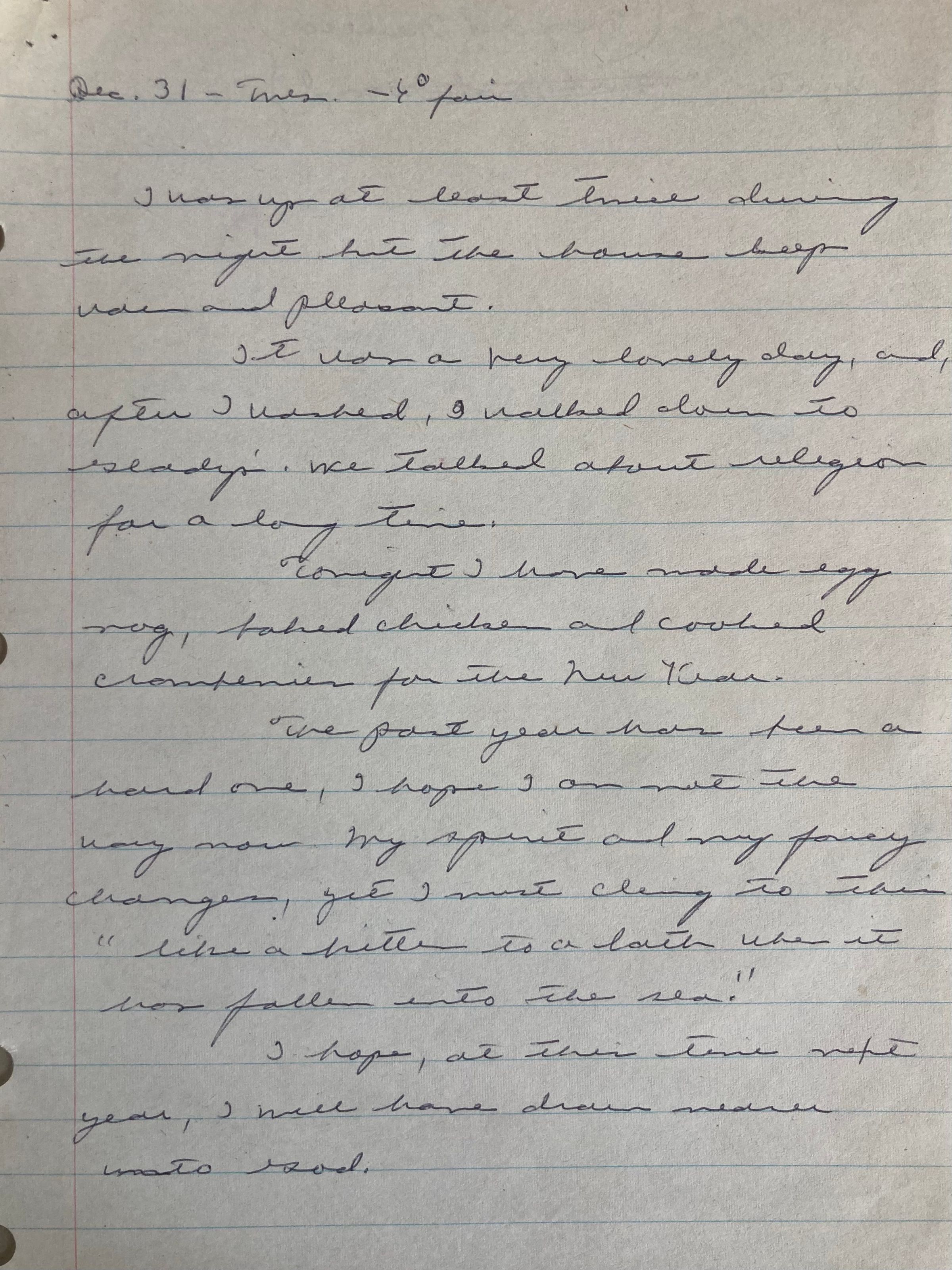 "The past year has been a hard one, I hope I am not [here?] many [more?]. My spirit and my family changes, yet I must cling to [this?] 'like a kitten to a lath when it has fallen into the sea.' I hope, at this time next year, I will have drawn nearer unto God."