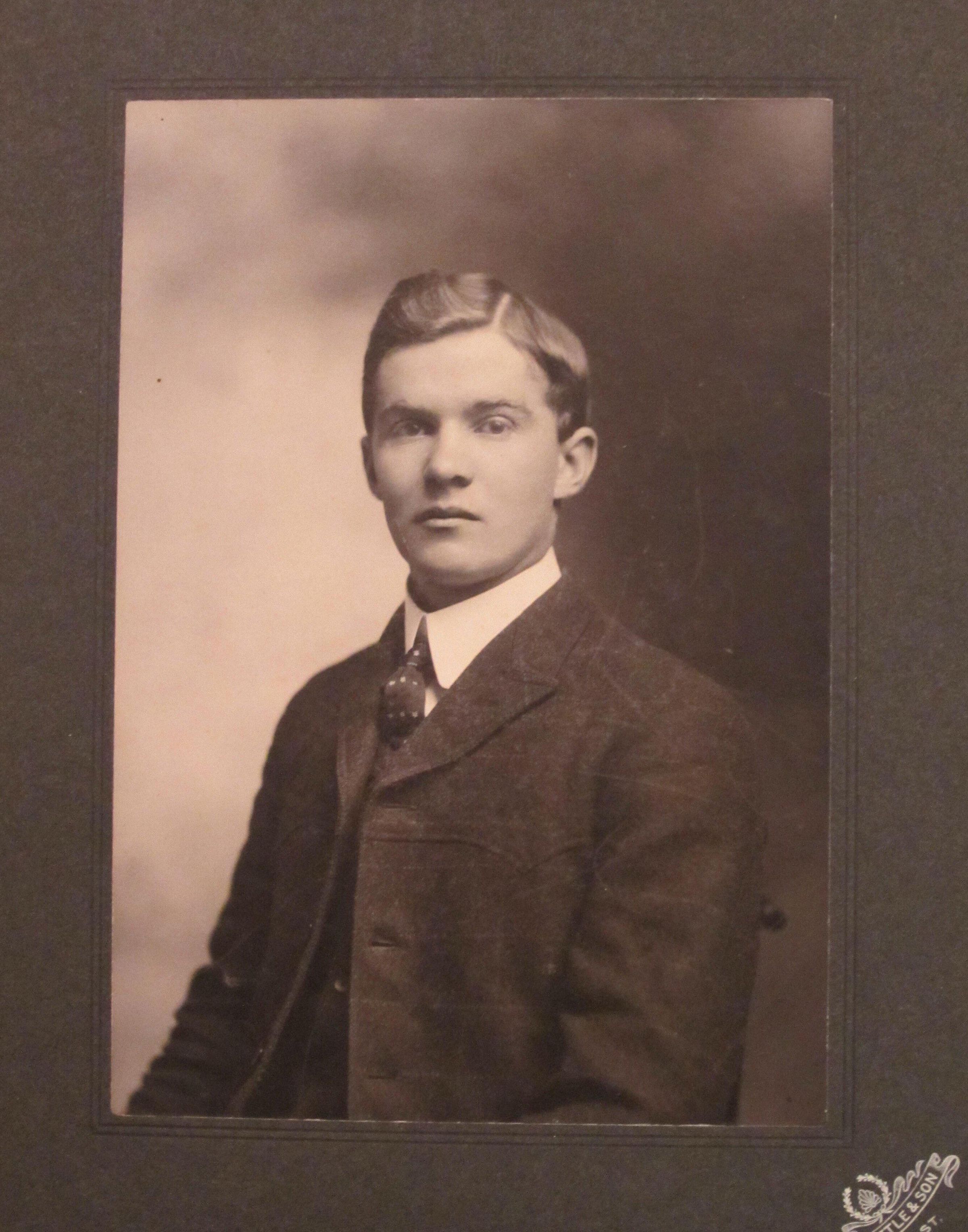 4" x 5.6" photographic portrait of a young man mounted on dark gray 5.75" x 7.75" mat, taken by Tuttle in Belfast, ME. On back he is identified as Walter Adams, possibly Walter N listed in Farrow as son of Nathan G Adams and Angeline Keller (p. 166).
