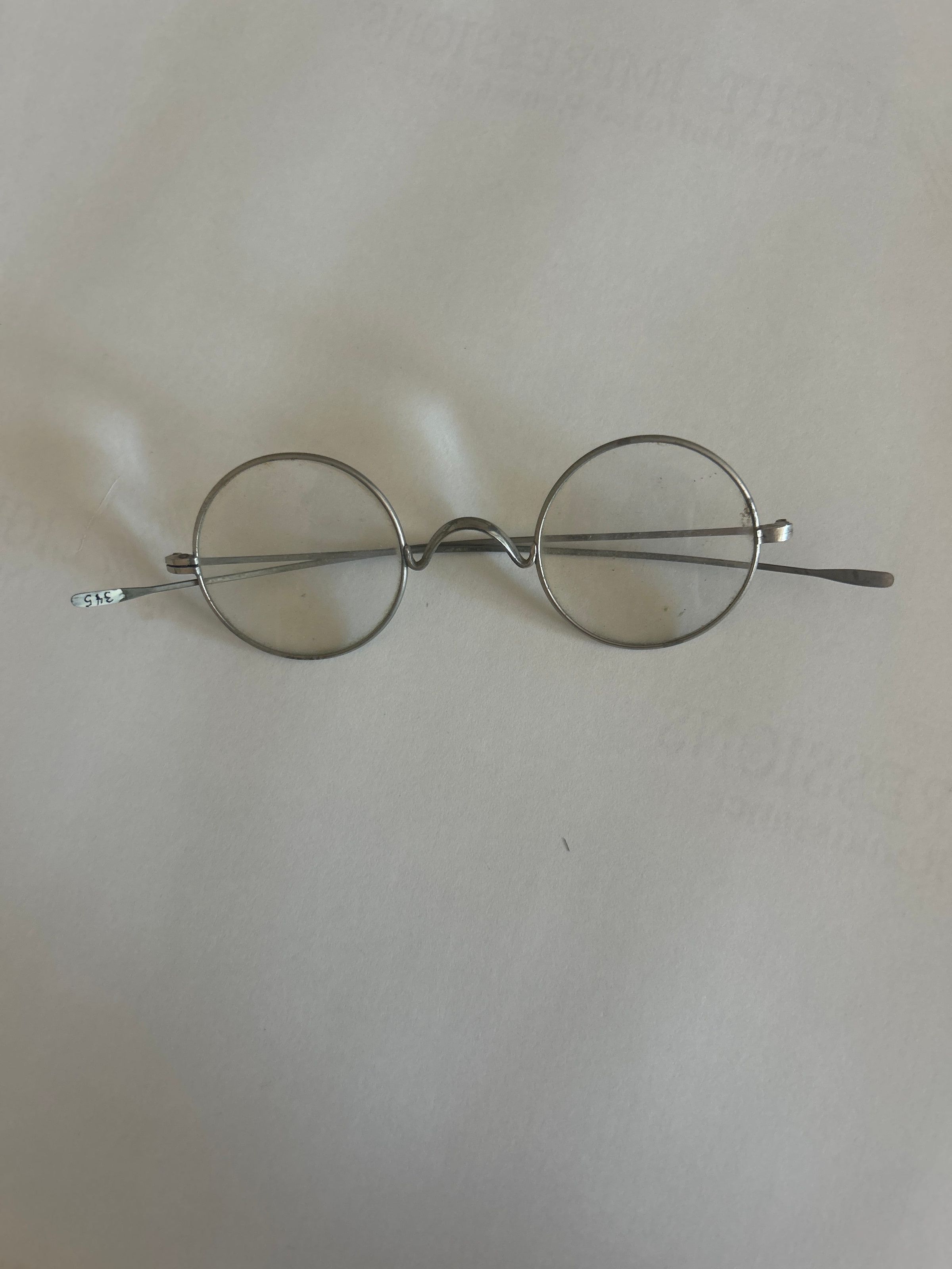 4 5/8 inches x 1 5/8 inches frame. 5 1/4 inches stem. Round glass lenses in wire frames.