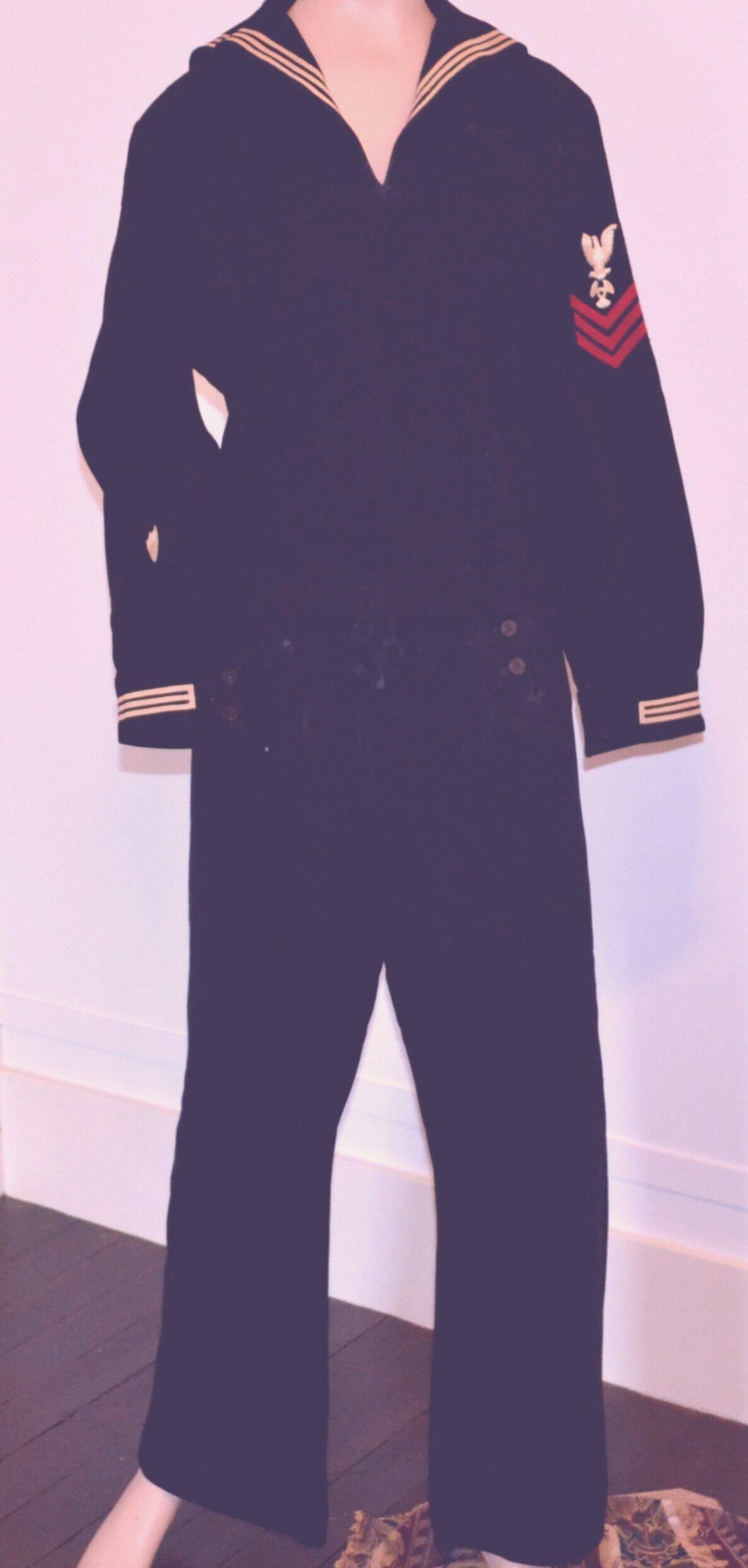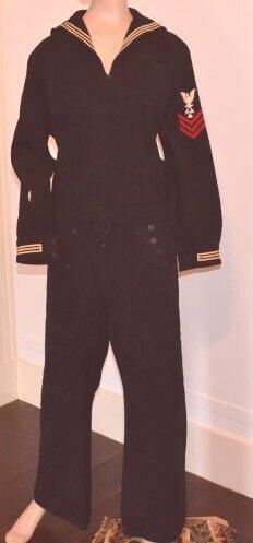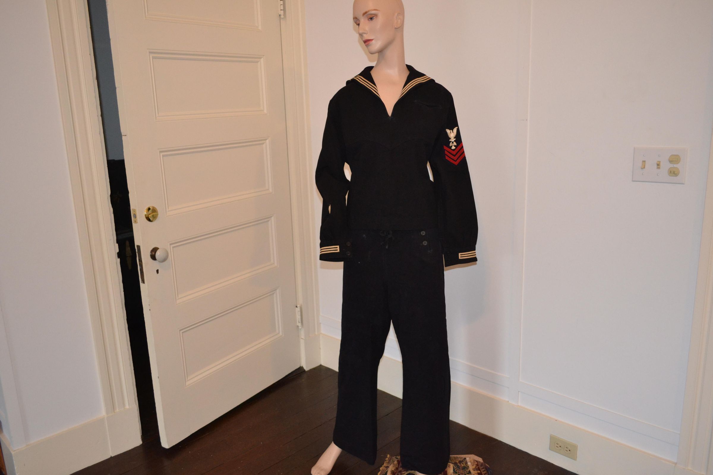 Coast Guard uniform of Jesse Hall Bates (5/29/1893-3/15/1972) probably WW1. Dark navy or black wool, blouse & pants, 3 red stripes on one sleeve, white anchor embroidered on other, white stripes on blouse cuffs, stars on collar. Both pieces labeled inside "United States Coast Guard"