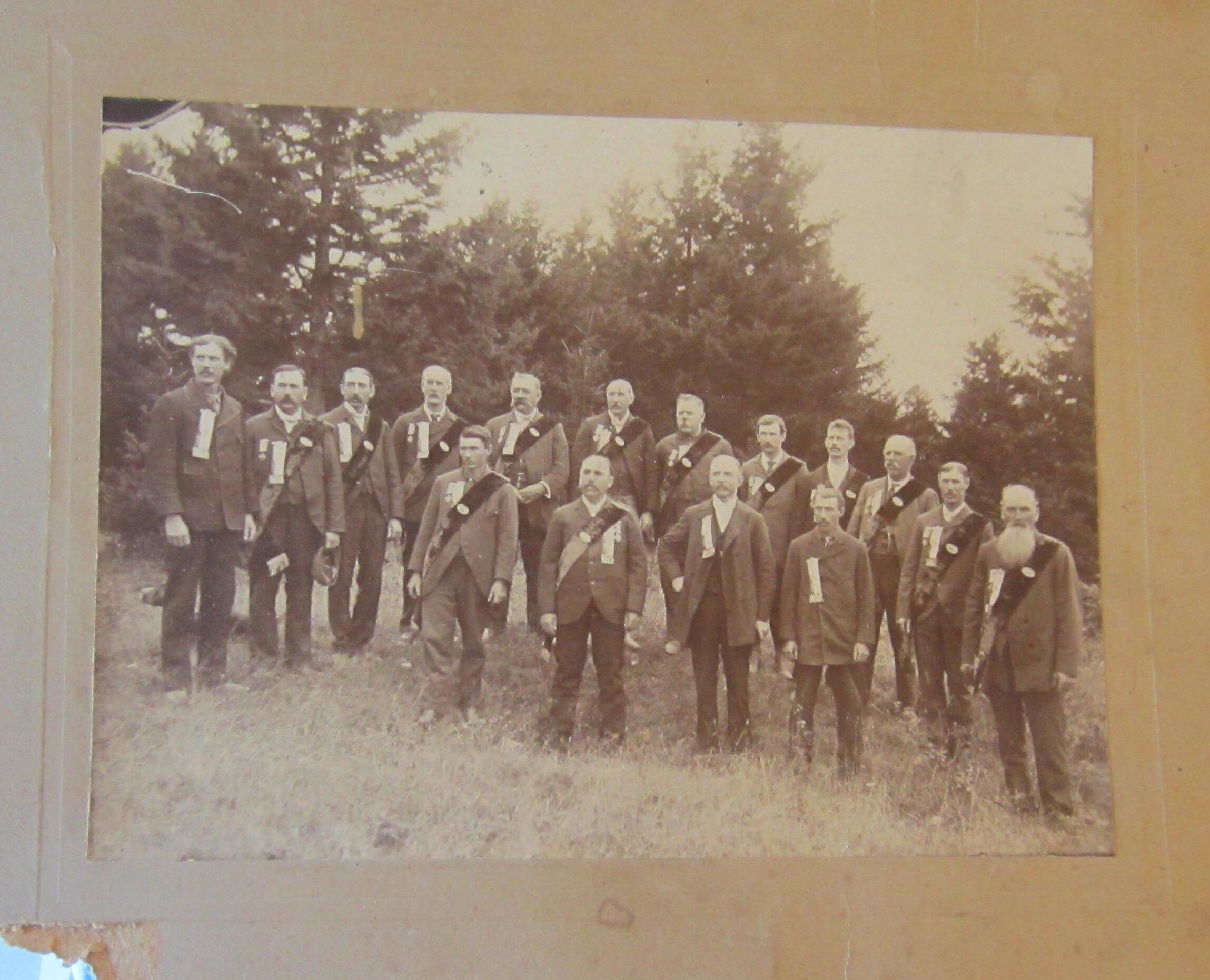 B/W photograph of 16 members of the Internal Order of Foresters, c 1890, take outdoors. The men are dressed in suits, collars, ties, vests, with sashes and badges. 7 are Pendletons (all Capt.) . All have moustaches (TRRoosevelt style) except young James F Pendleton. Found in the attic of Ben Moody's house; his grandfather, Capt D A Warren is in the group. IDs are attached, found with an earlier acquisition of the same picture. Picture is 8.25" x 6" mounted on gray cardboard 10" x 12". No indication of photographer.
